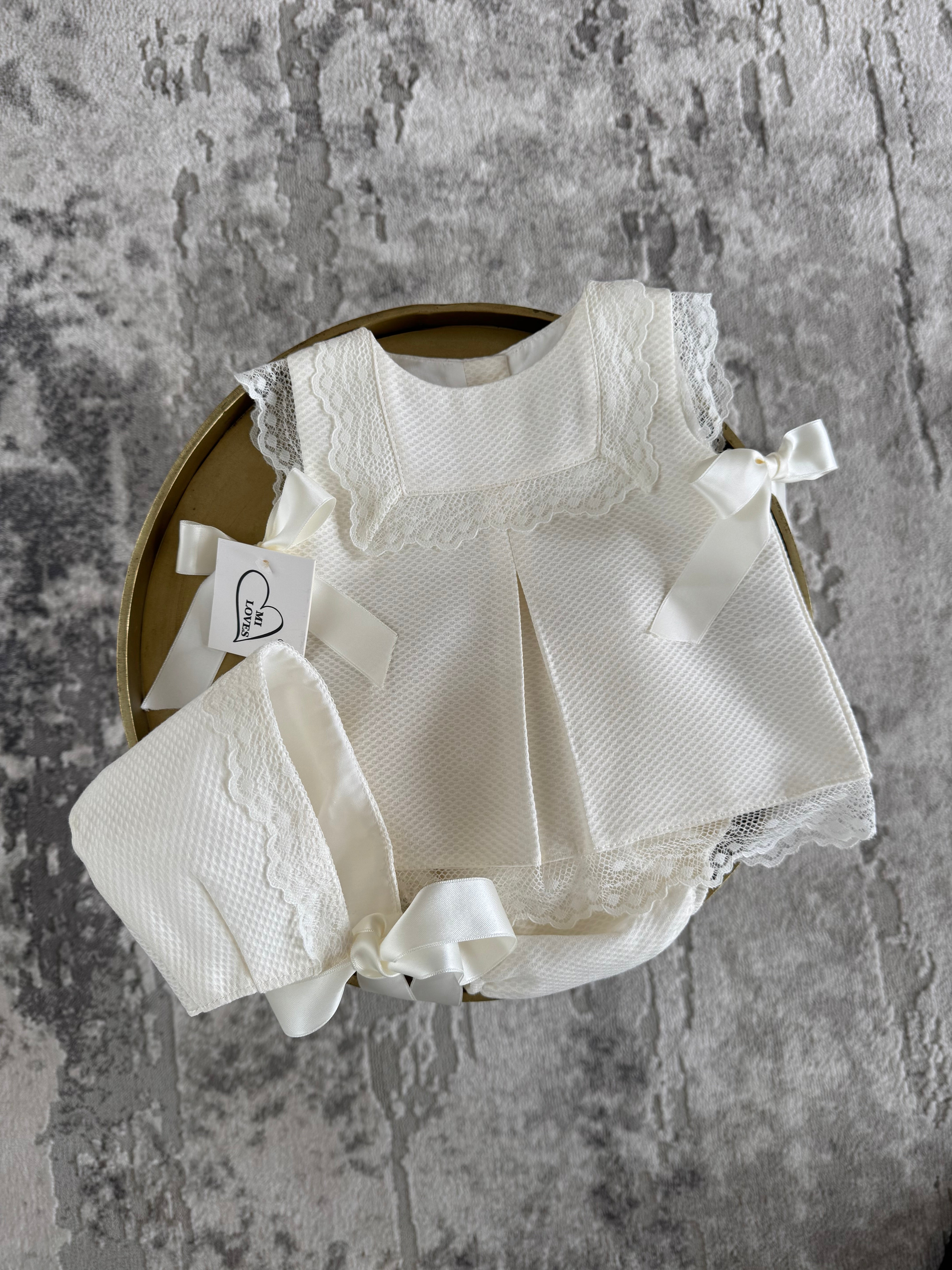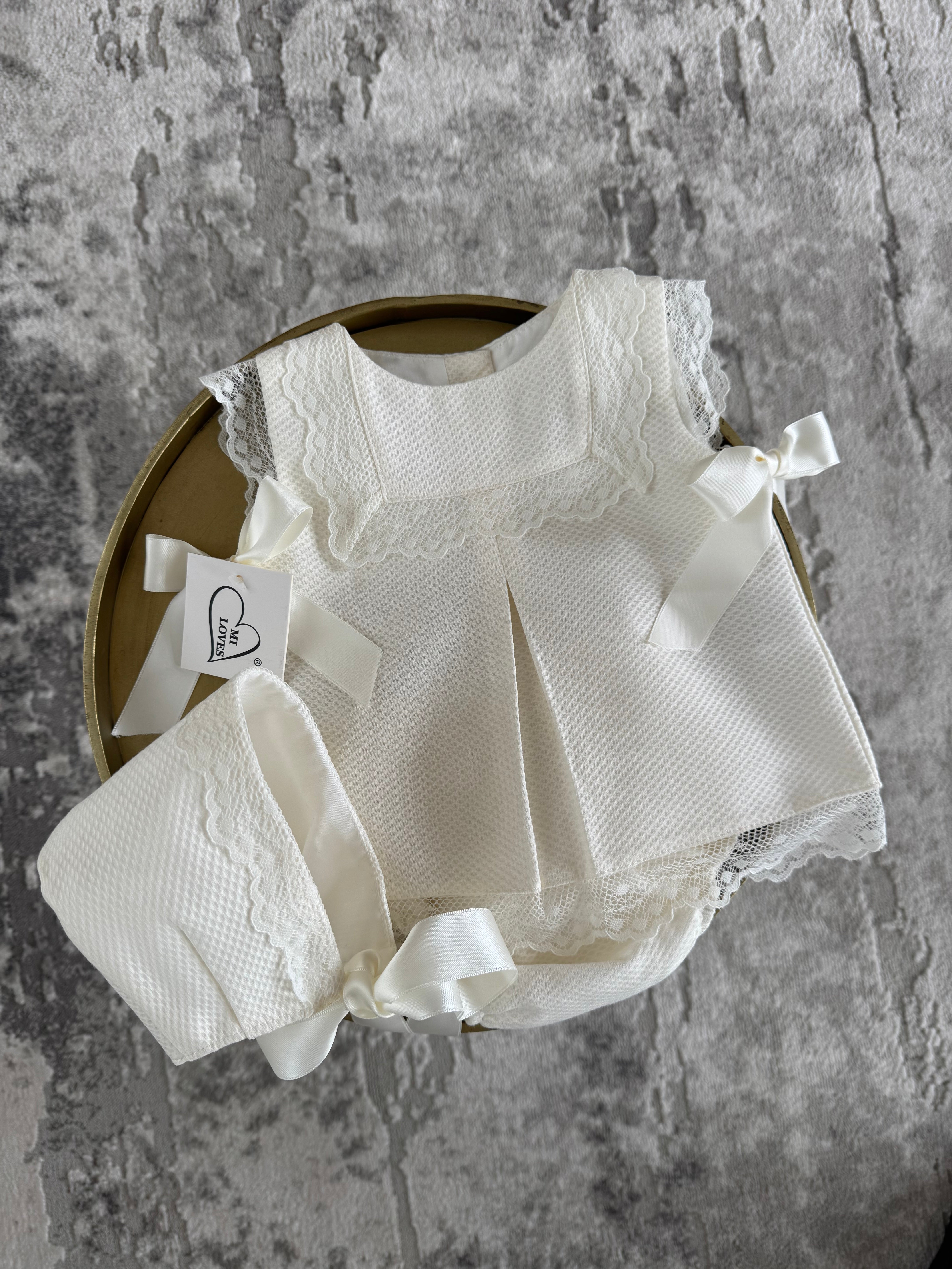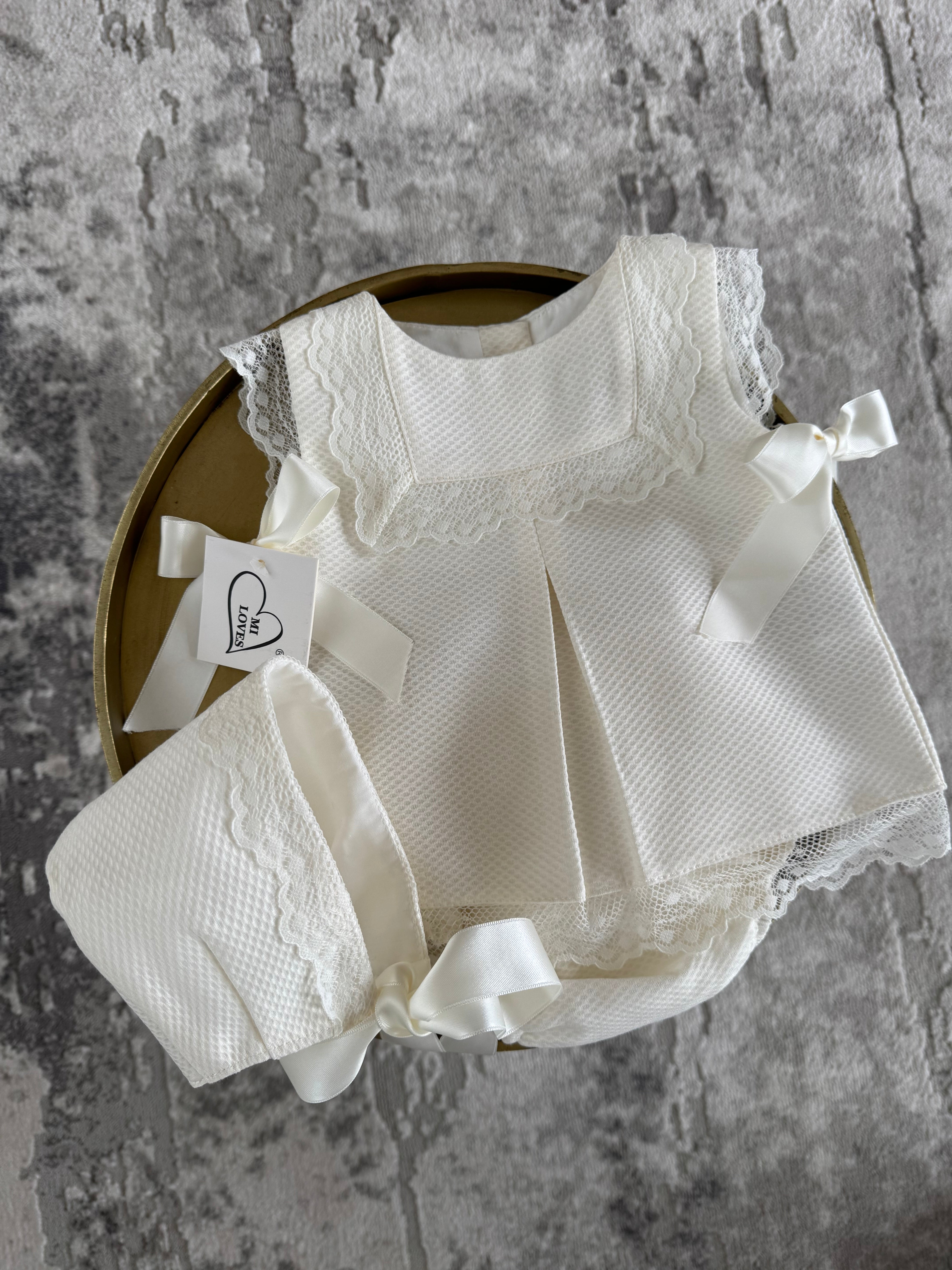 MI LOVES Ivory Dress/Bonnet/Bloomers 3 piece set with beautiful lace details
