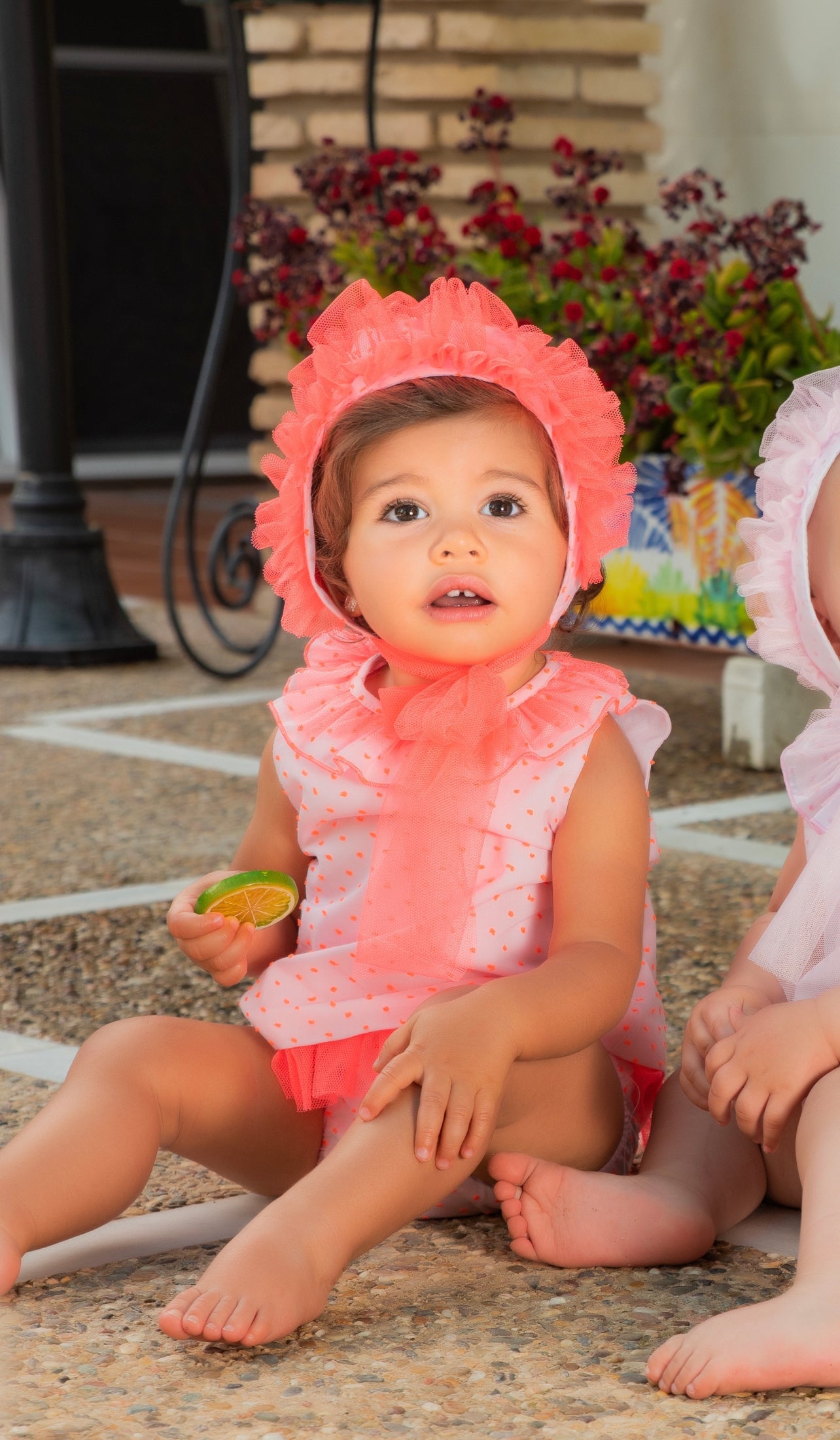 Beautiful Neon Coral Baby Girl Dress and bloomers 2 piece set with tulle frill details.