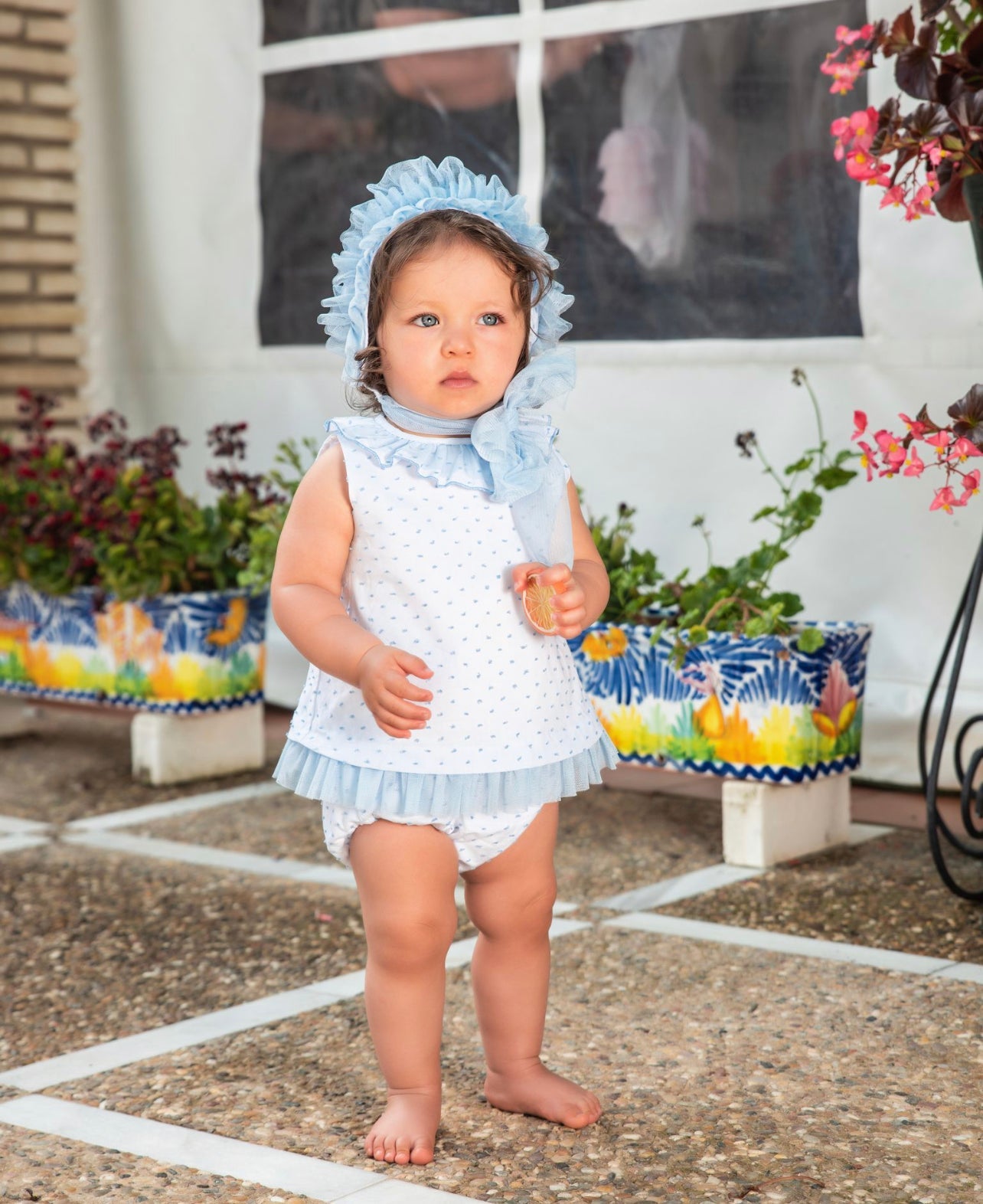 Beautiful Baby Blue Baby Girl Dress and bloomers 2 piece set with tulle frill details.
