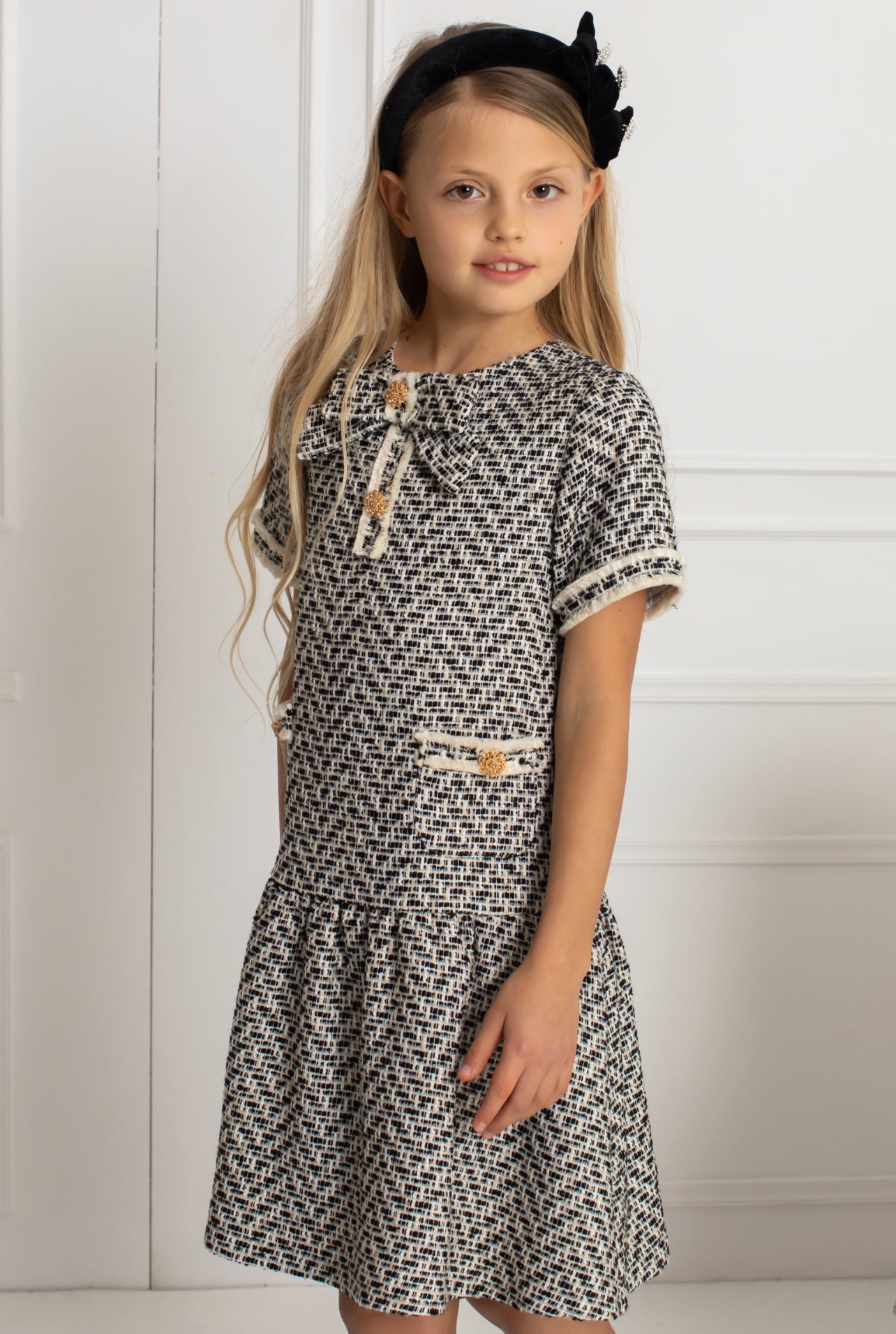 Beautiful girls Black and Ivory Tweed Dress with Bow details