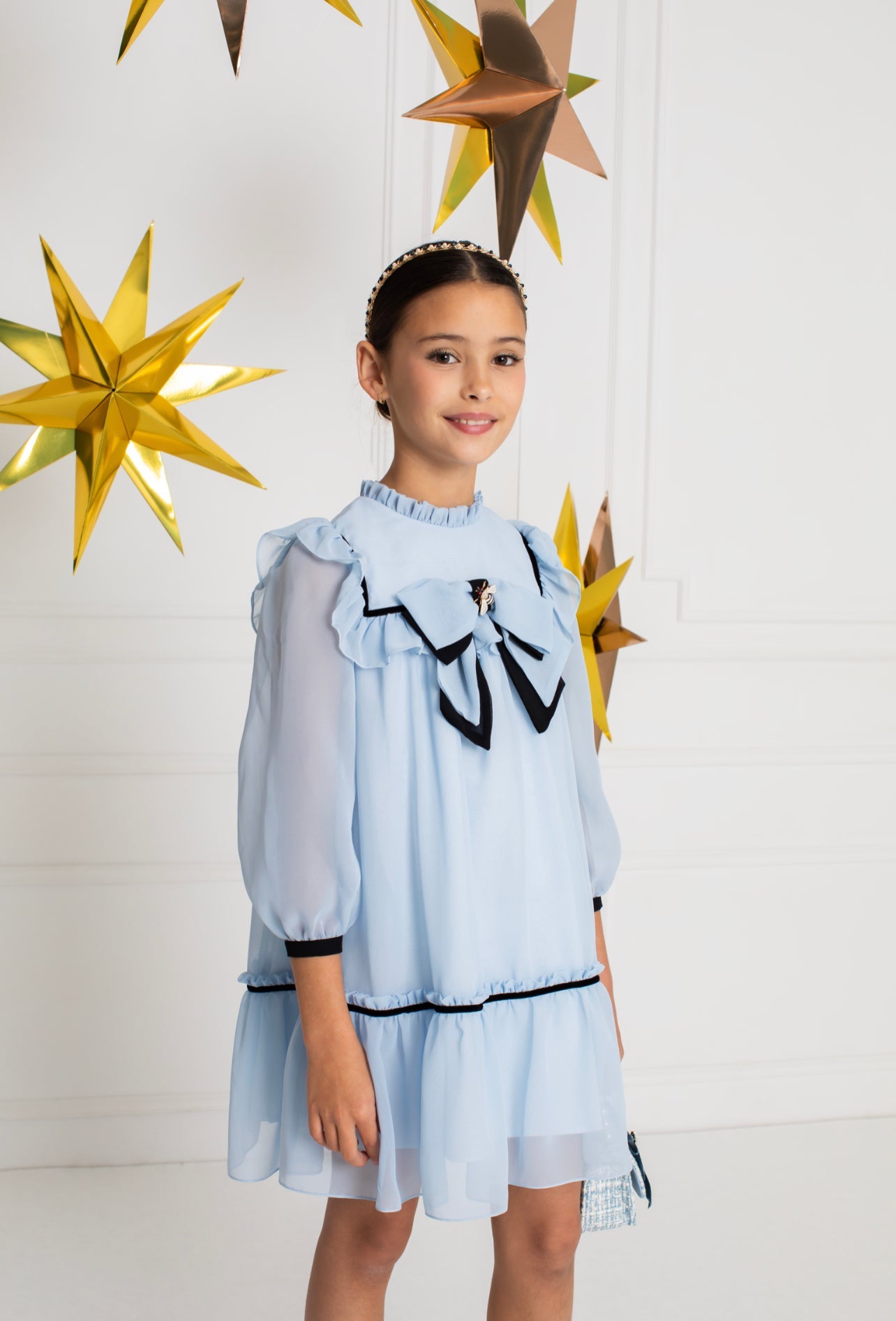 Beautiful Pale Blue chiffon dress with ruffle and Bow details.