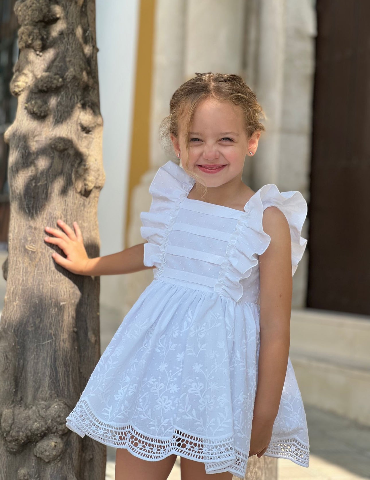 MI LOVES SIGNATURE Beautiful White puffball dress with frills and light beige bow details.