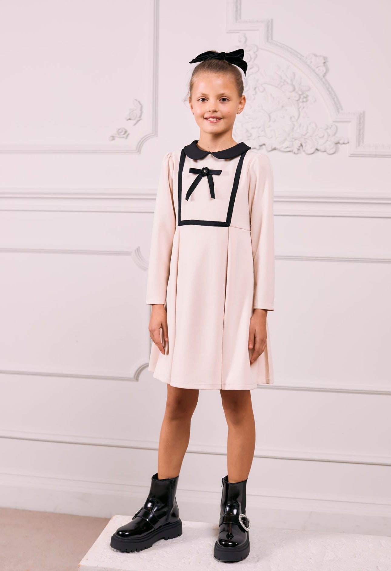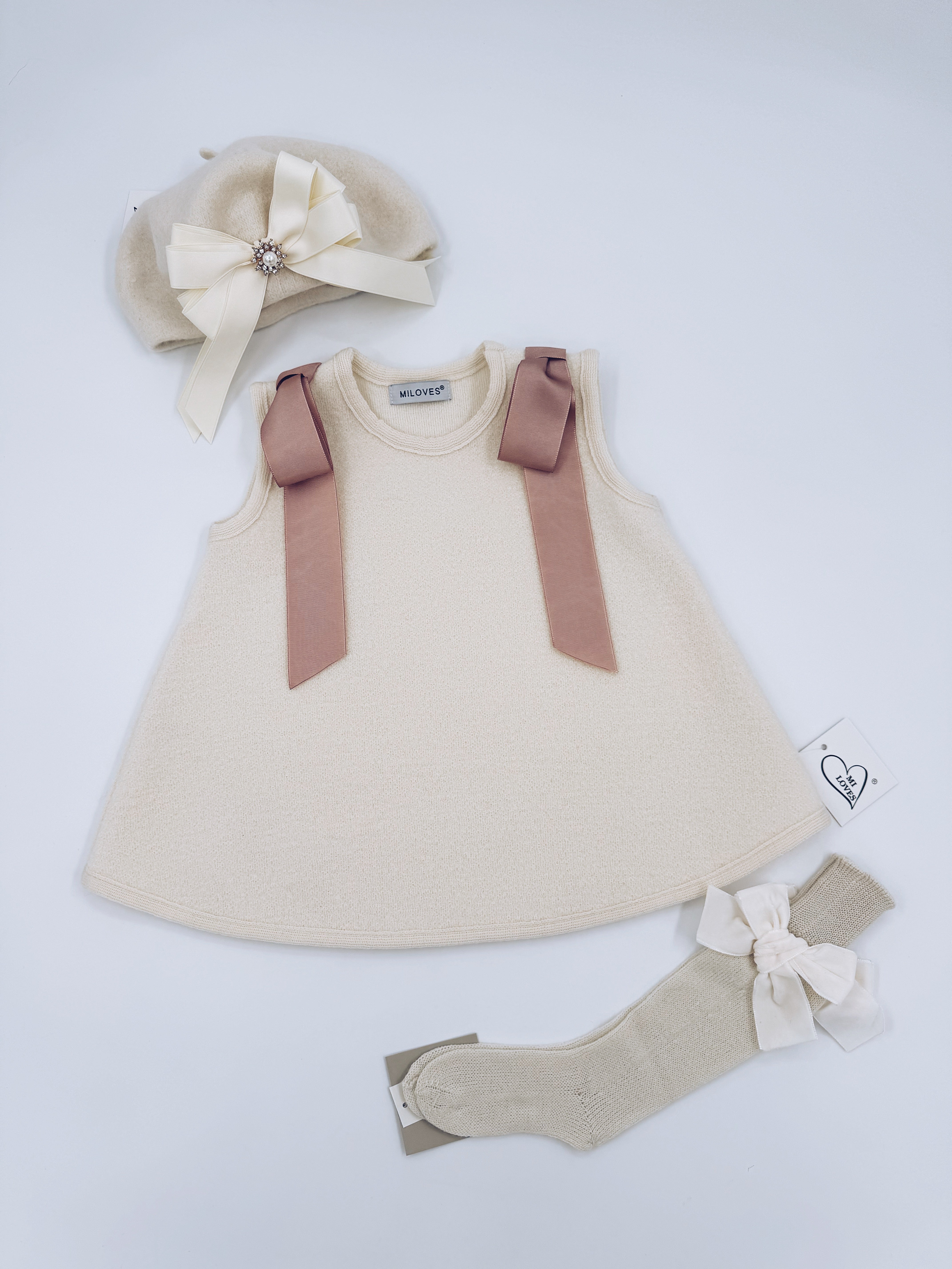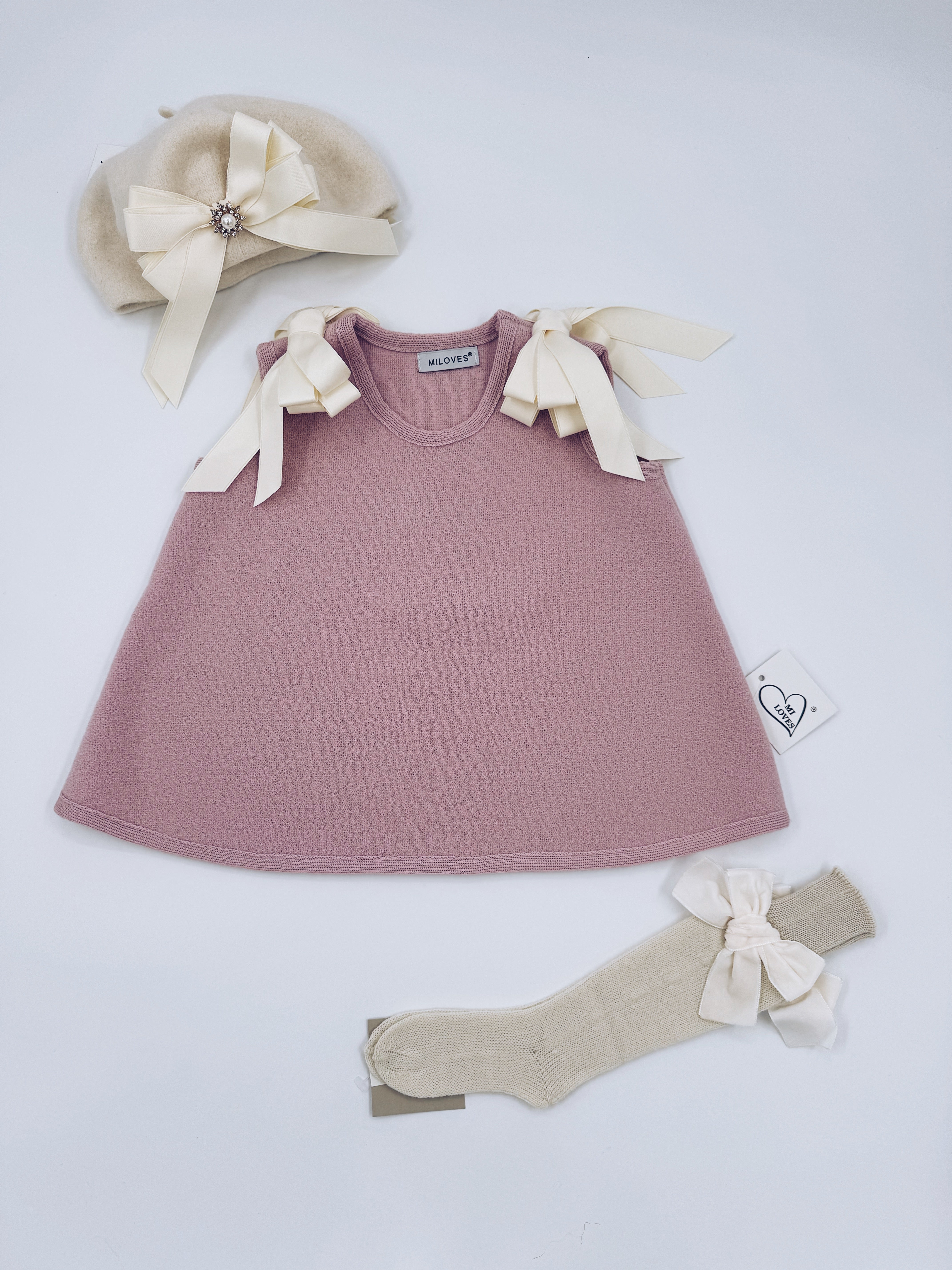 Beautiful Ivory merino wool Dress with Dusty Pink Bow details