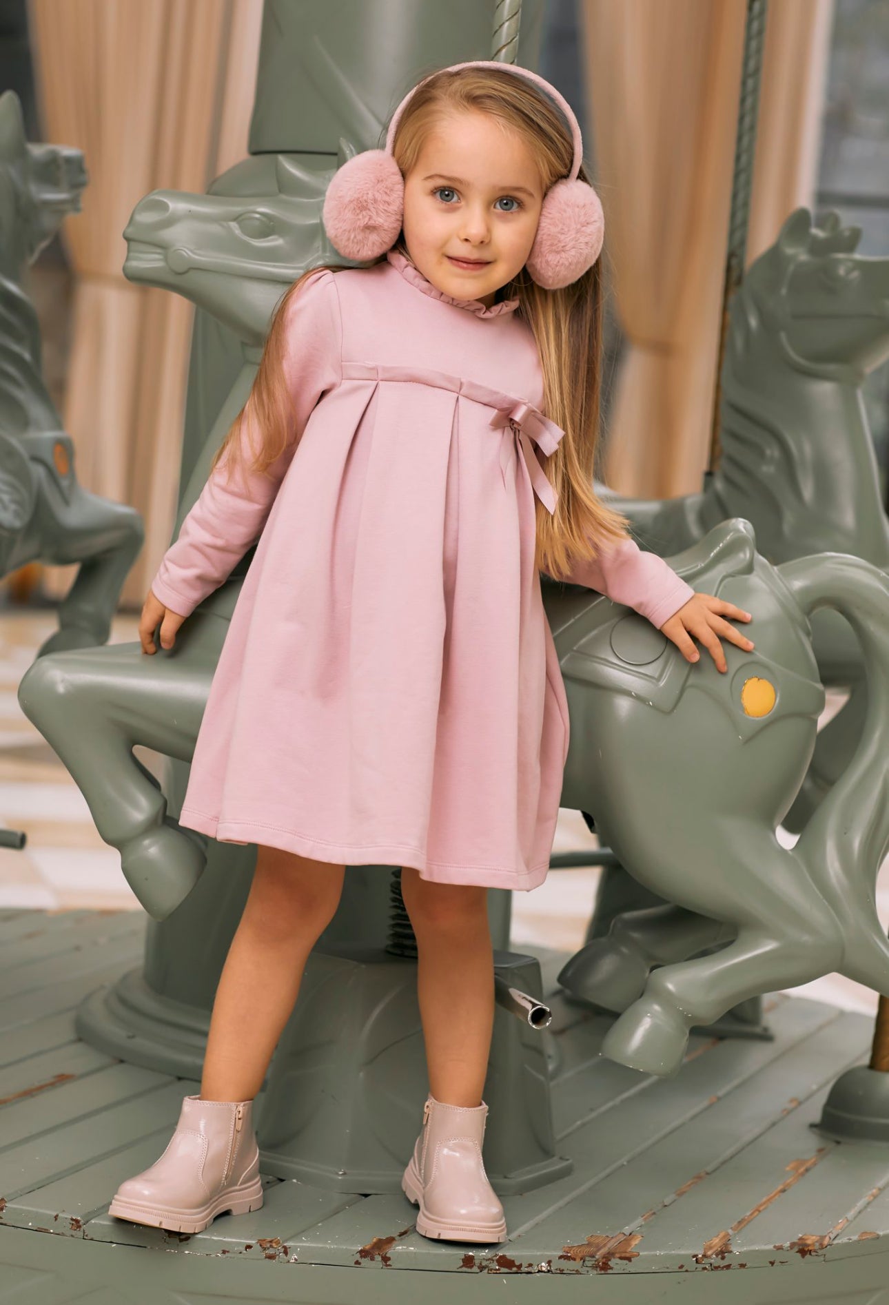 Beautiful pink merino wool Dress with Cream Bow details
