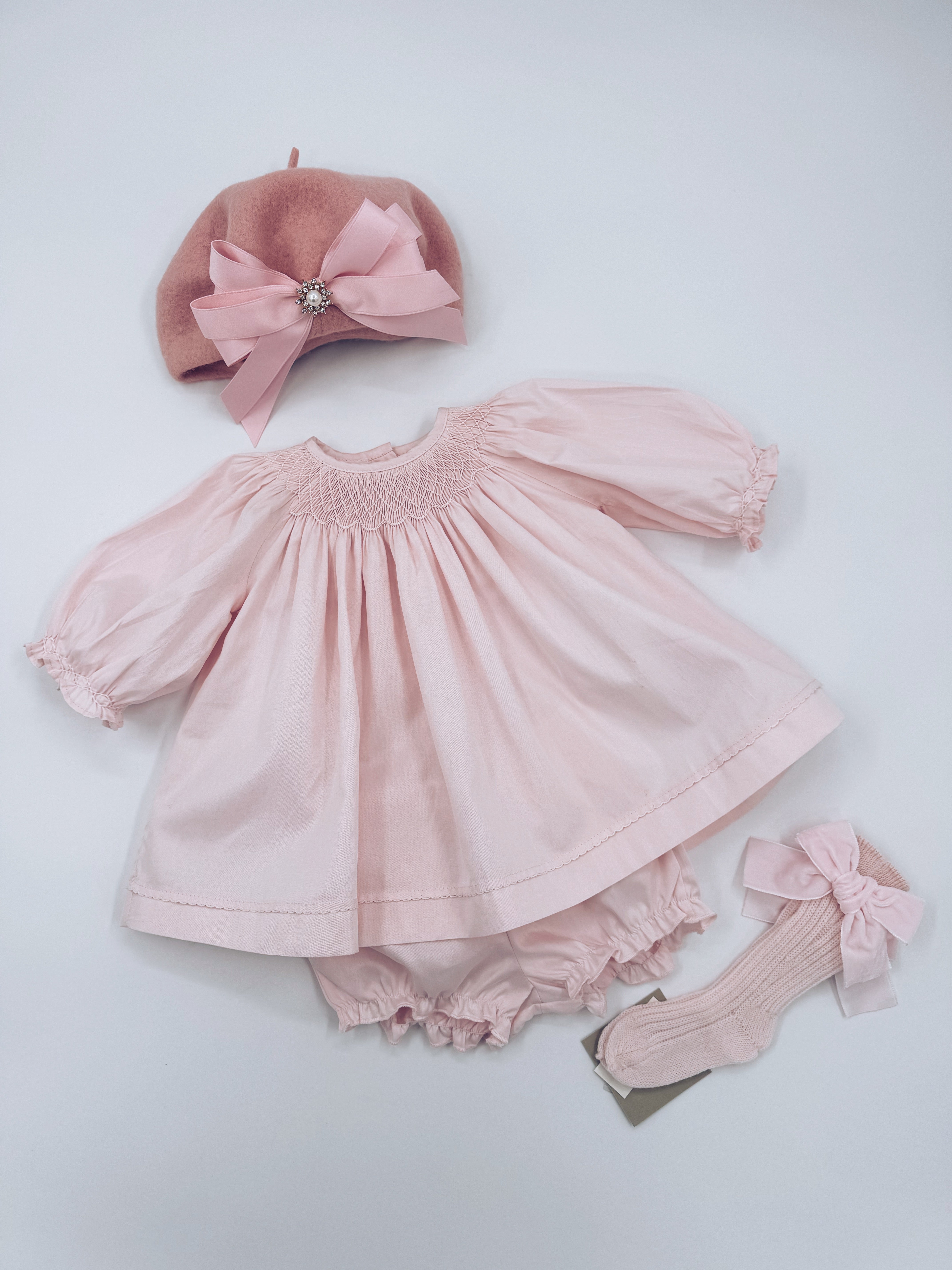 Beautiful Pink long sleeves Hand Smoked dress and bloomers 2 piece set.