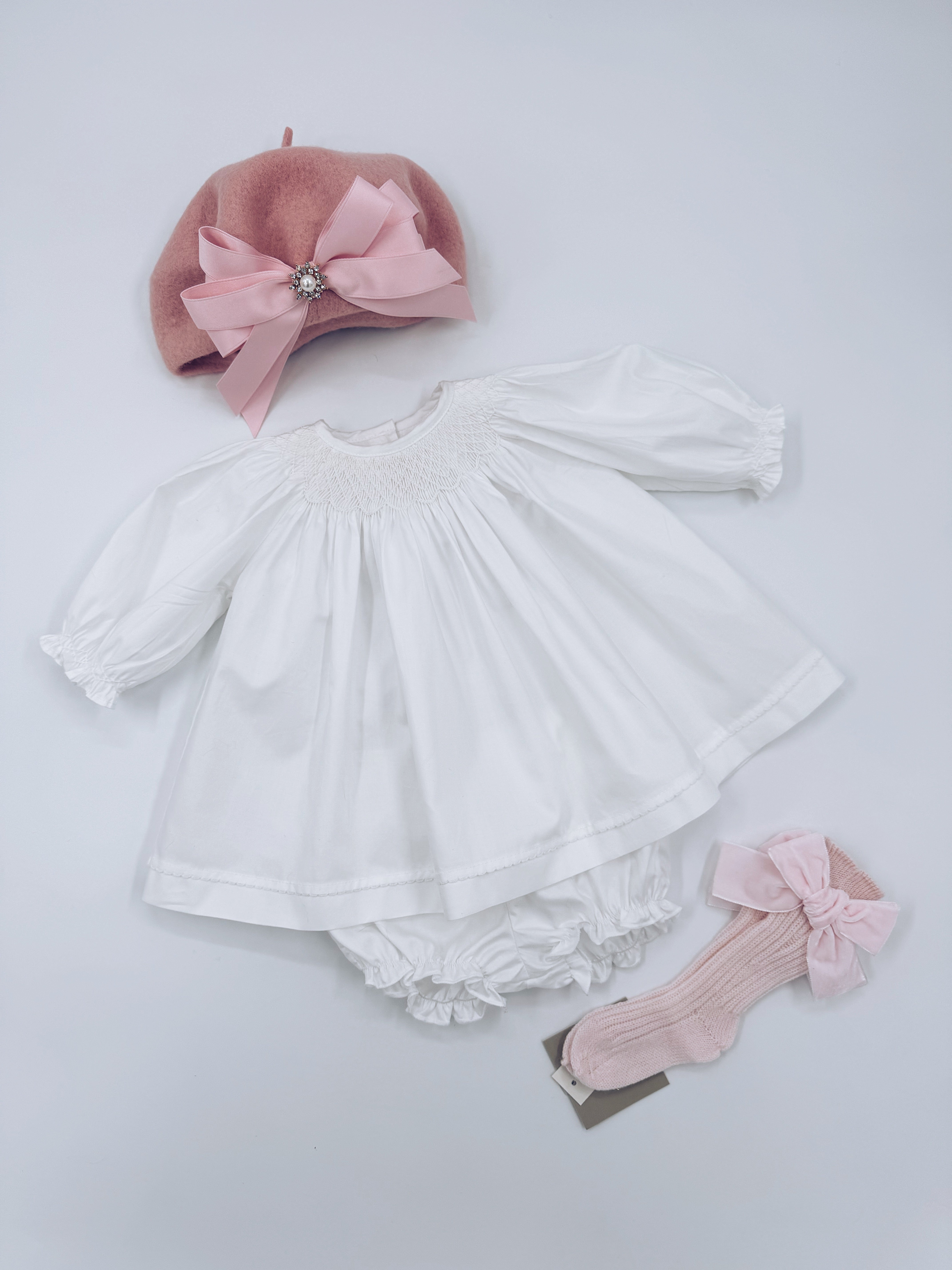 Beautiful White long sleeves Hand Smoked dress and bloomers 2 piece set.