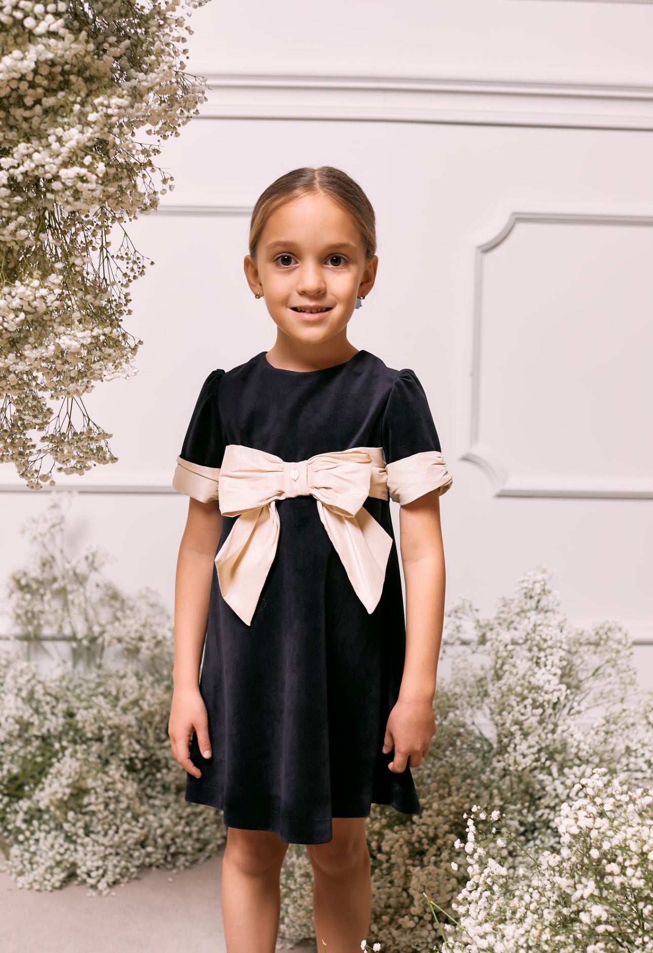 Beautiful Black velvet dress with gold bow details
