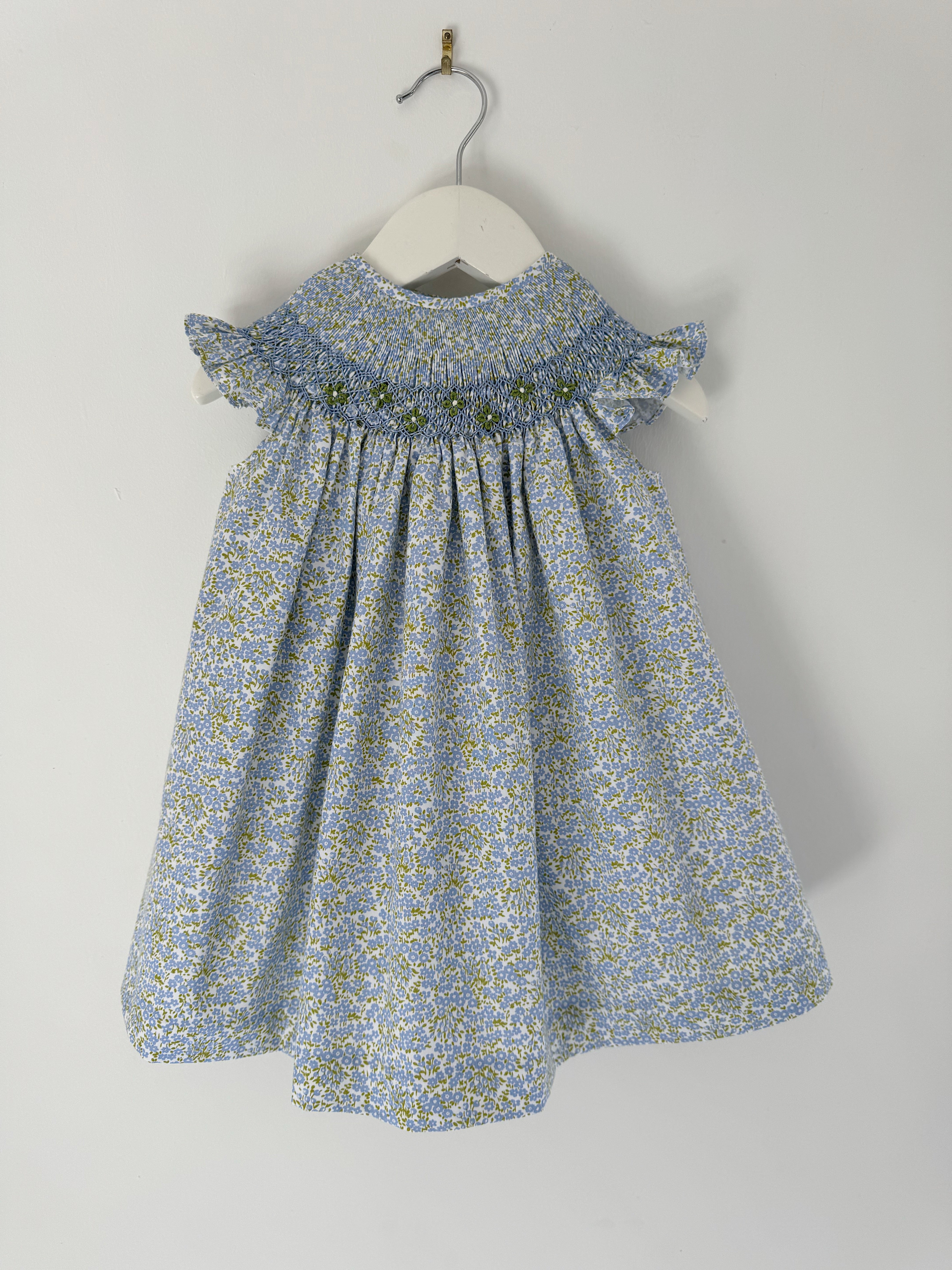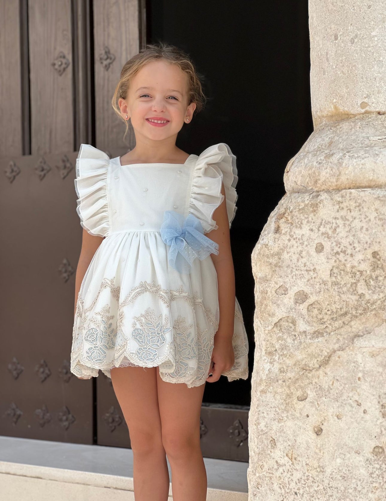 Beautiful Girls Puffball dress with lovely Lace and Blue Bow details.