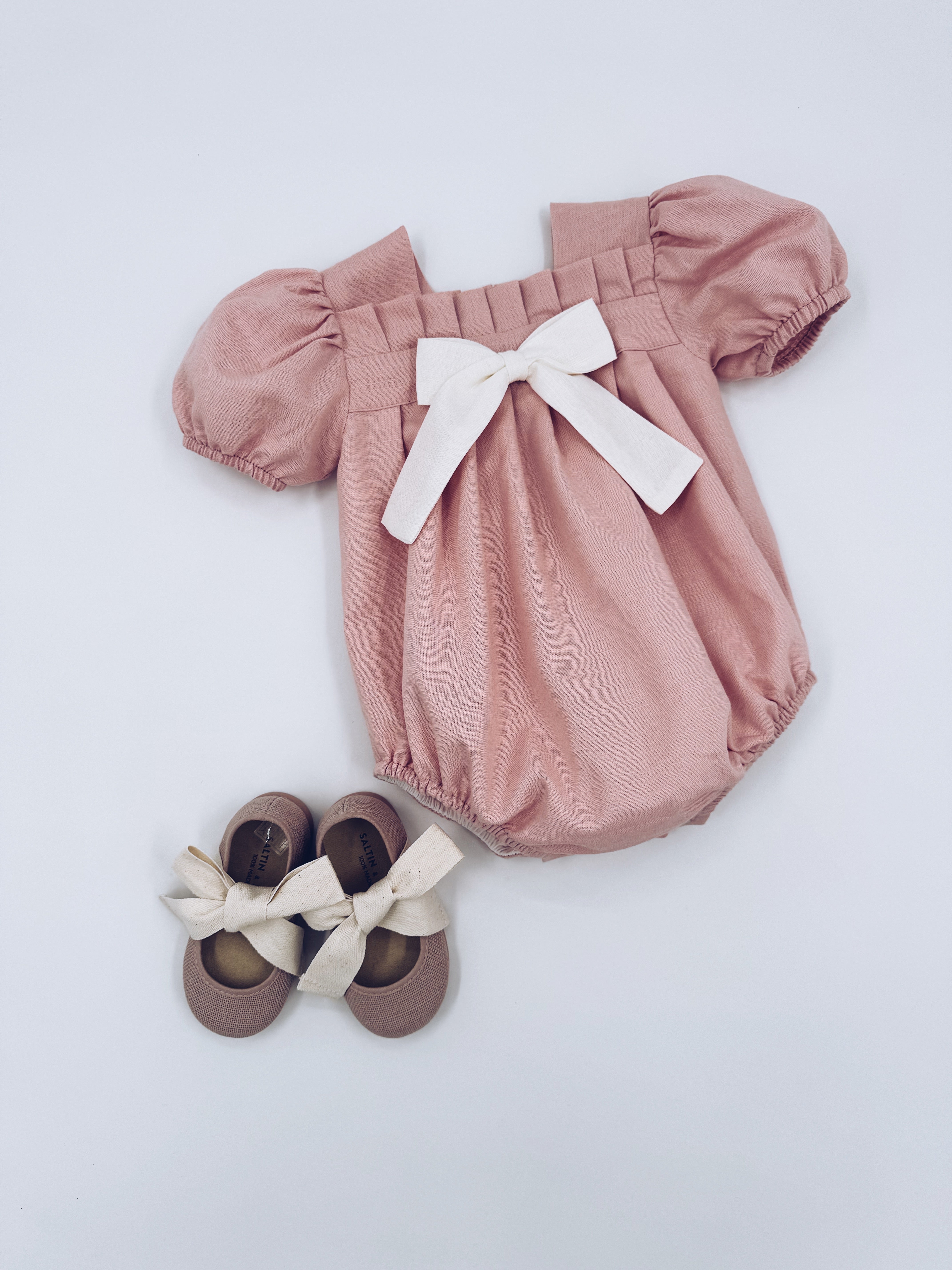 MI LOVES Dusty Pink Linen romper with puff sleeves.