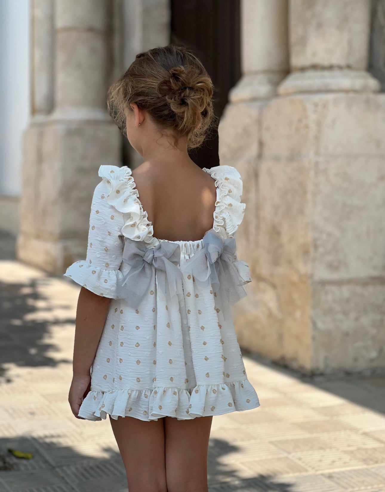 MI LOVES Ivory Linen Dress with puff sleeves.