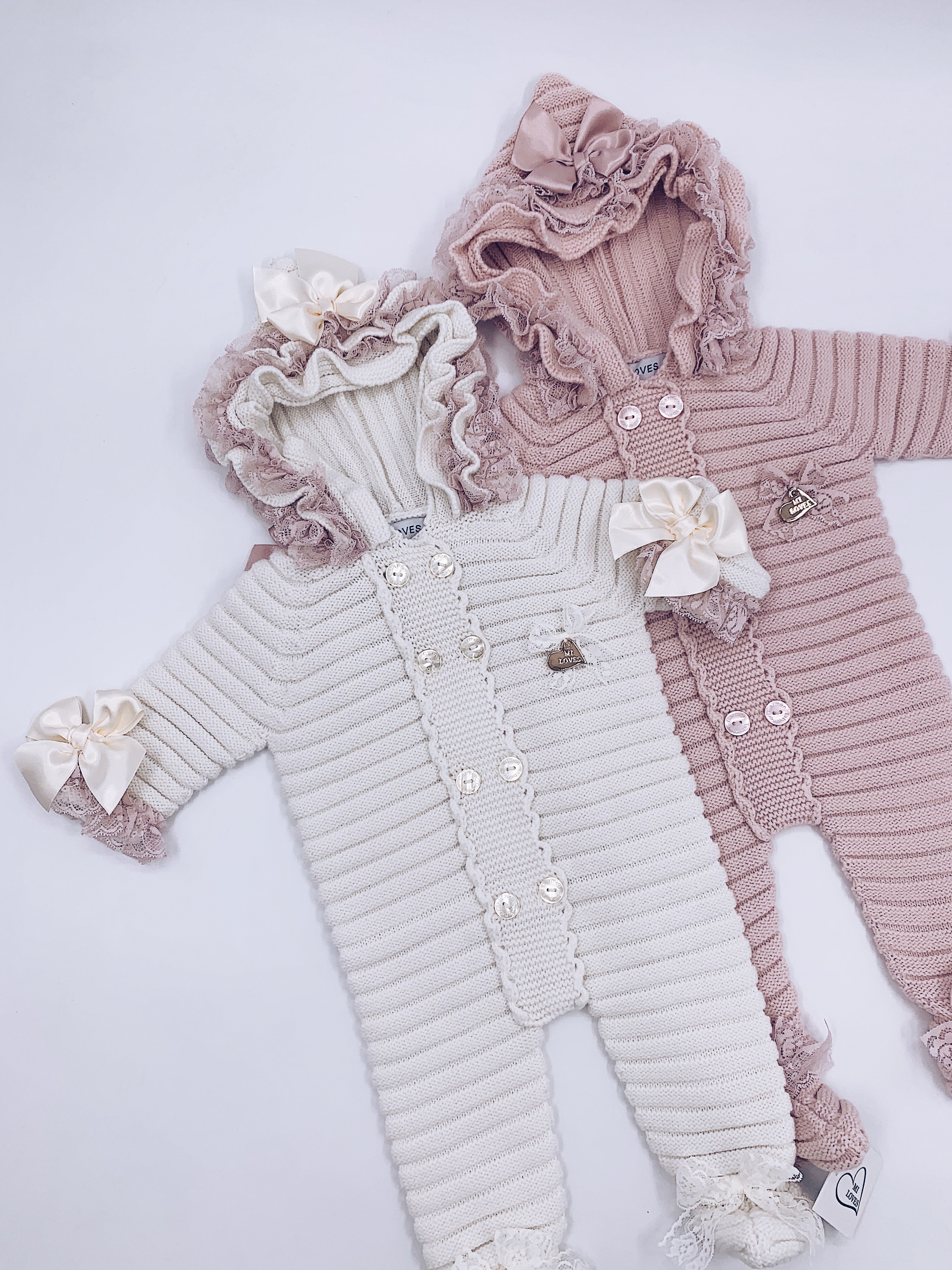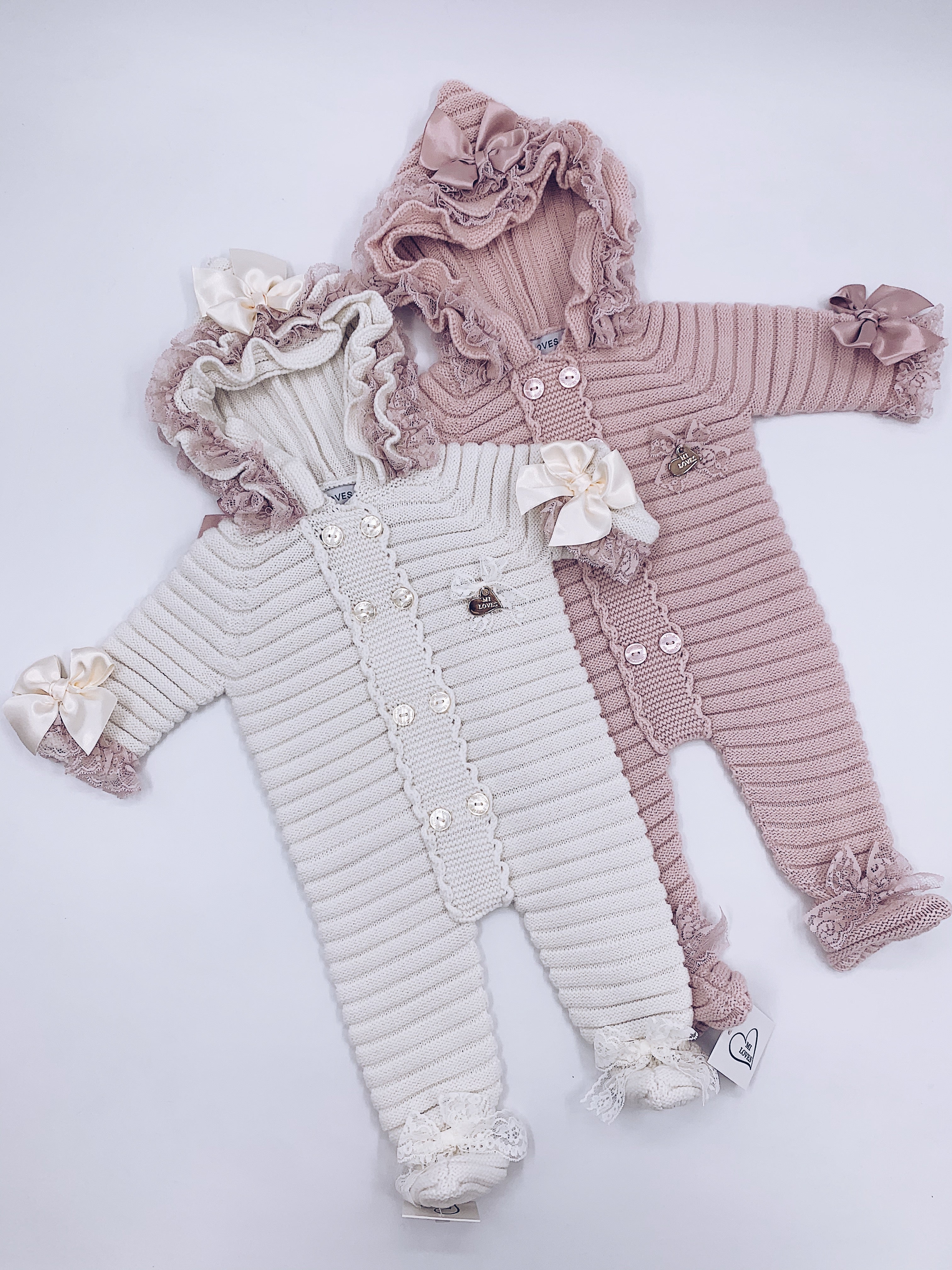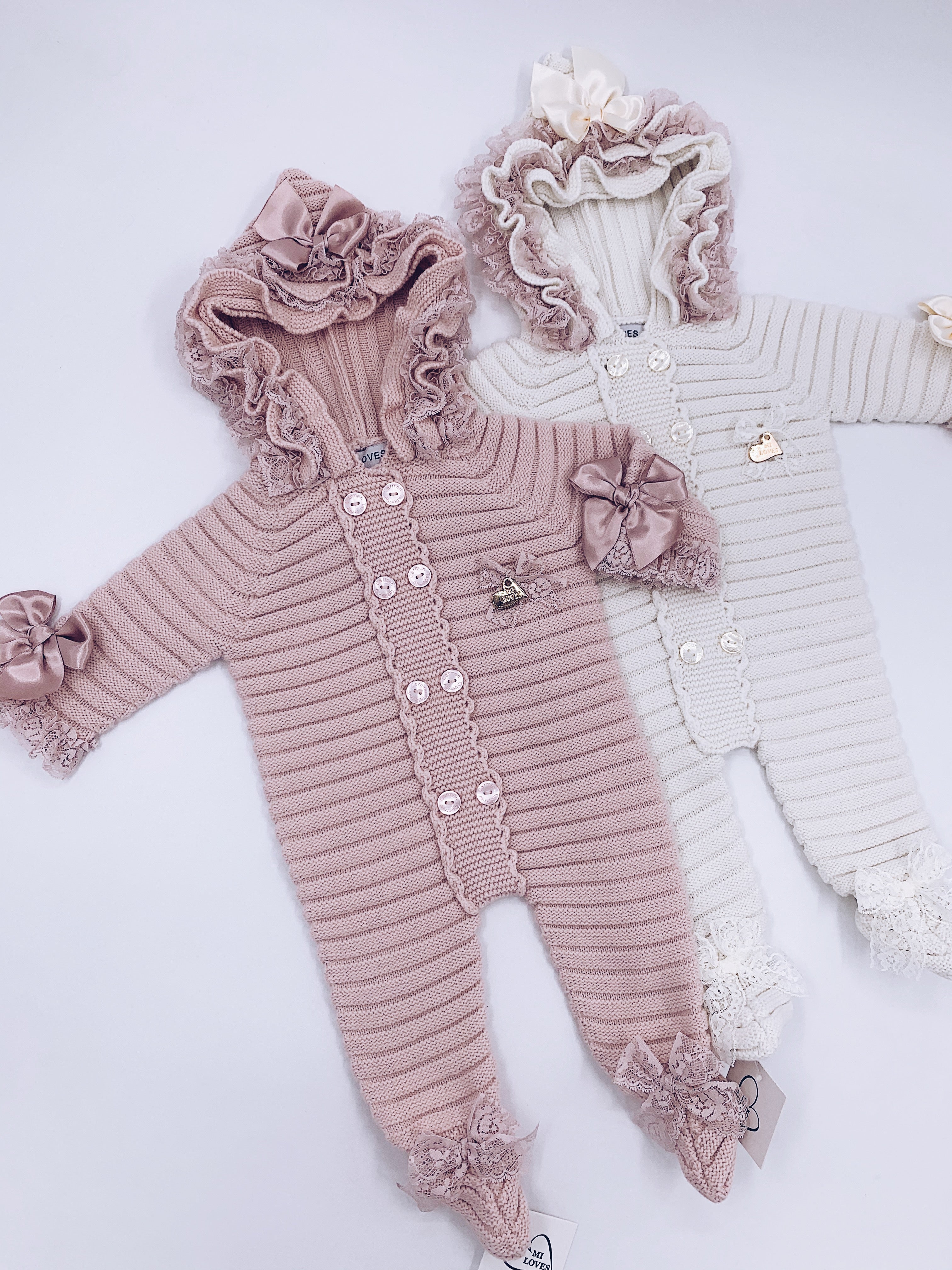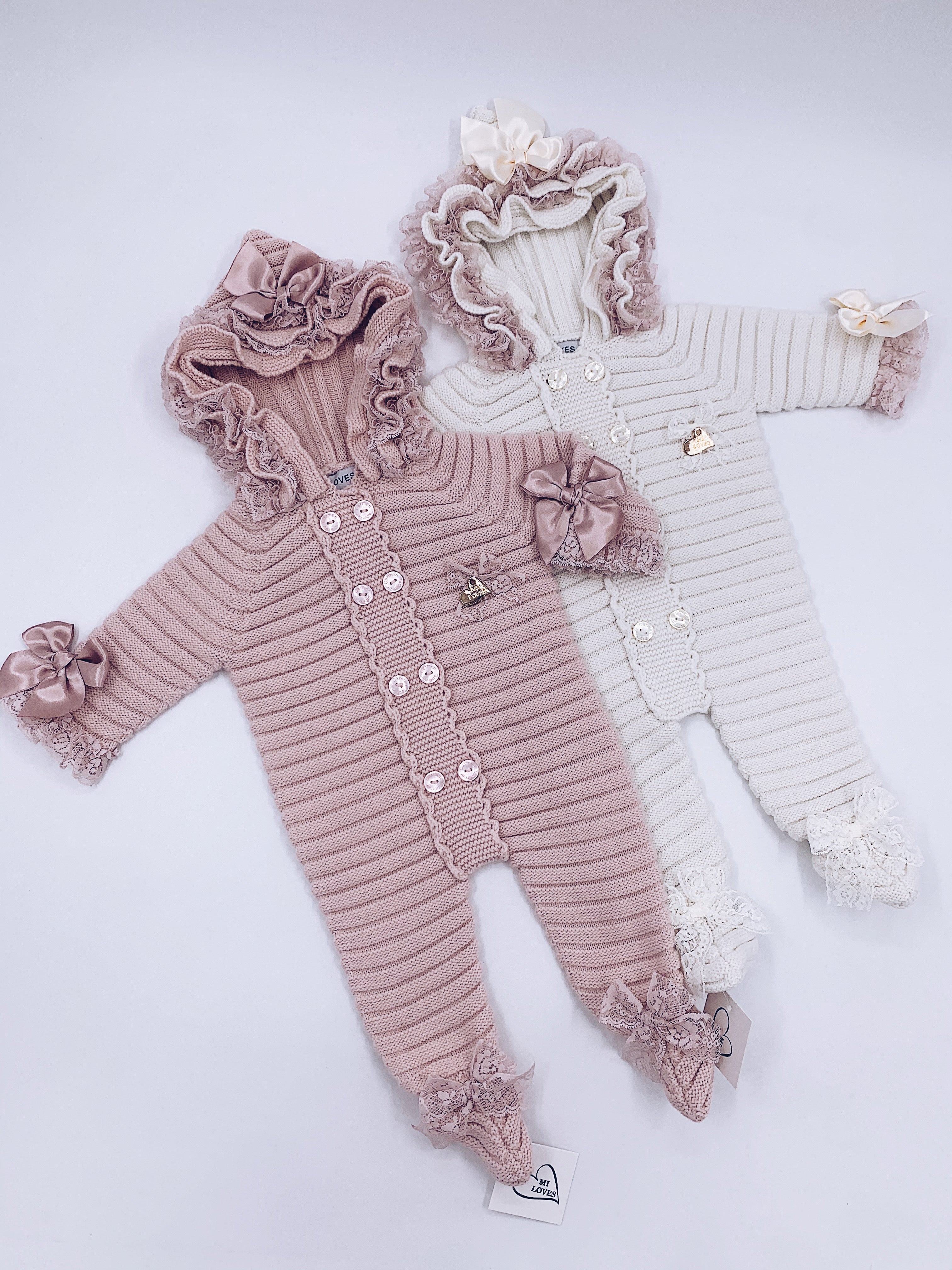 MI LOVES SIGNATURE Luxurious knitted Pramsuit with beautiful Lace and bow details