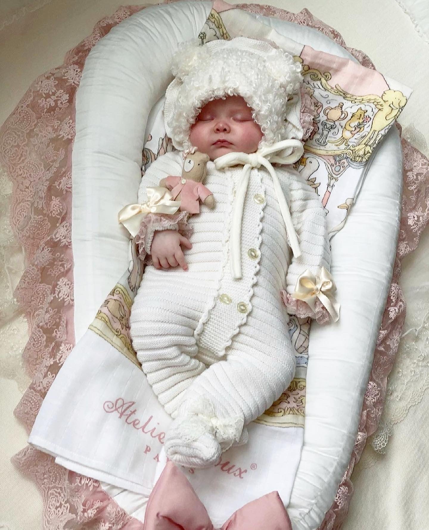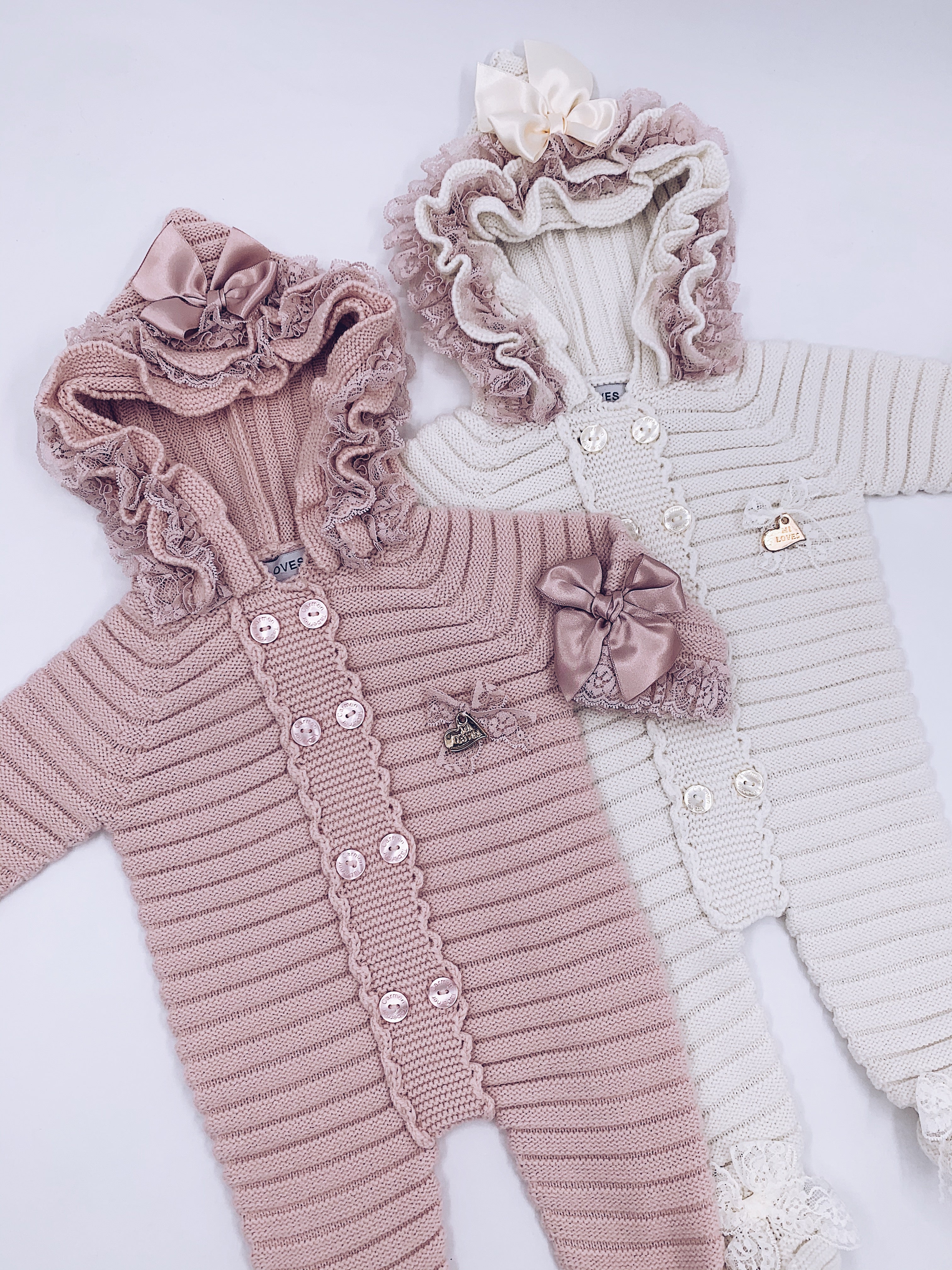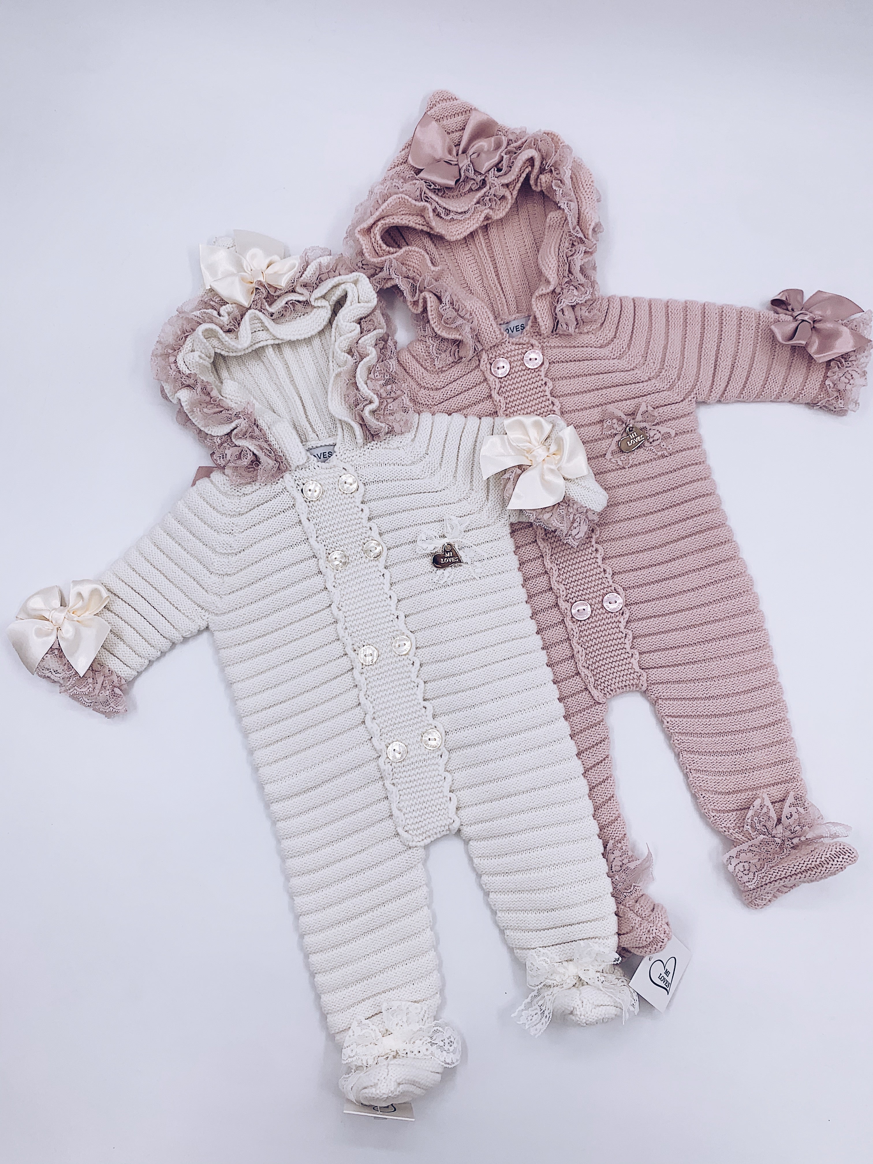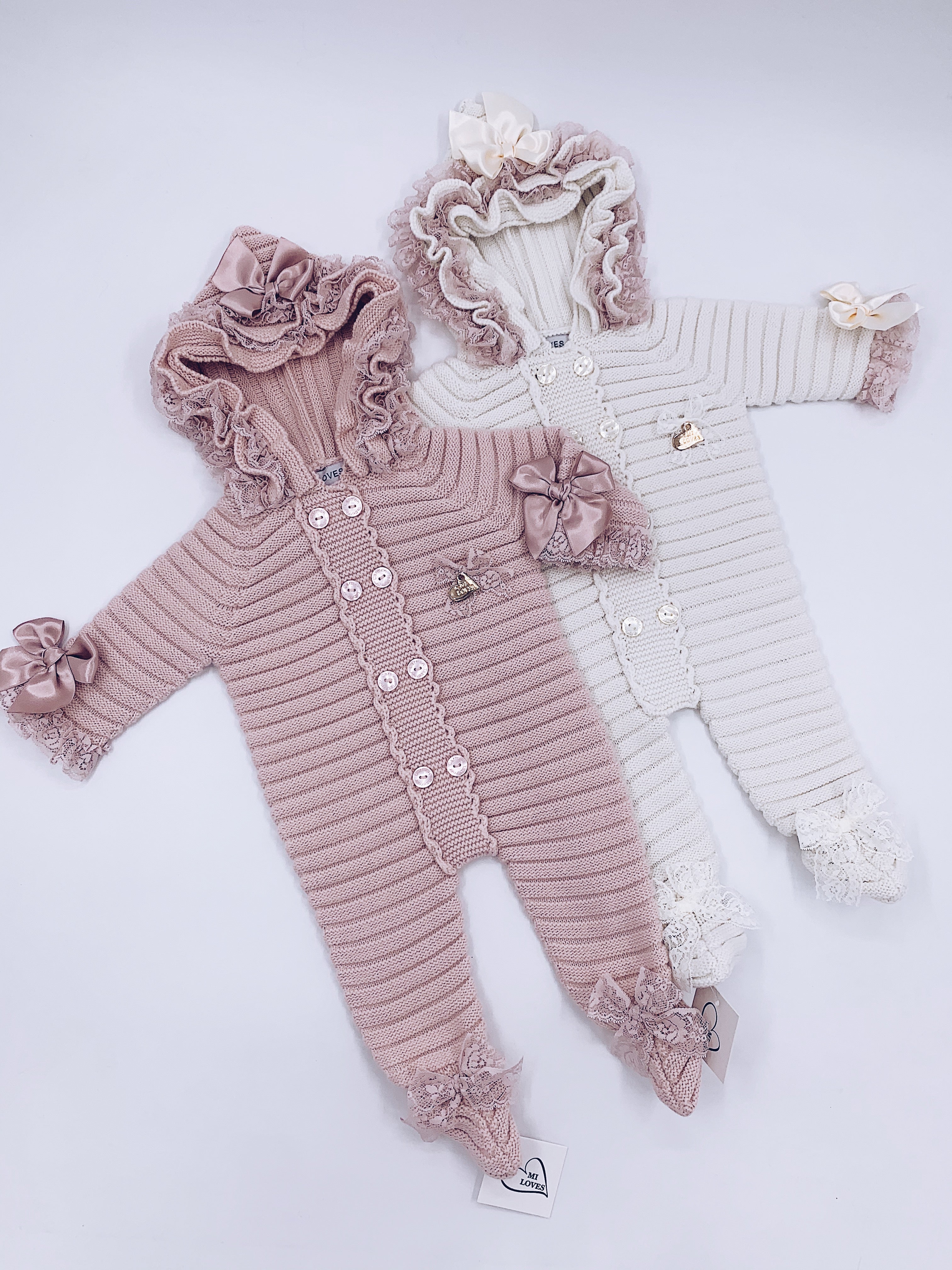 MI LOVES SIGNATURE Luxurious knitted Pramsuit with beautiful Lace and bow details