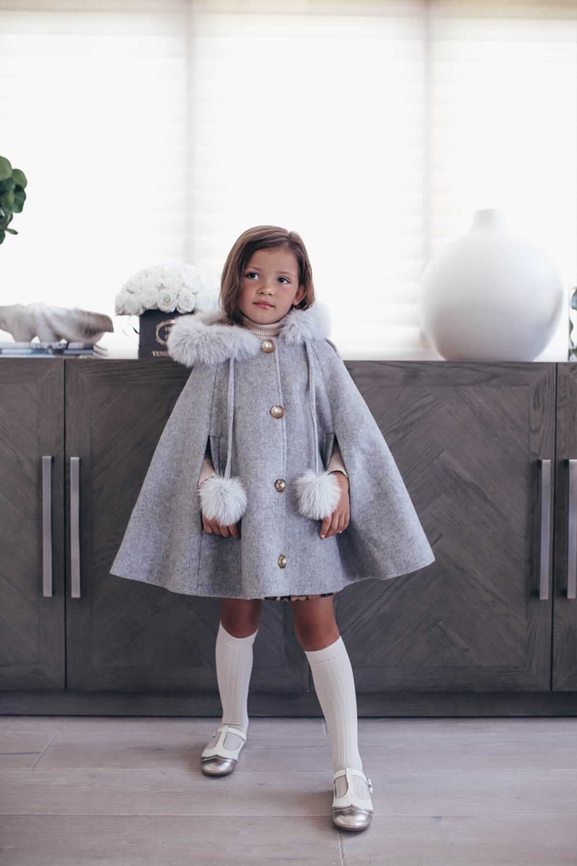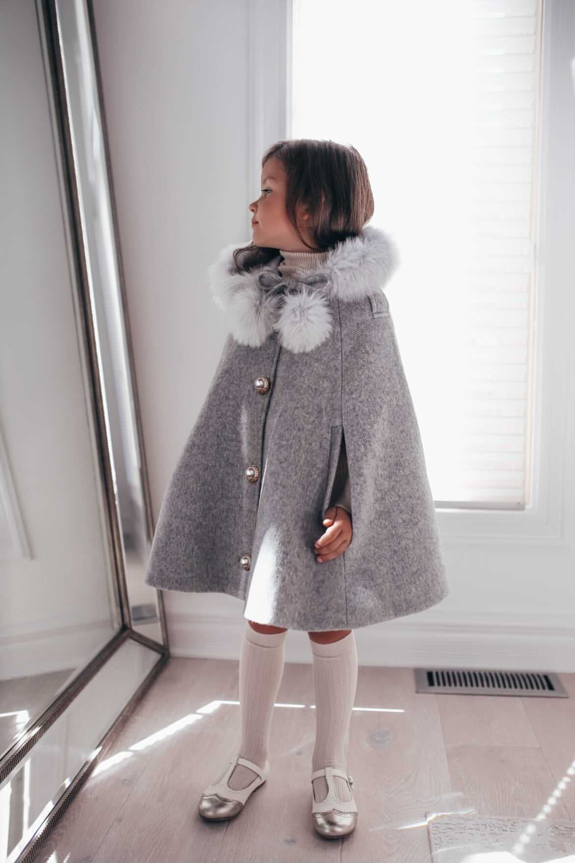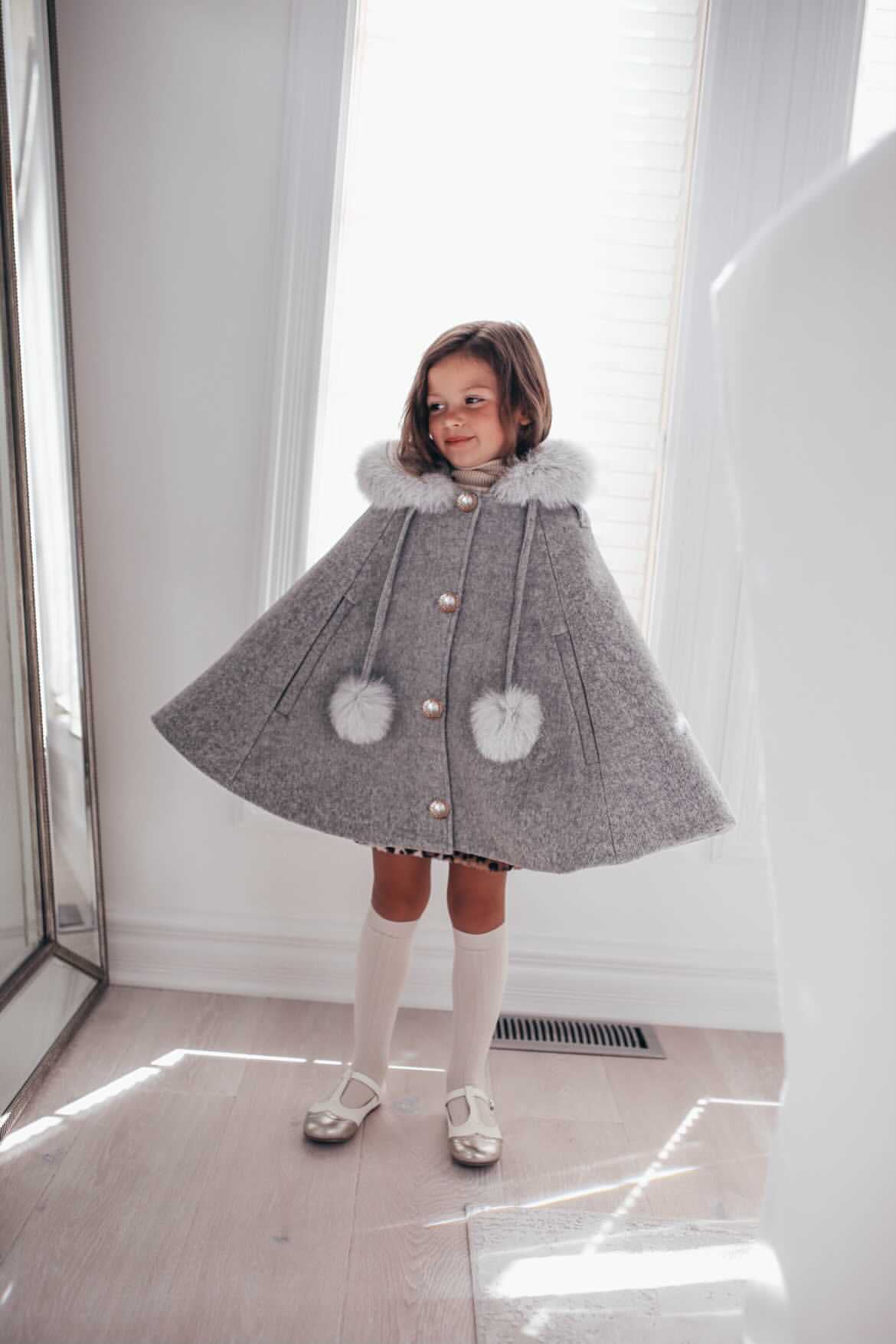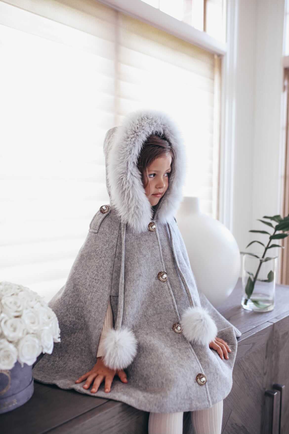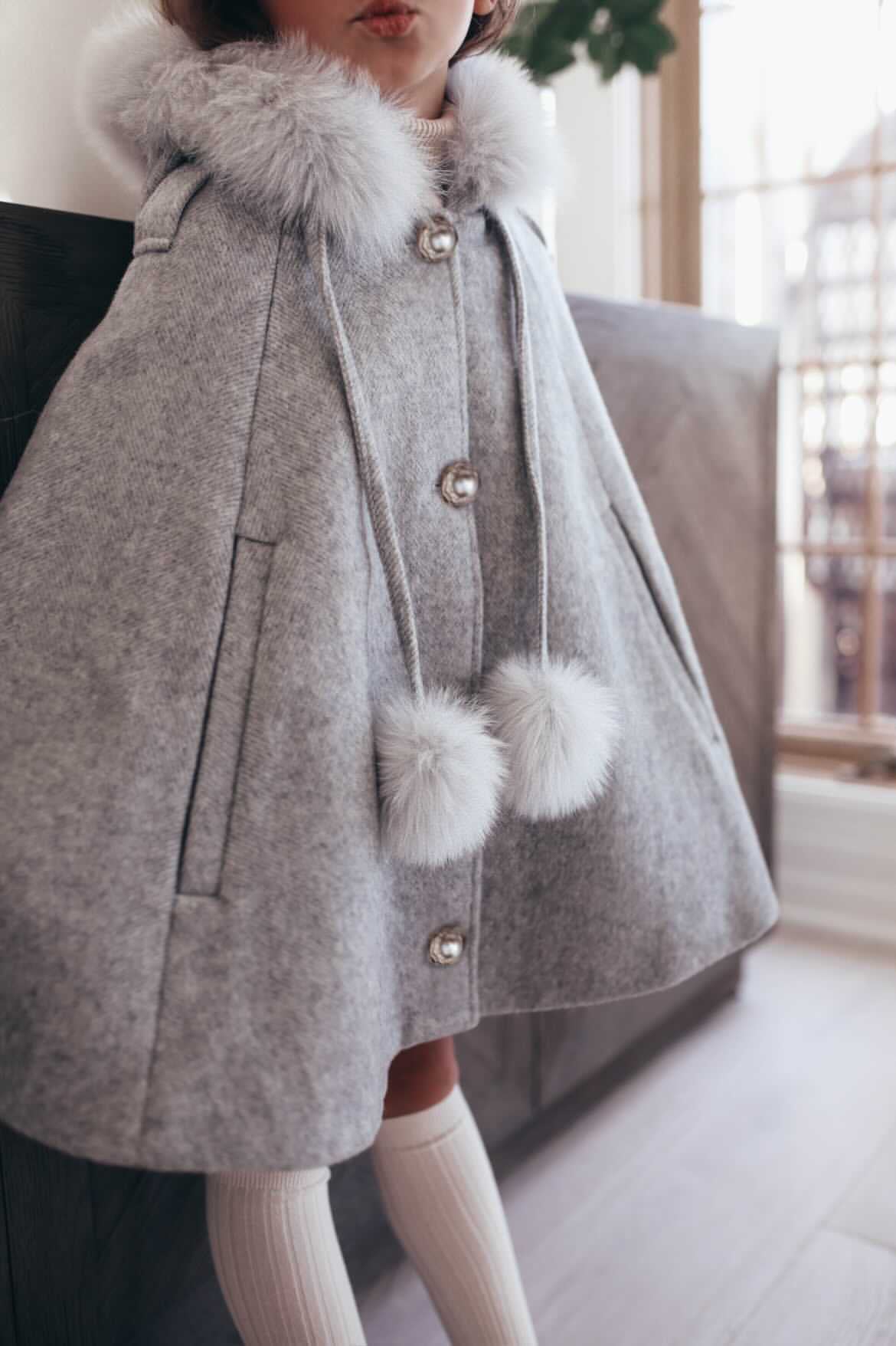 We are Proud to present Victoria for MI LOVES Collaboration piece for AW21!!Beautiful DOVE Cape with Luxurious Fox fur Collar and pom-poms .Made from Luxurious Cashmere/Wool material,with gorgeous Pearl buttons ,and cute Fox fur pom-poms
