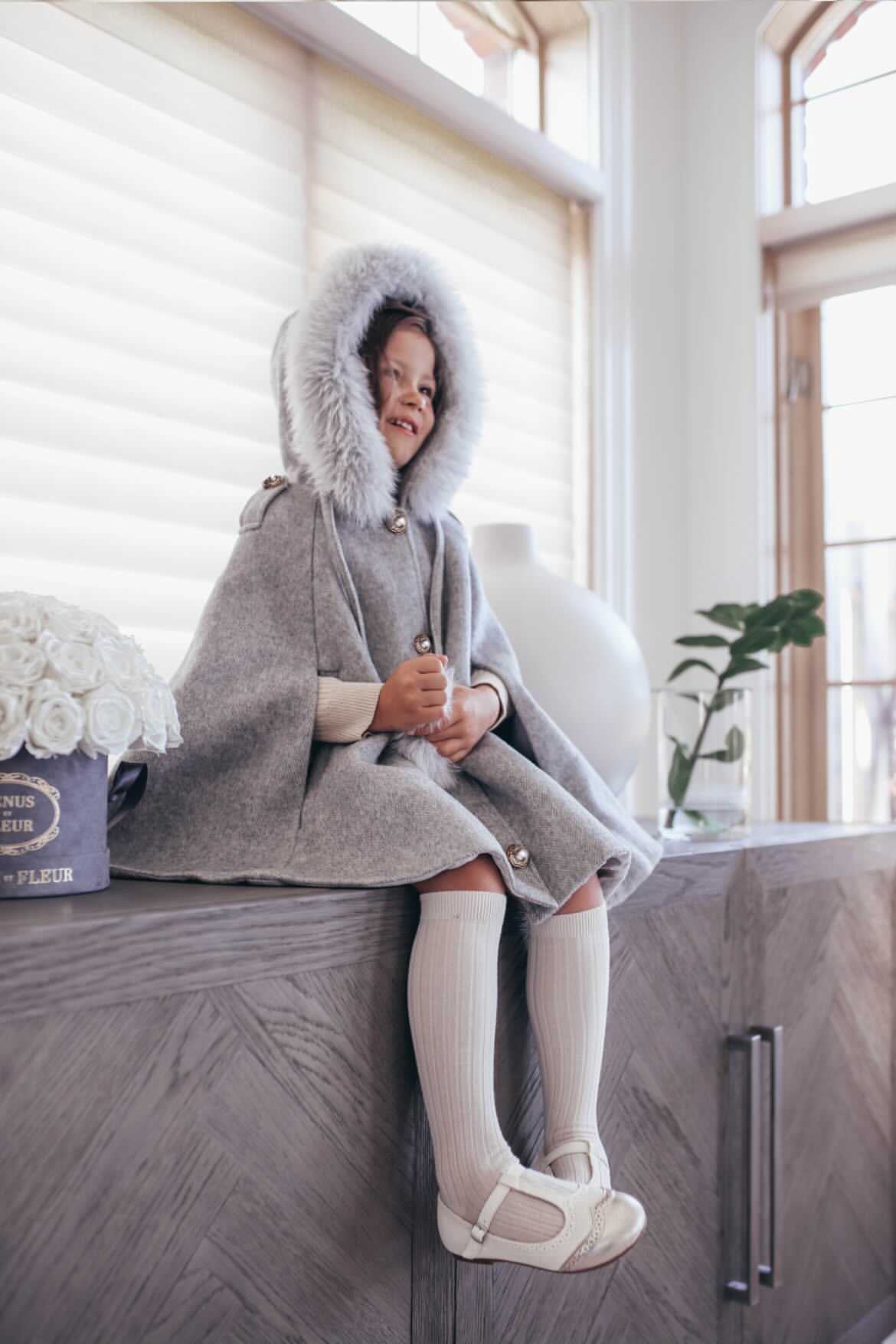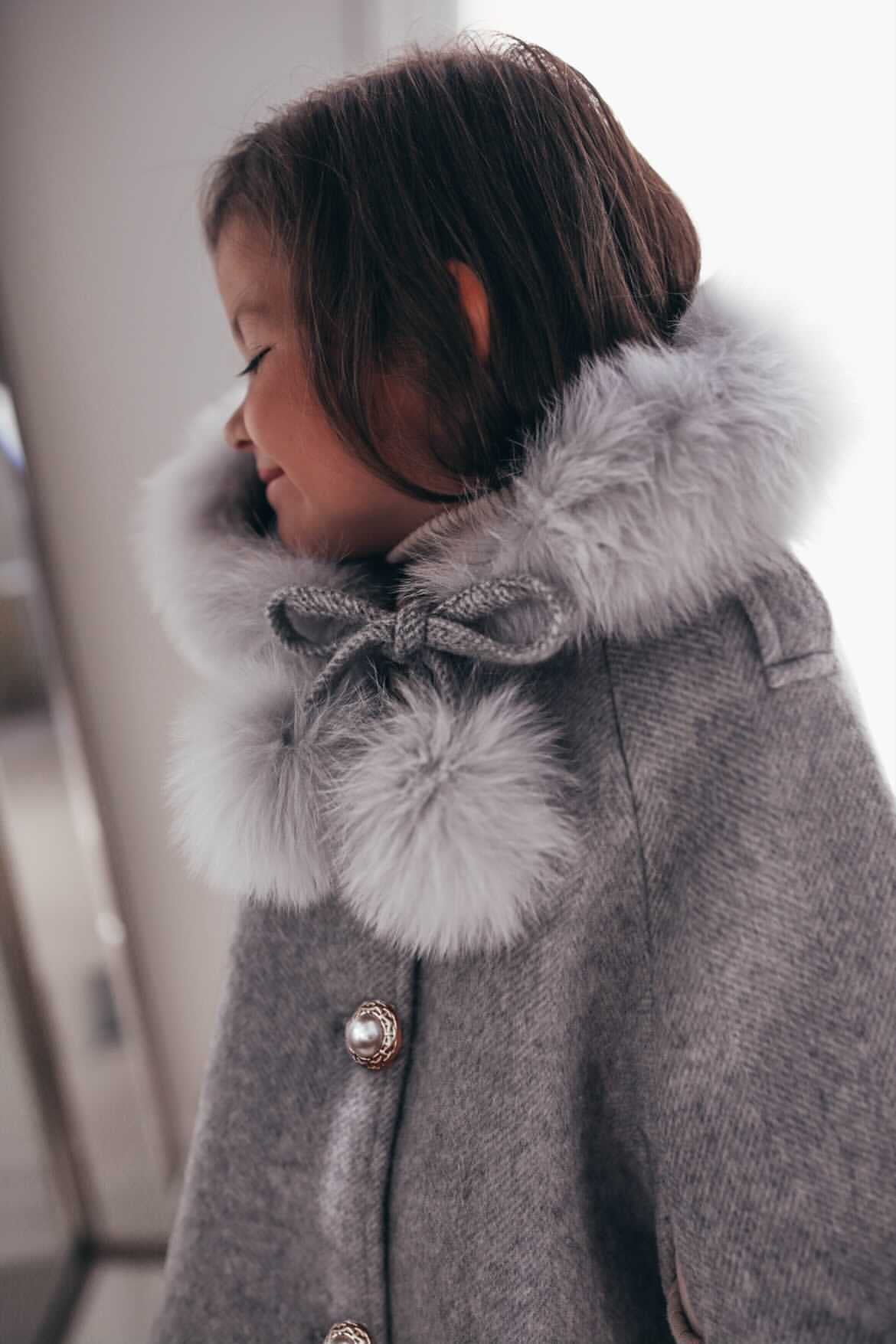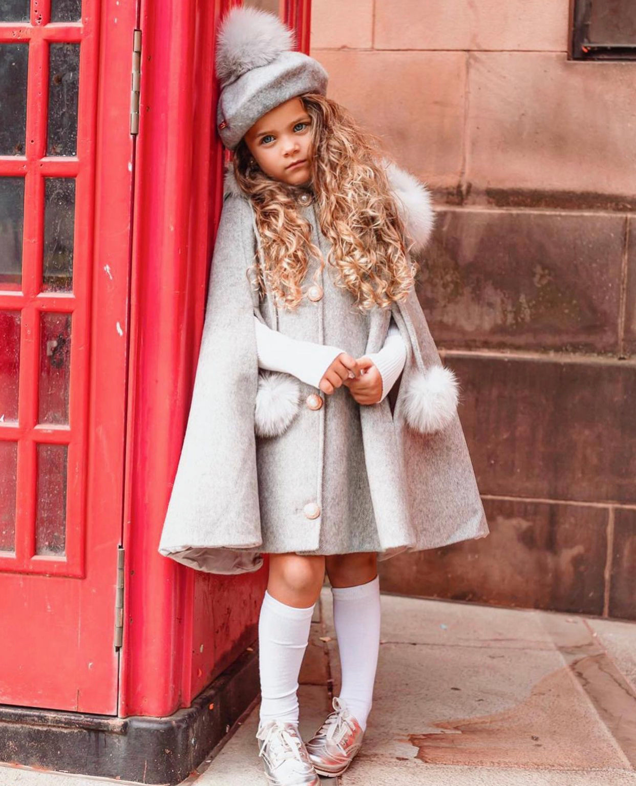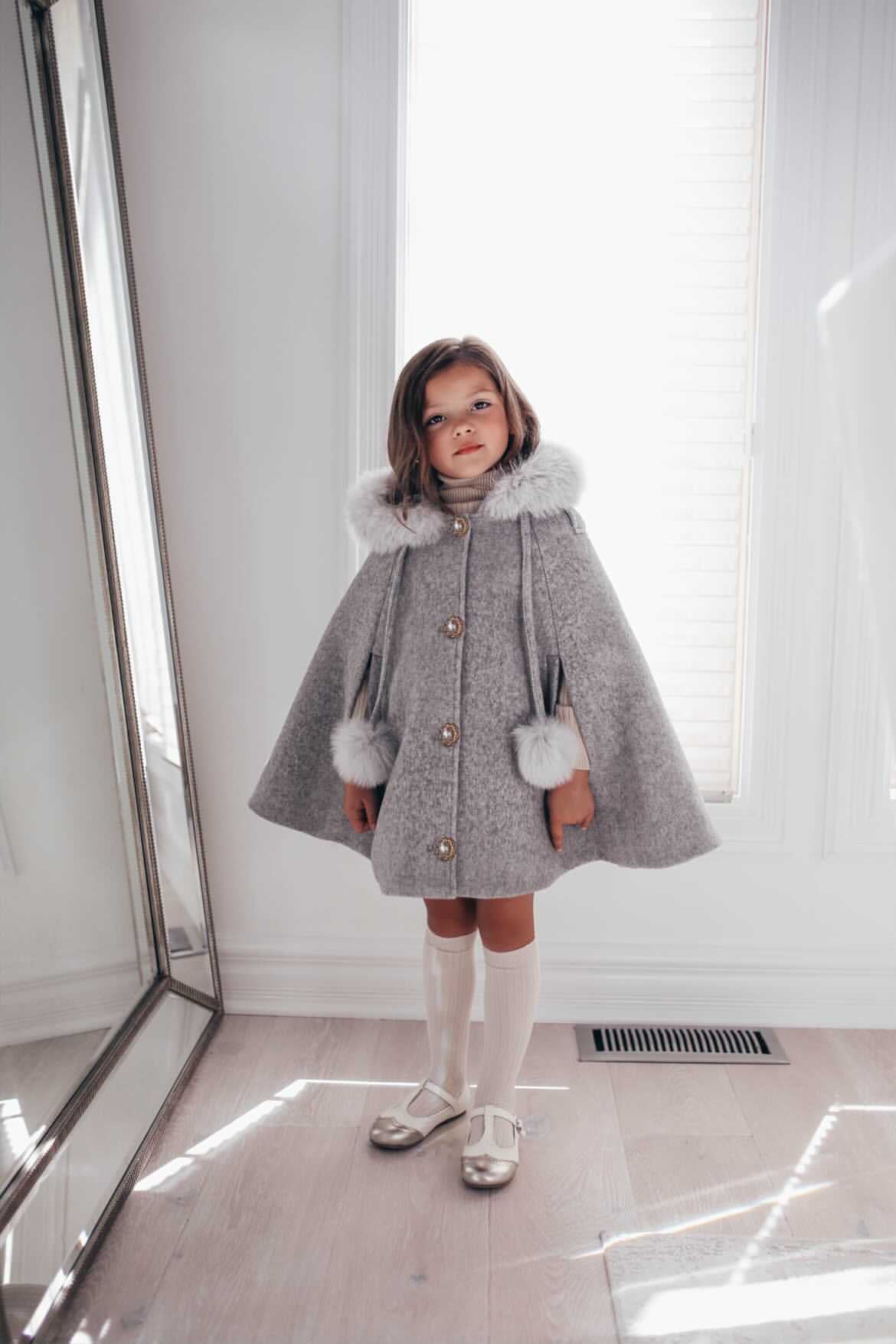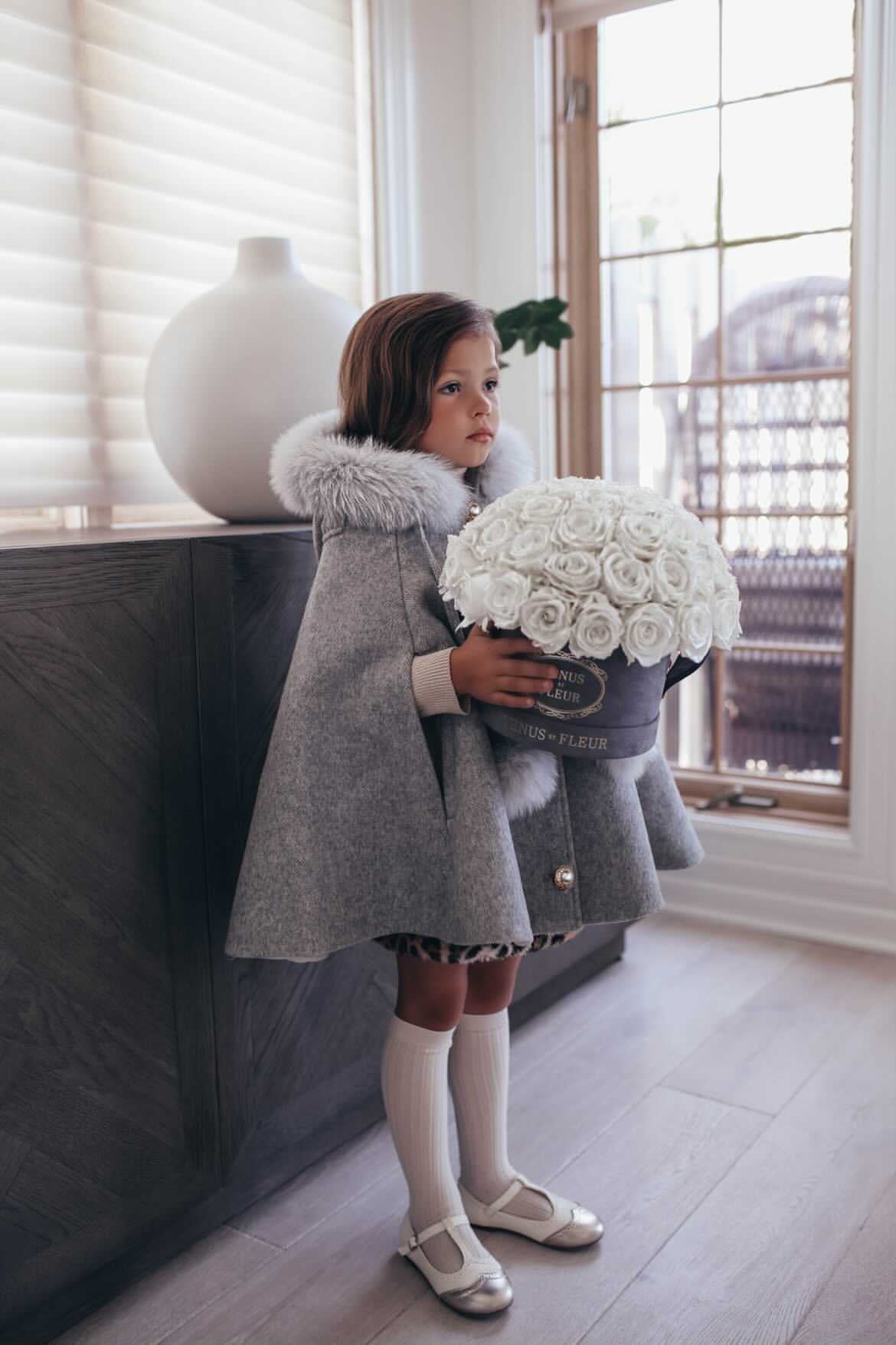 We are Proud to present Victoria for MI LOVES Collaboration piece for AW21!!Beautiful DOVE Cape with Luxurious Fox fur Collar and pom-poms .Made from Luxurious Cashmere/Wool material,with gorgeous Pearl buttons ,and cute Fox fur pom-poms