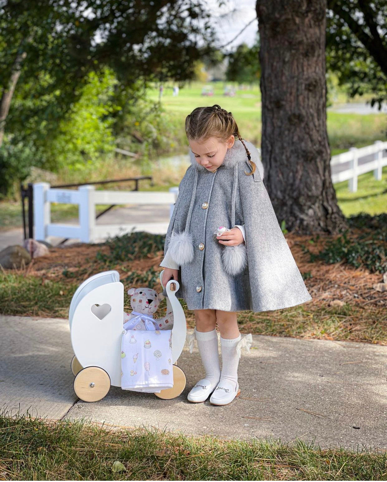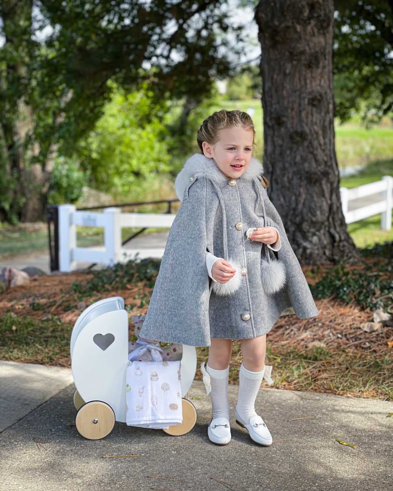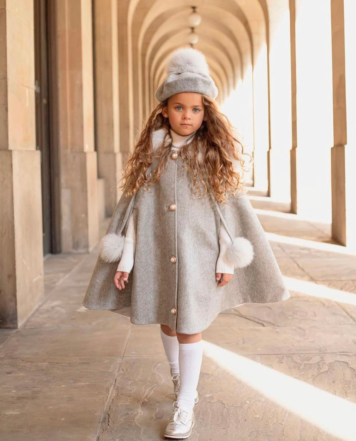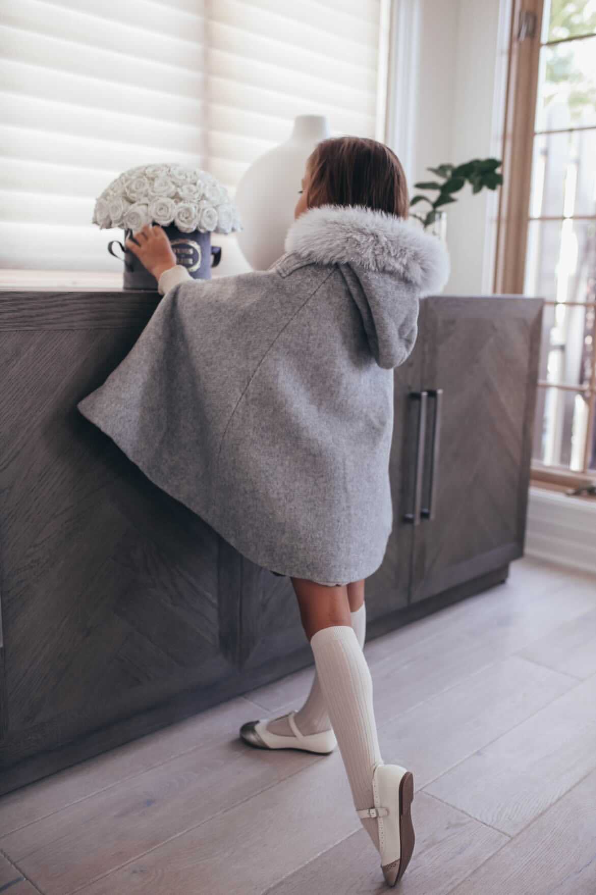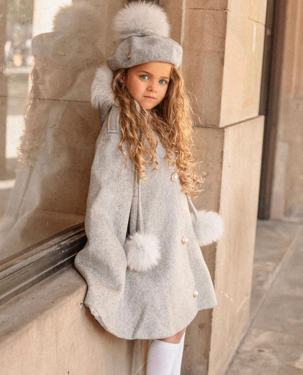 We are Proud to present Victoria for MI LOVES Collaboration piece for AW21!!Beautiful DOVE Cape with Luxurious Fox fur Collar and pom-poms .Made from Luxurious Cashmere/Wool material,with gorgeous Pearl buttons ,and cute Fox fur pom-poms