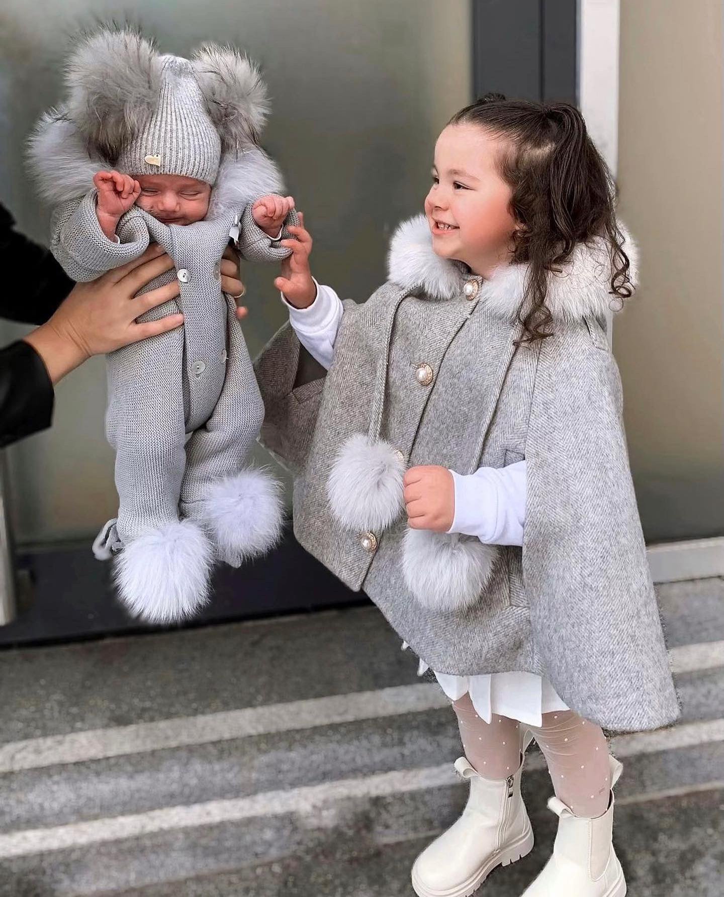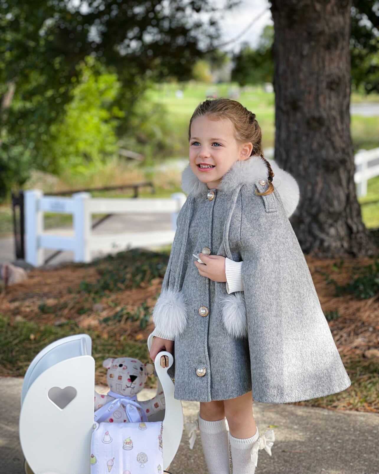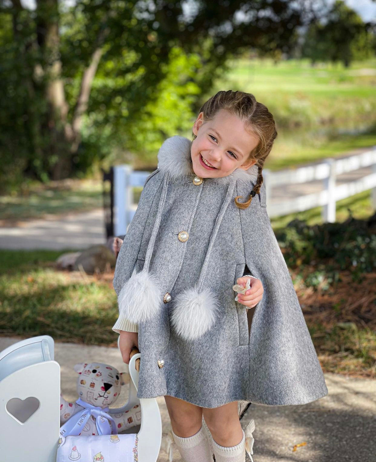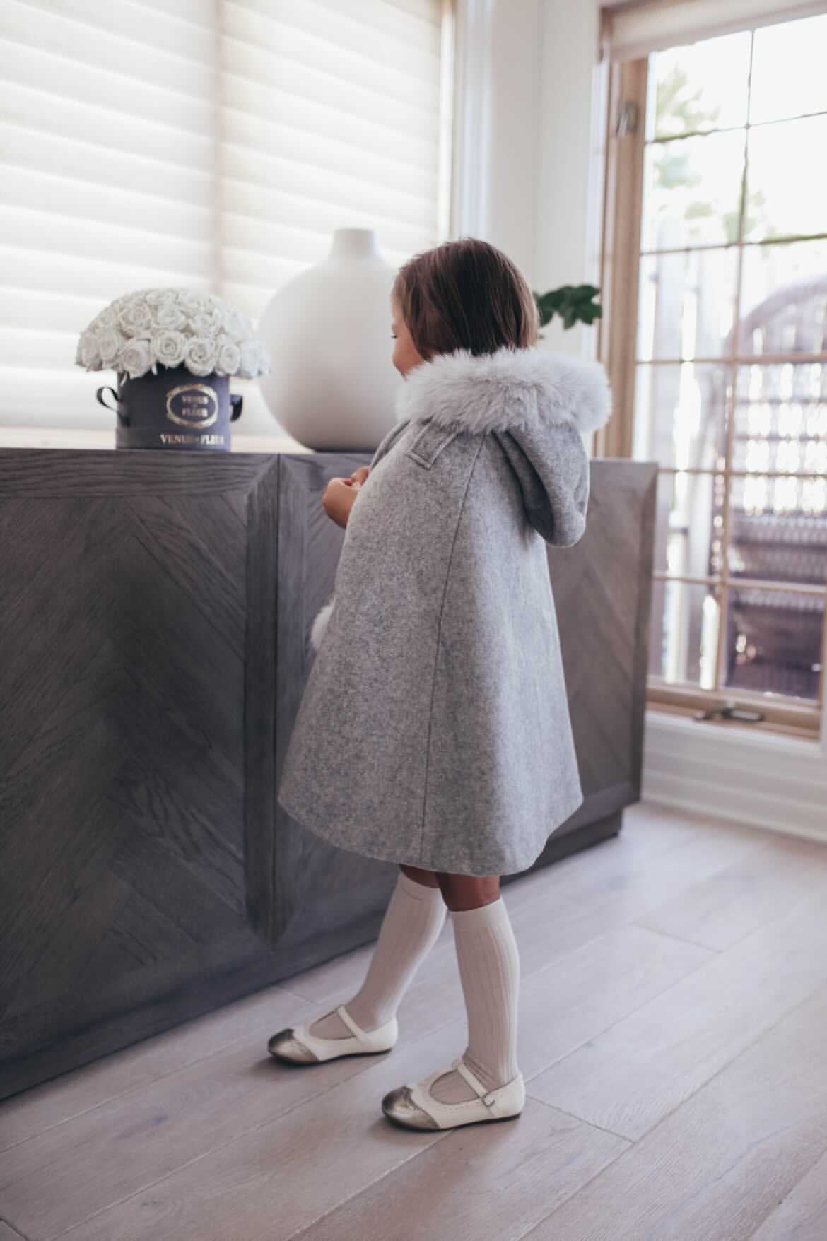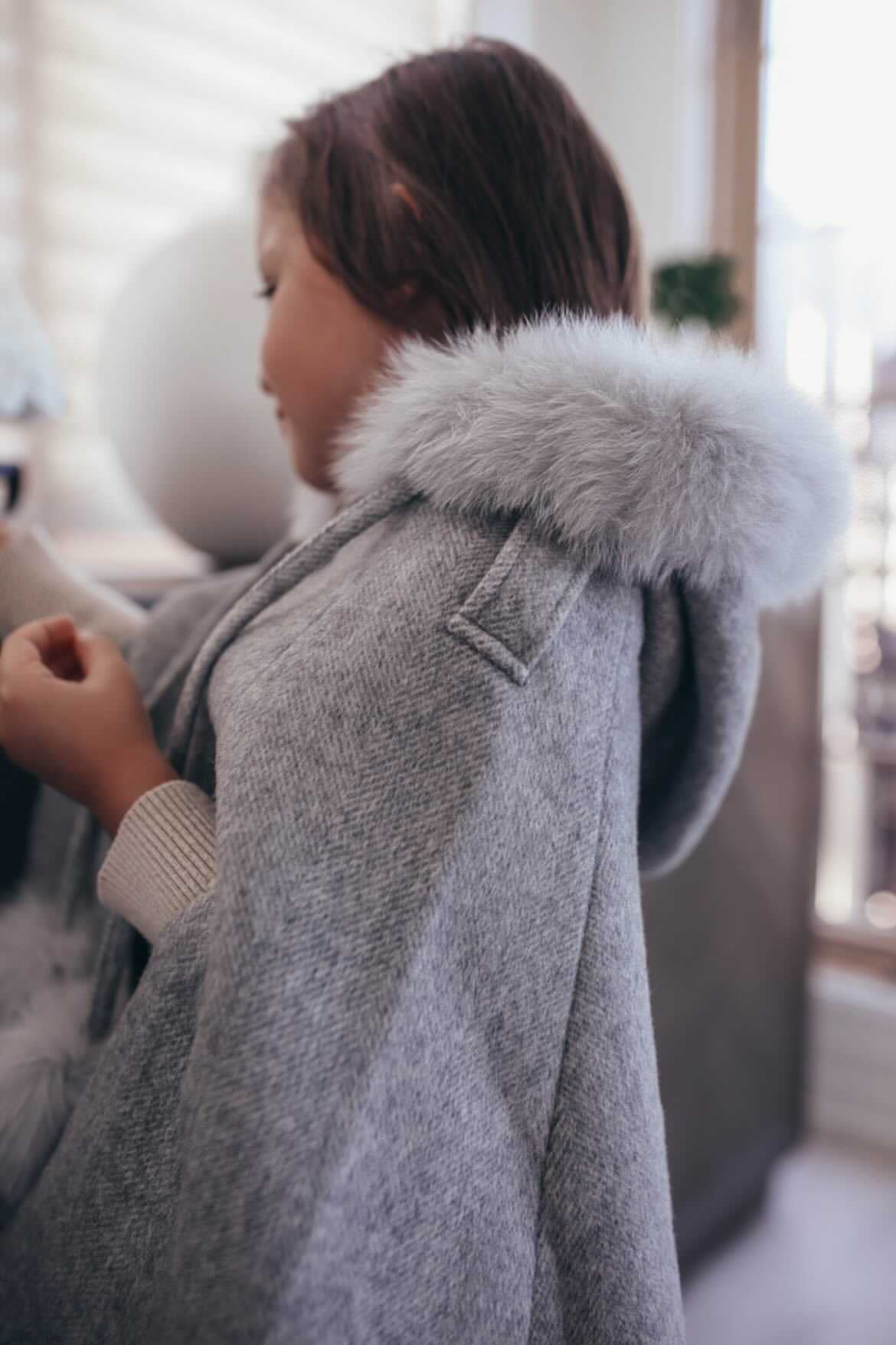 We are Proud to present Victoria for MI LOVES Collaboration piece for AW21!!Beautiful DOVE Cape with Luxurious Fox fur Collar and pom-poms .Made from Luxurious Cashmere/Wool material,with gorgeous Pearl buttons ,and cute Fox fur pom-poms