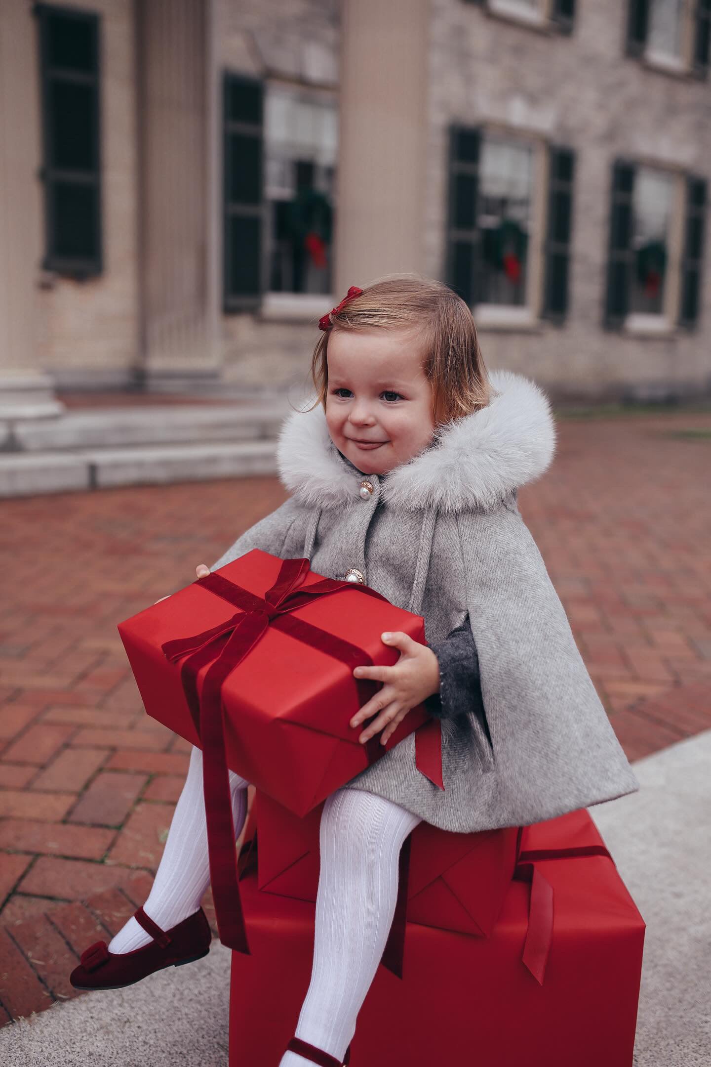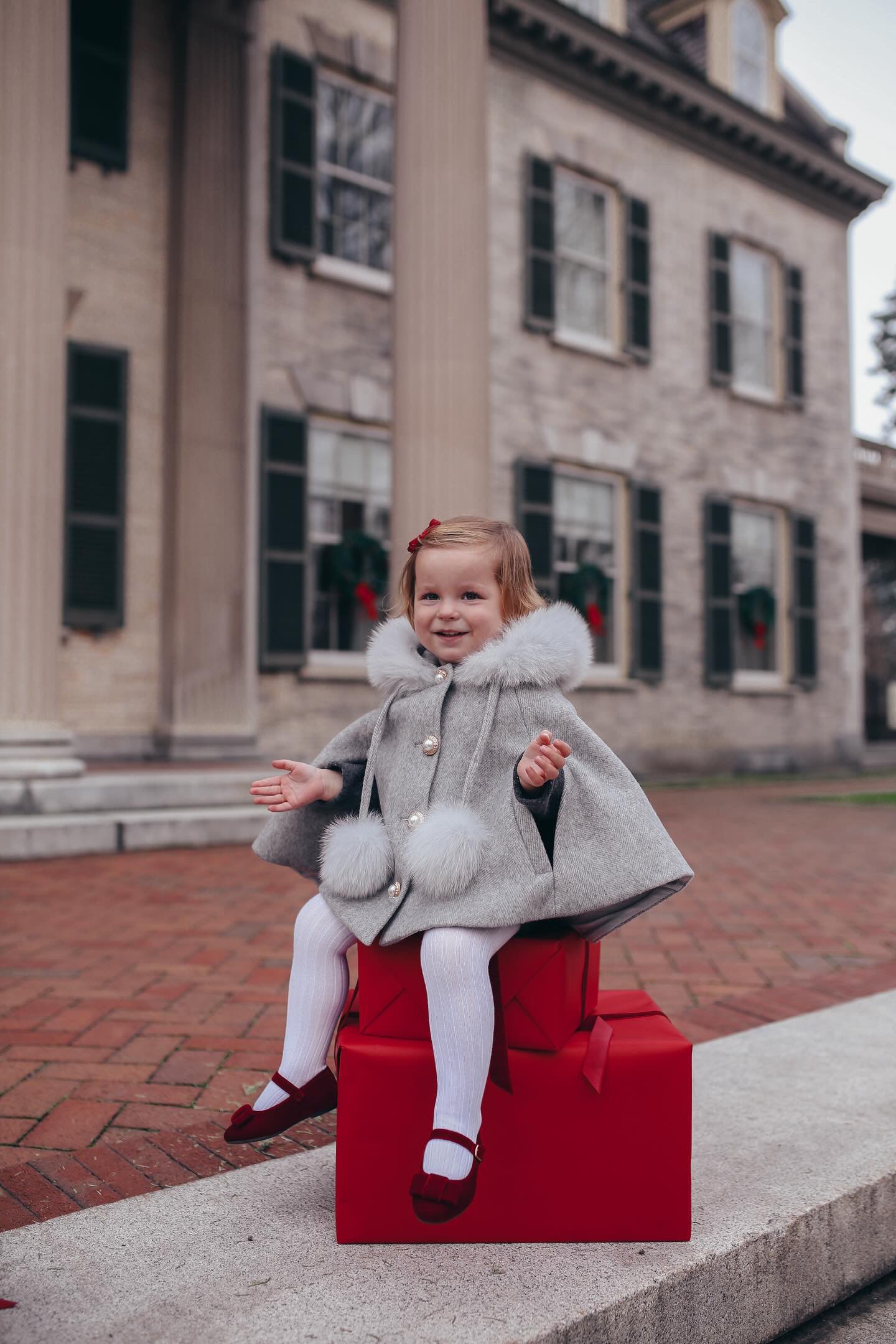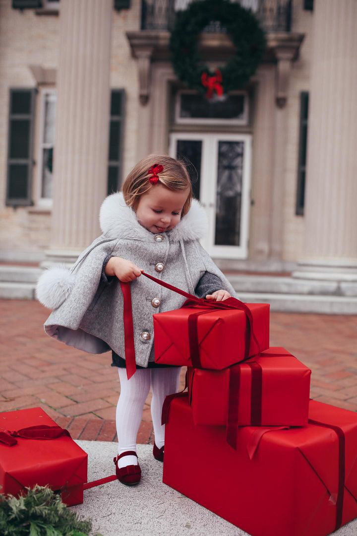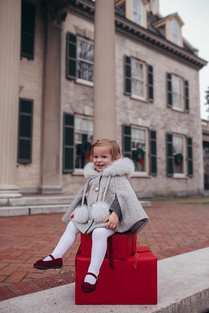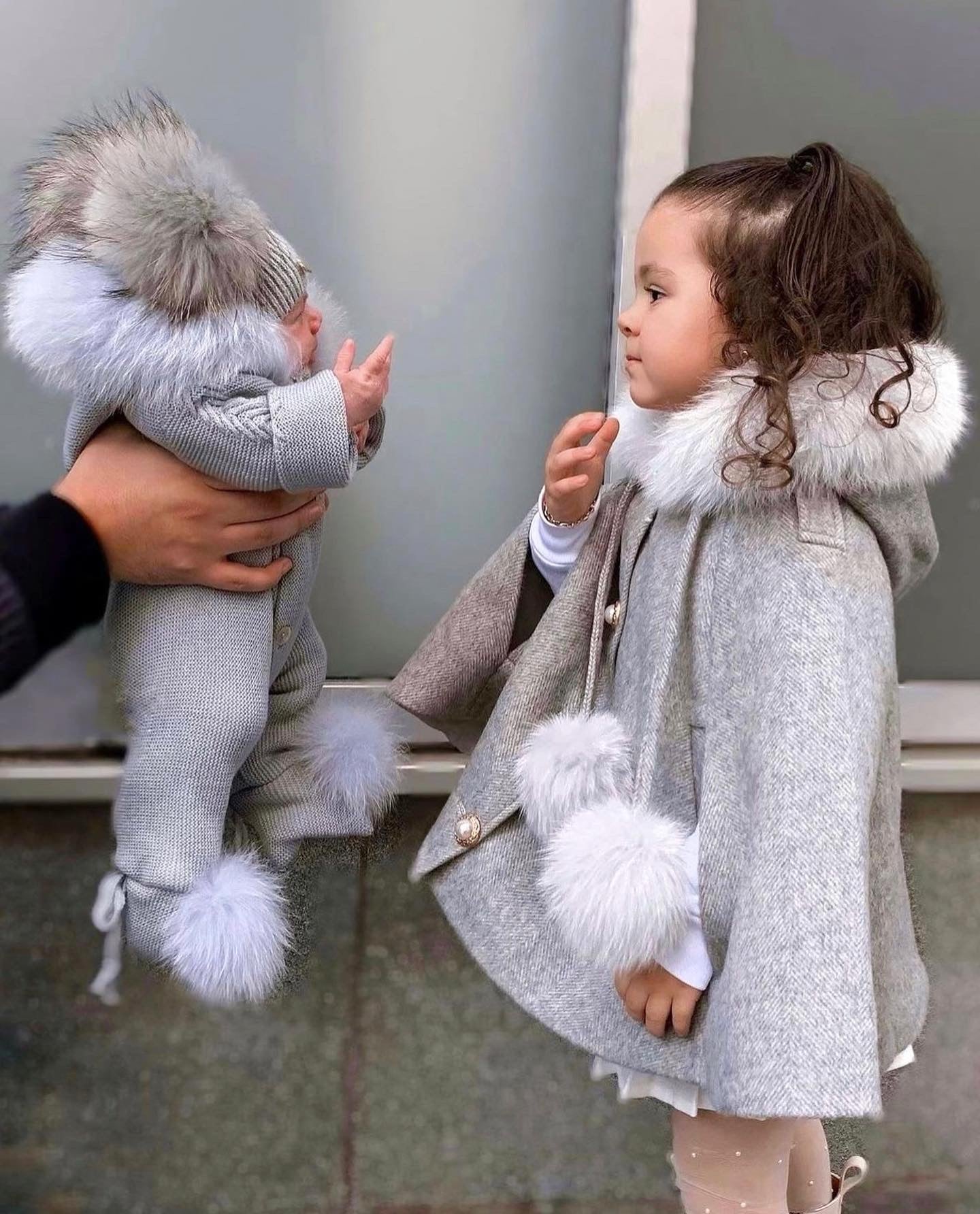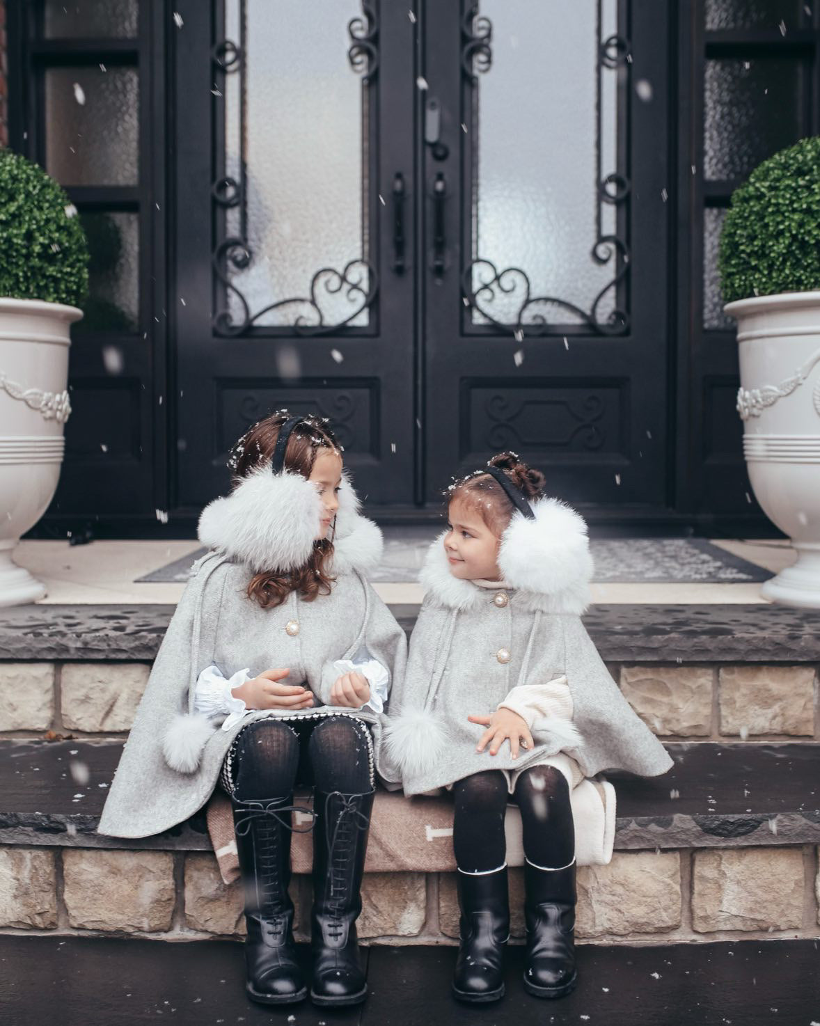 We are Proud to present Victoria for MI LOVES Collaboration piece for AW21!!Beautiful DOVE Cape with Luxurious Fox fur Collar and pom-poms .Made from Luxurious Cashmere/Wool material,with gorgeous Pearl buttons ,and cute Fox fur pom-poms