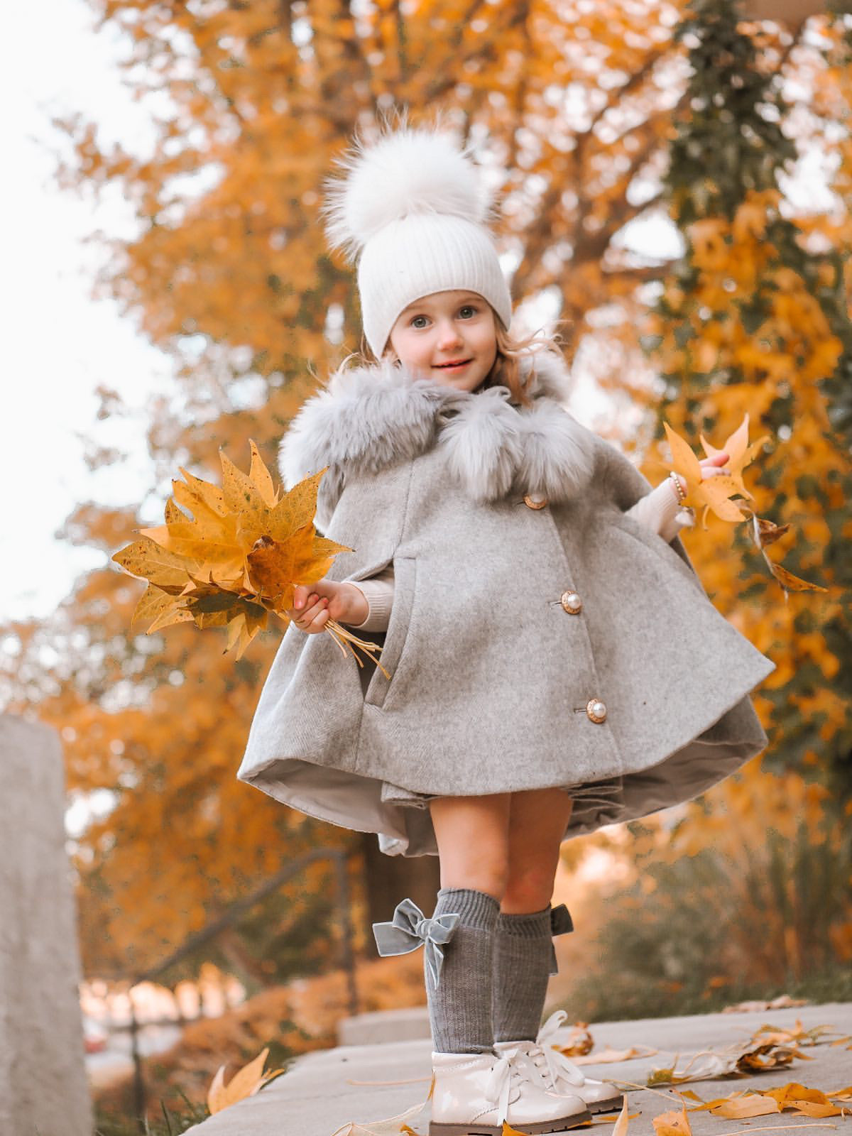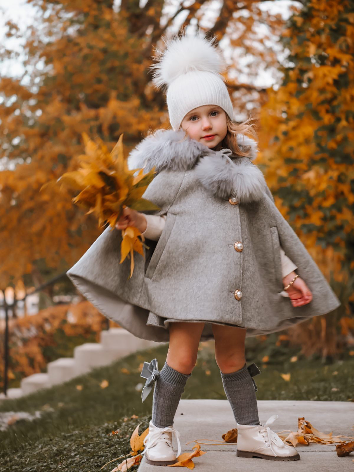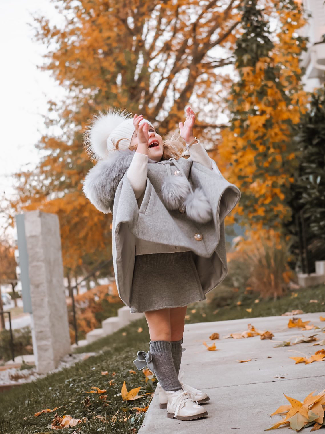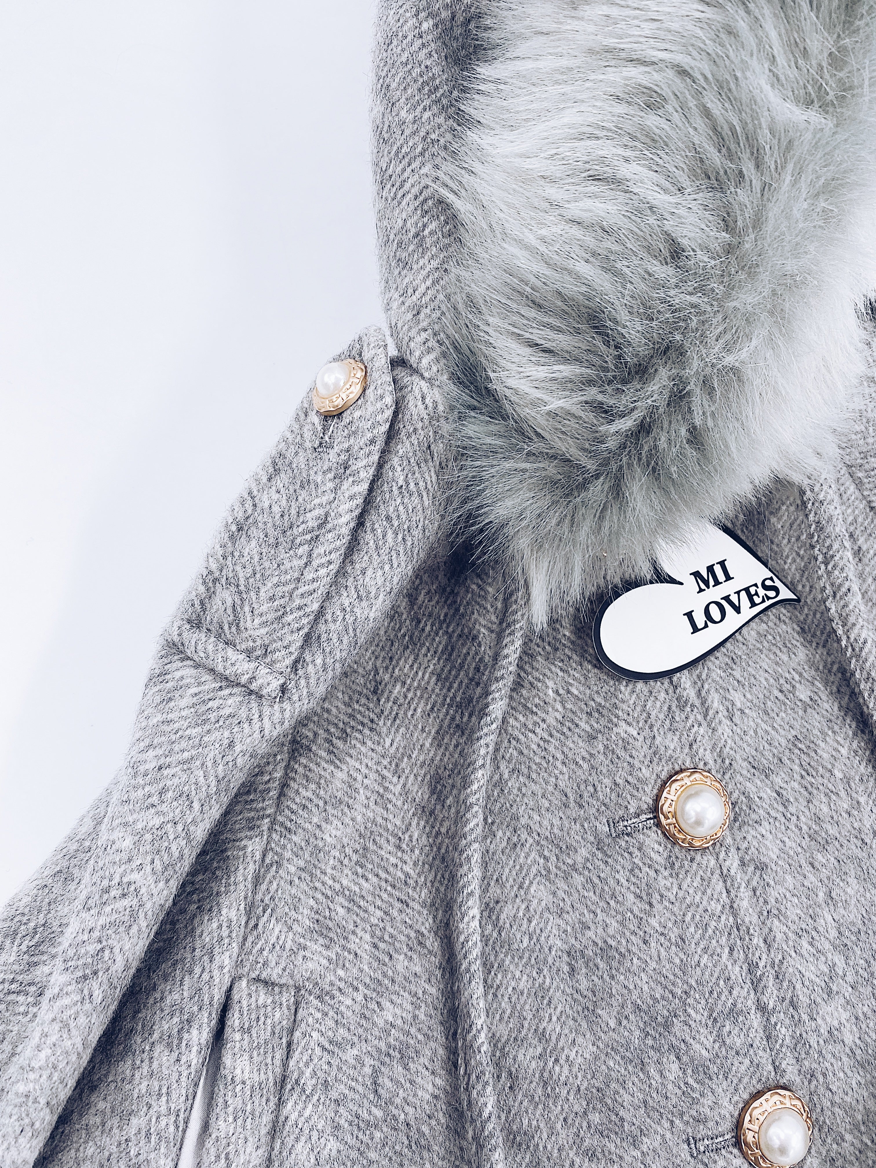 We are Proud to present Victoria for MI LOVES Collaboration piece for AW21!!Beautiful DOVE Cape with Synthetic fur Collar and pom-poms .Made from Luxurious Cashmere/Wool material,with gorgeous Pearl buttons ,and cute synthetic fur pom-poms