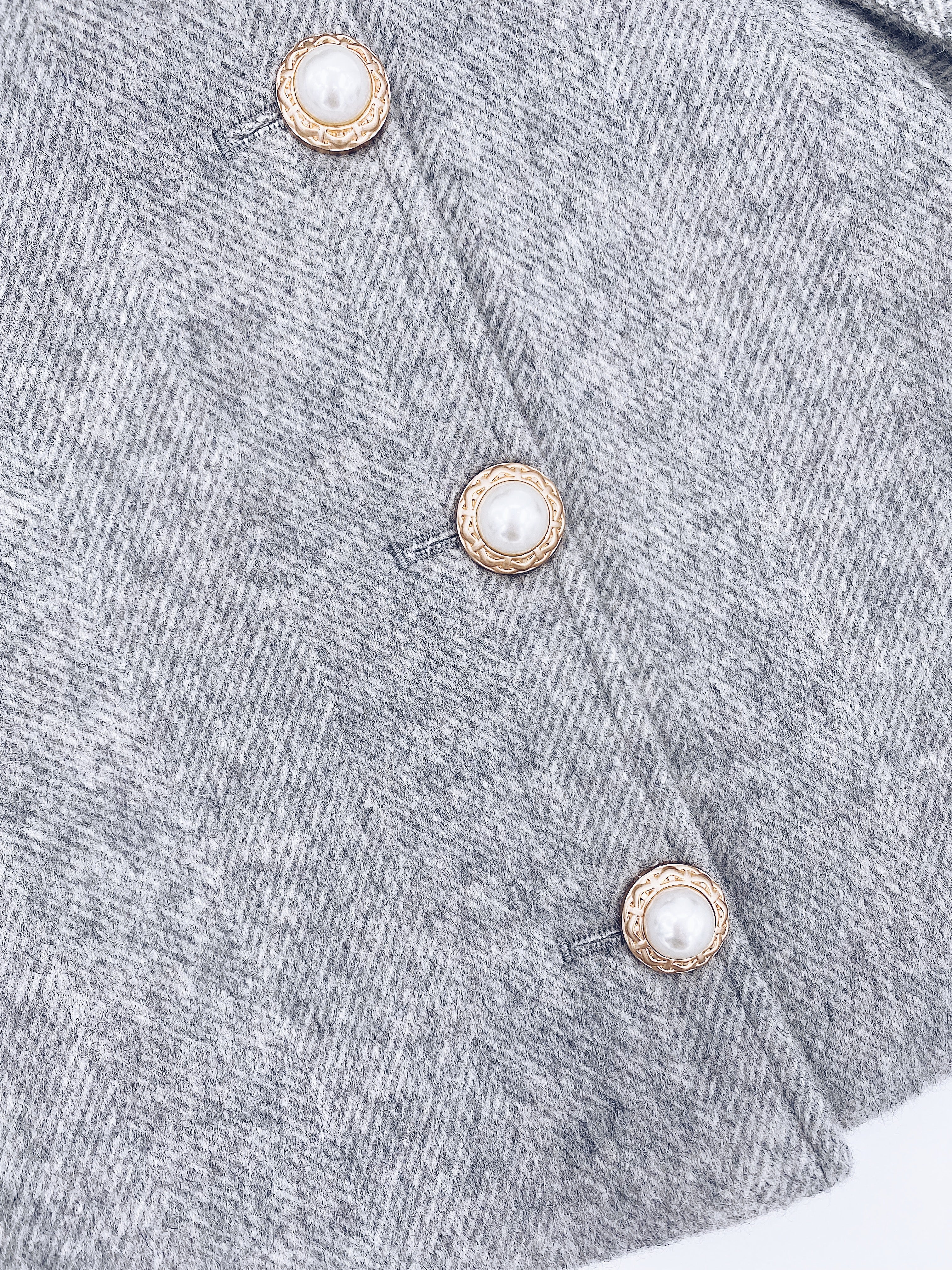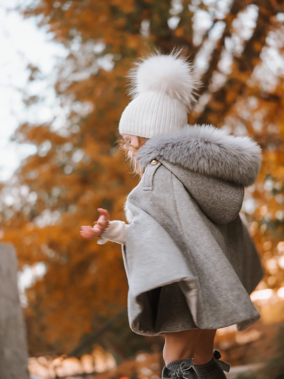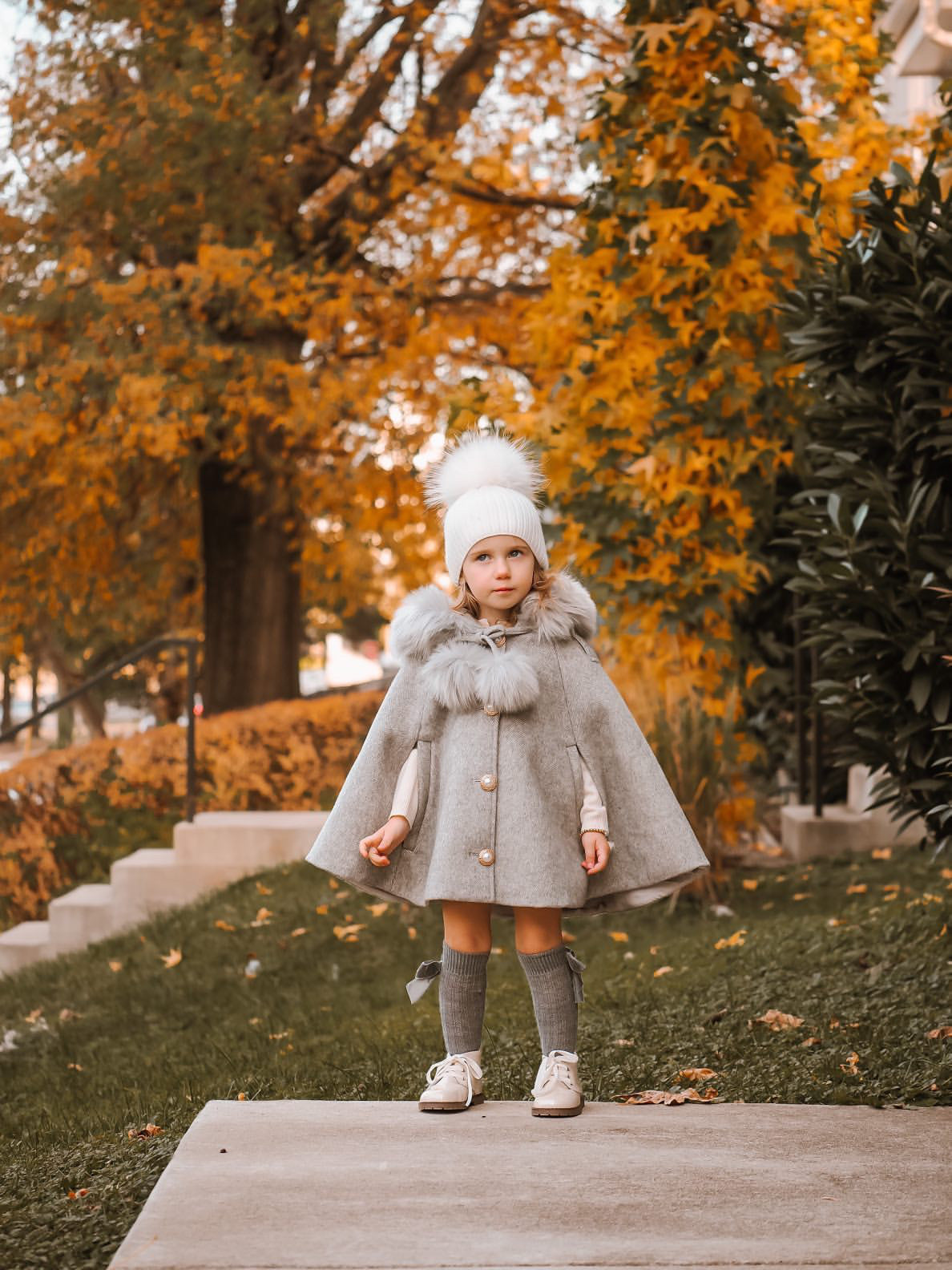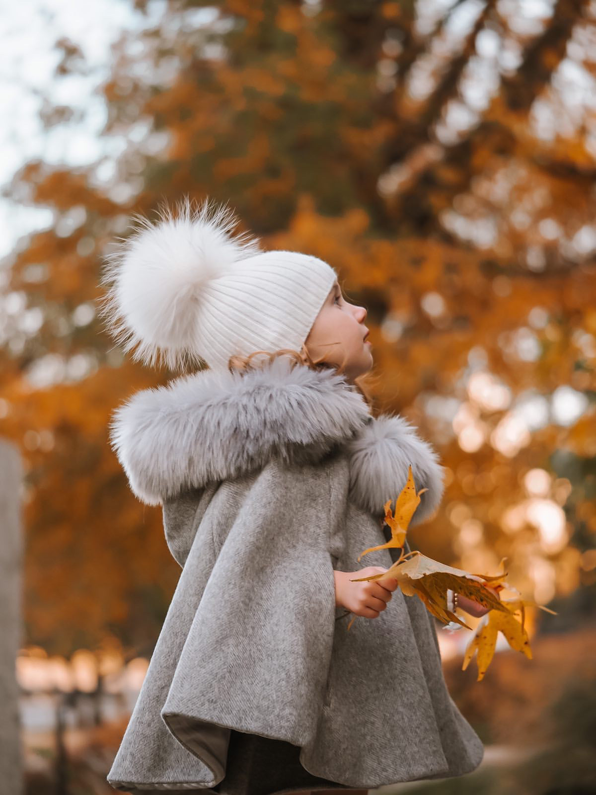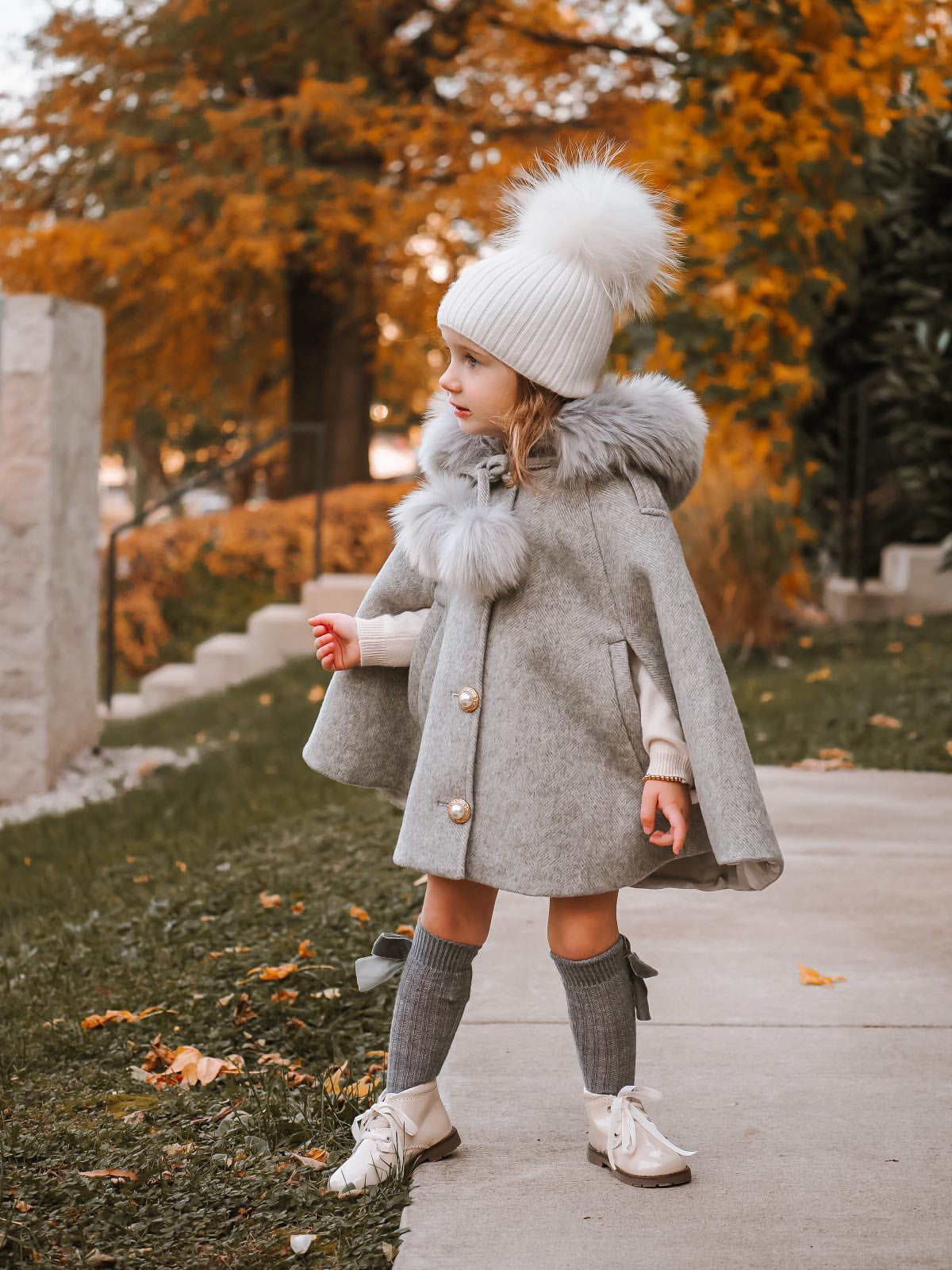 We are Proud to present Victoria for MI LOVES Collaboration piece for AW21!!Beautiful DOVE Cape with Synthetic fur Collar and pom-poms .Made from Luxurious Cashmere/Wool material,with gorgeous Pearl buttons ,and cute synthetic fur pom-poms