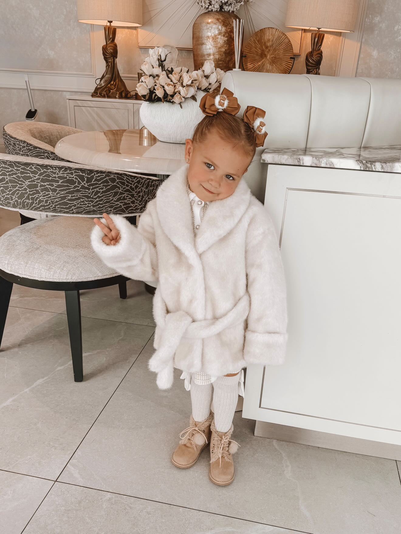 MILOVES Signature Luxurious Mongolian lamb fur kids jacket with long sleeves in Ivory/White.