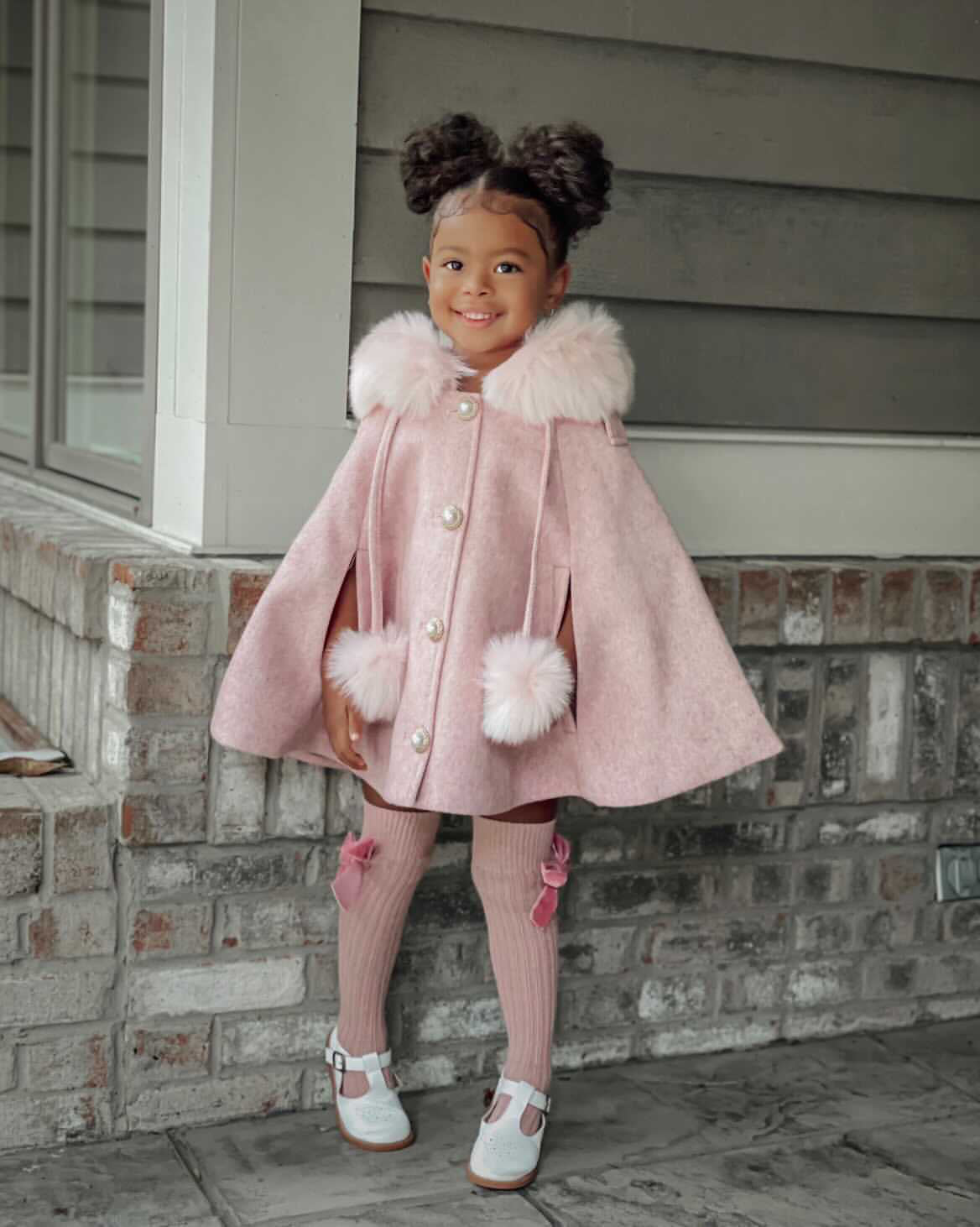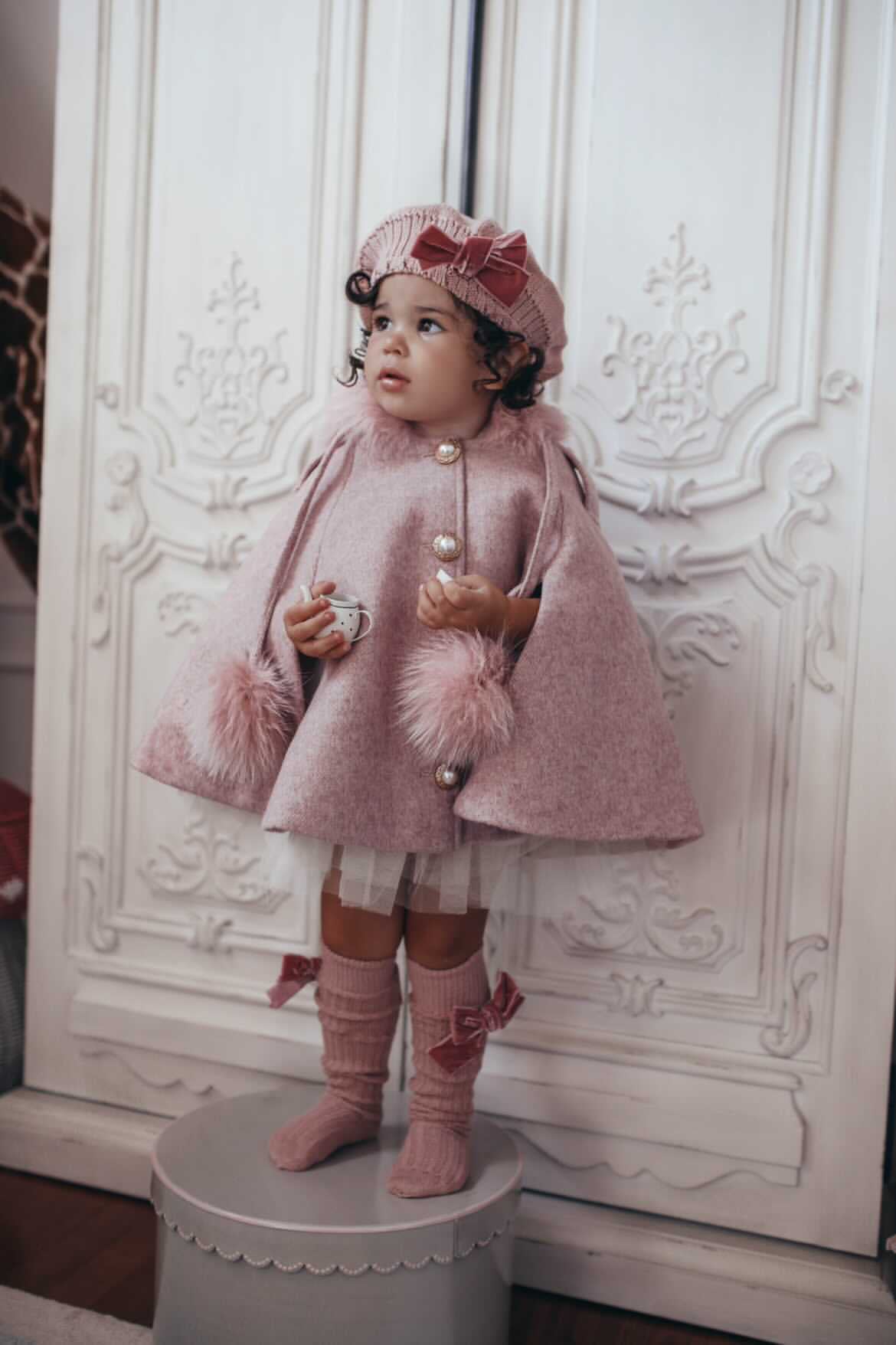 Victoria for MI LOVES Collaboration!!Beautiful ROSE Cape with Synthetic fur Collar and pom-poms.
