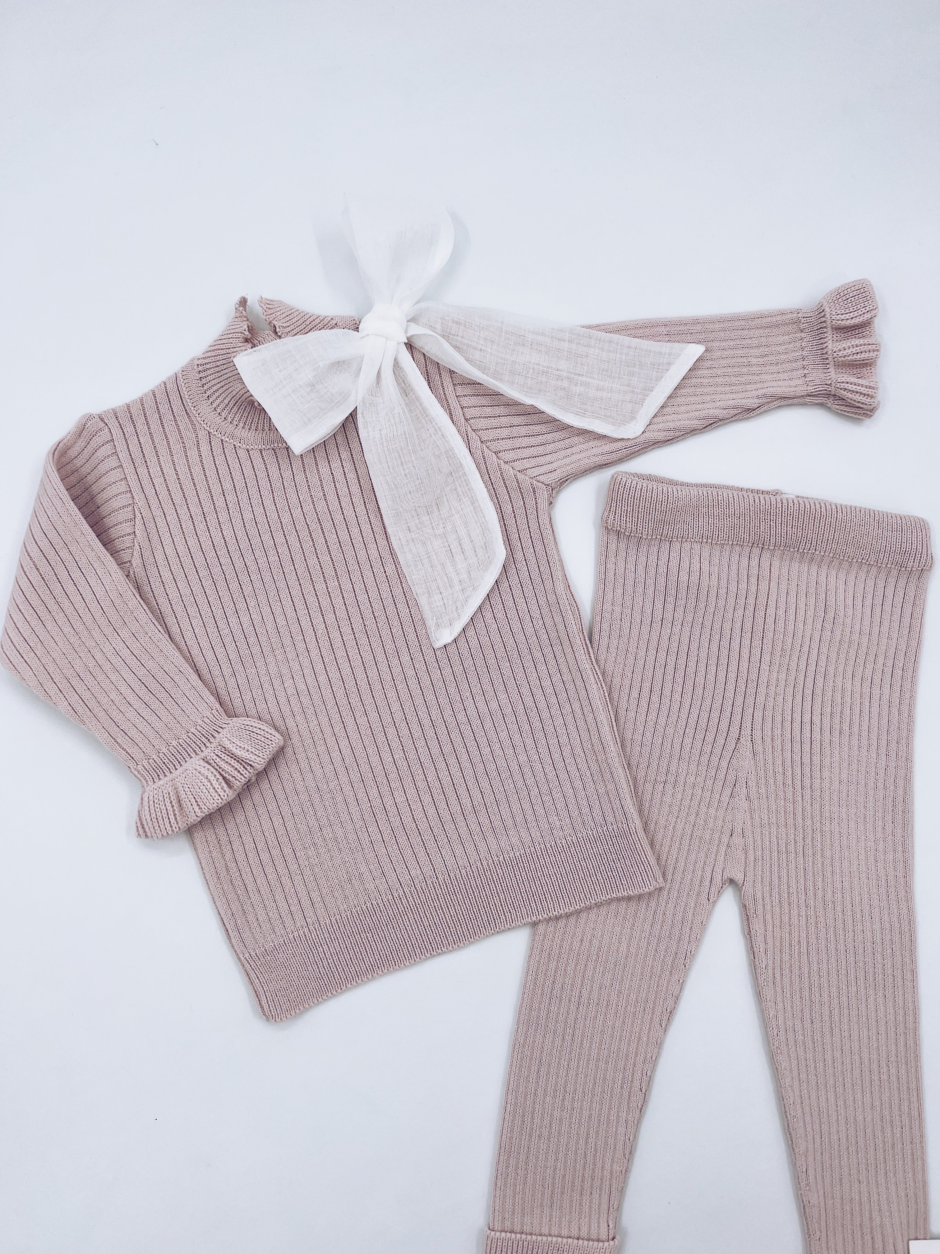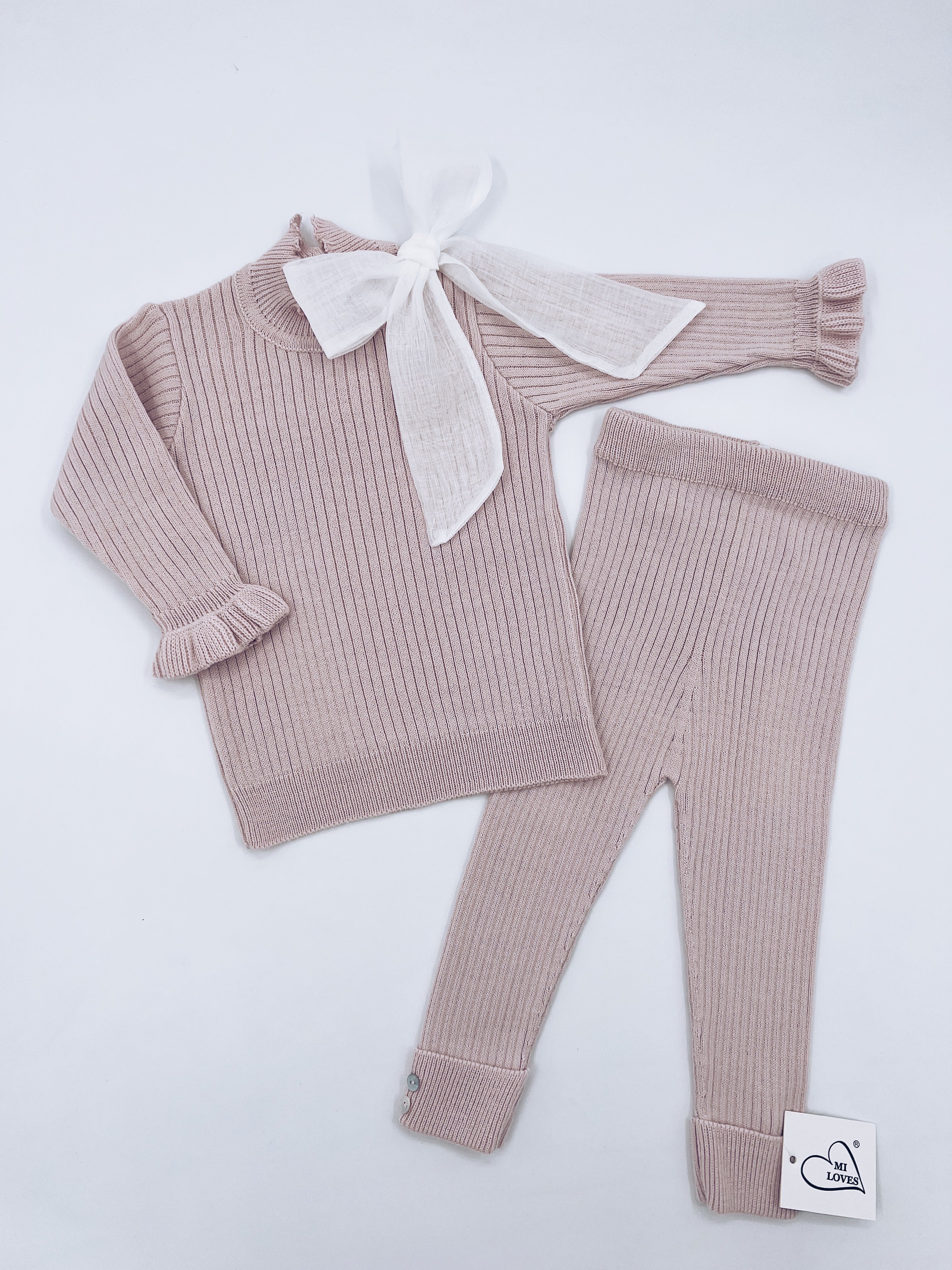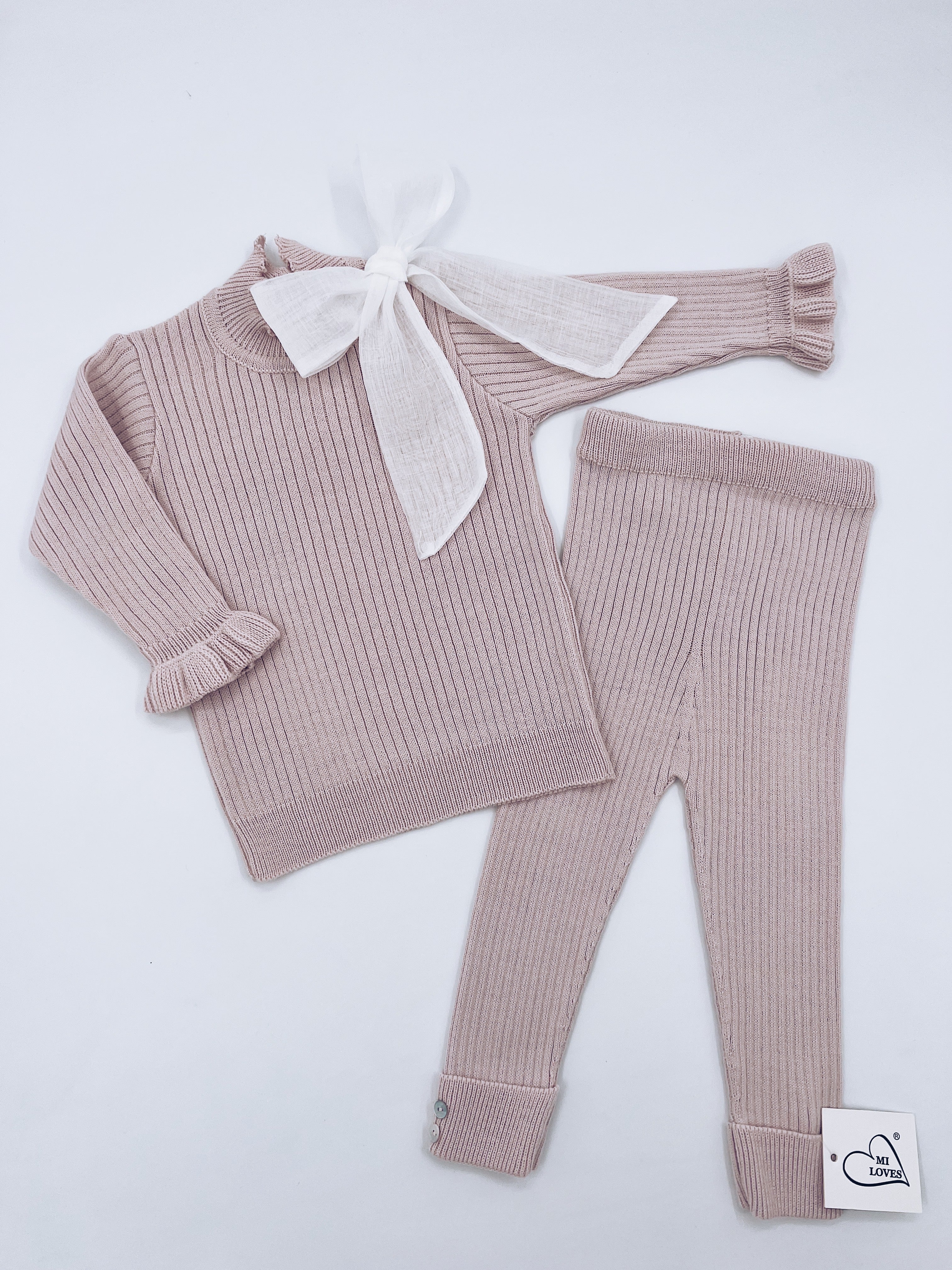 MI LOVES Signature Beautiful Dusty pink knitted ribbed leggings 2 piece set with Fabulous Bow details,high neck and frill details on the sleeves.