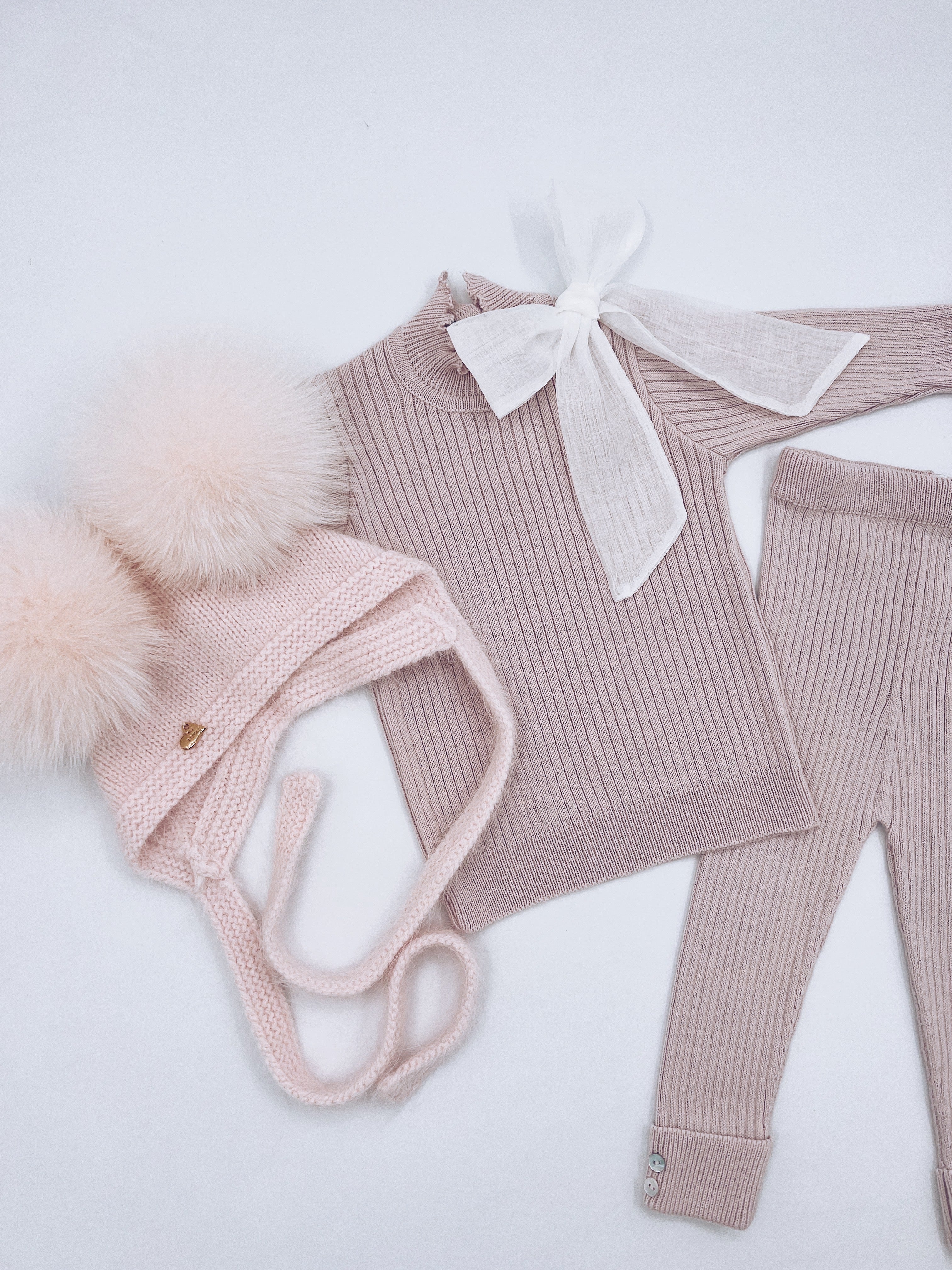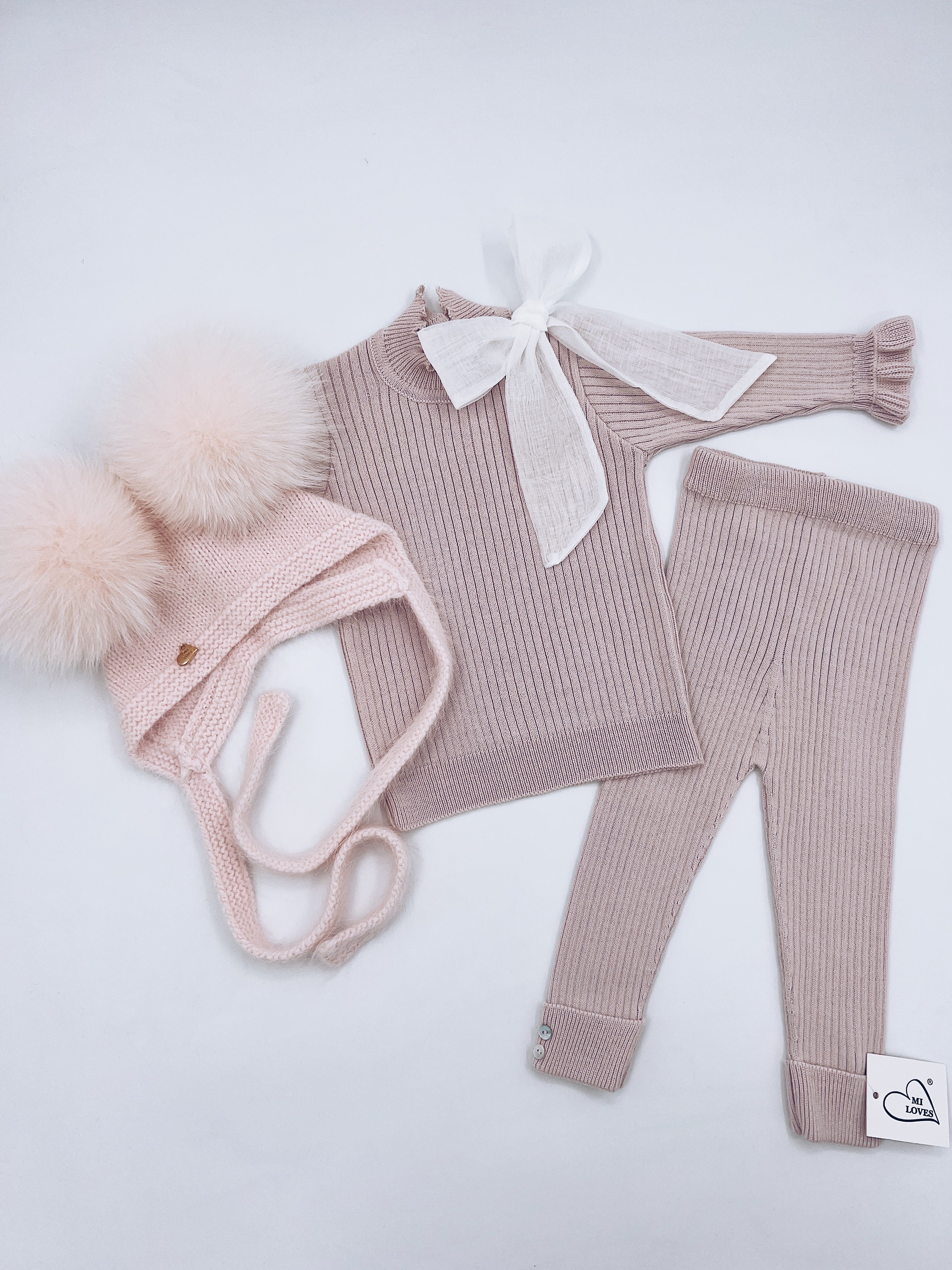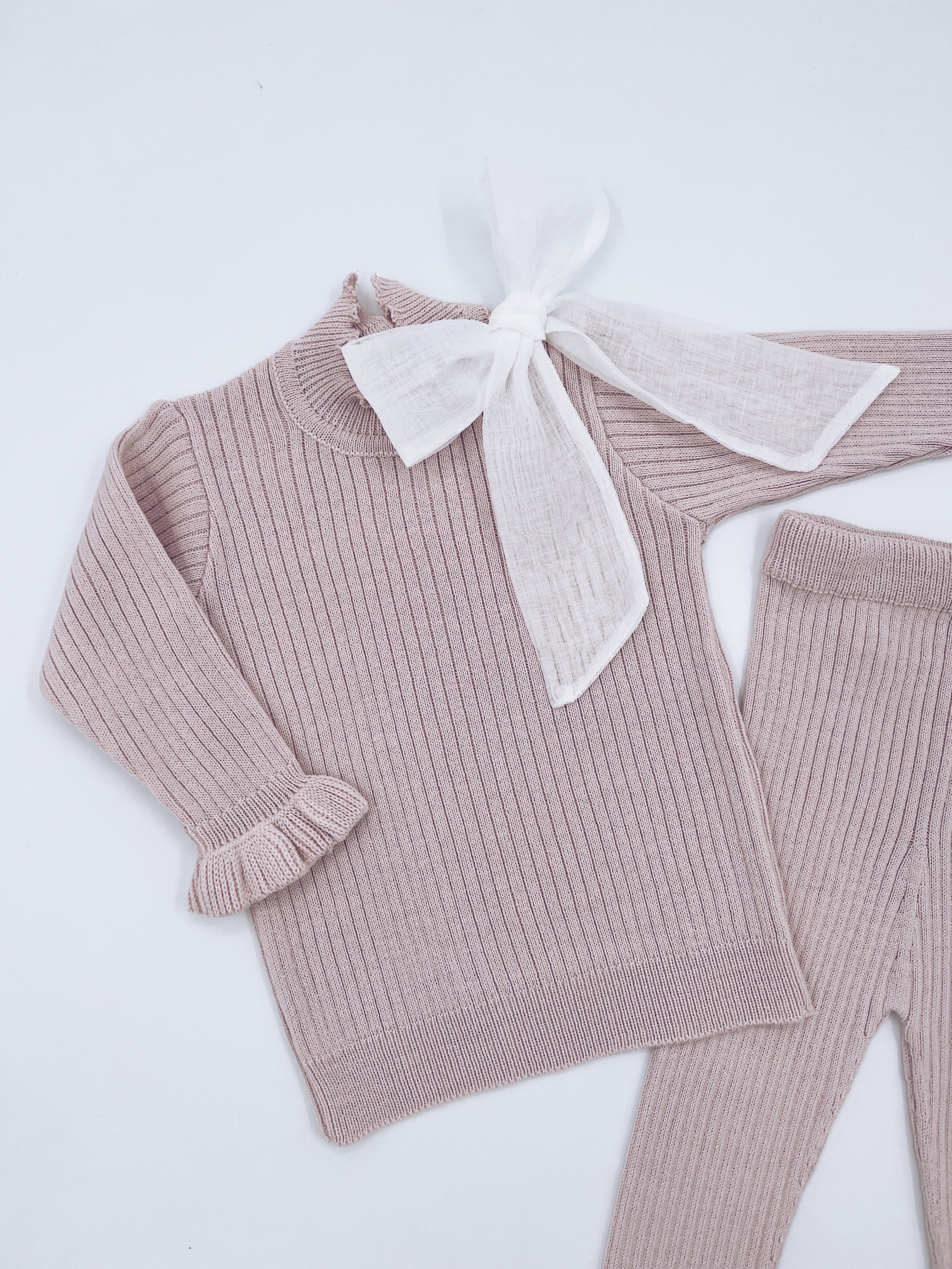 MI LOVES Signature Beautiful Dusty pink knitted ribbed leggings 2 piece set with Fabulous Bow details,high neck and frill details on the sleeves.