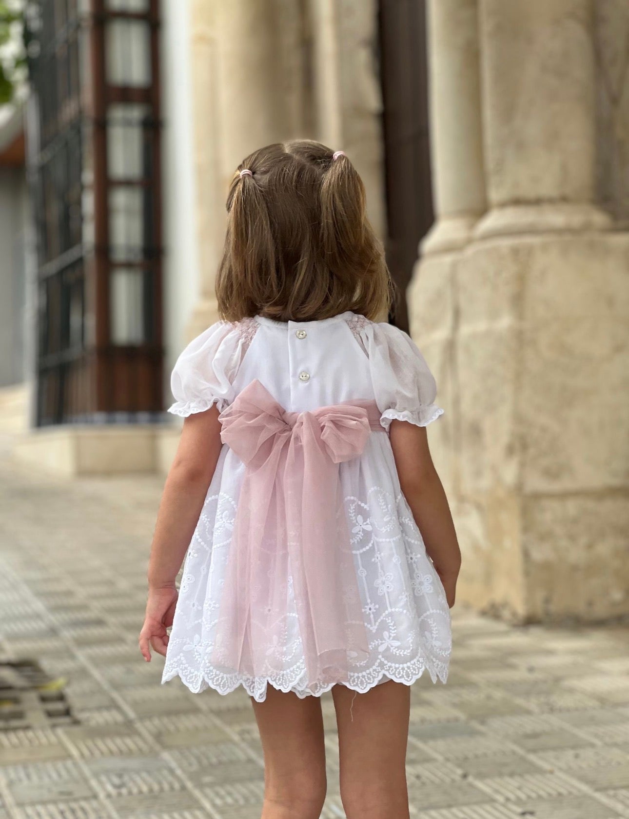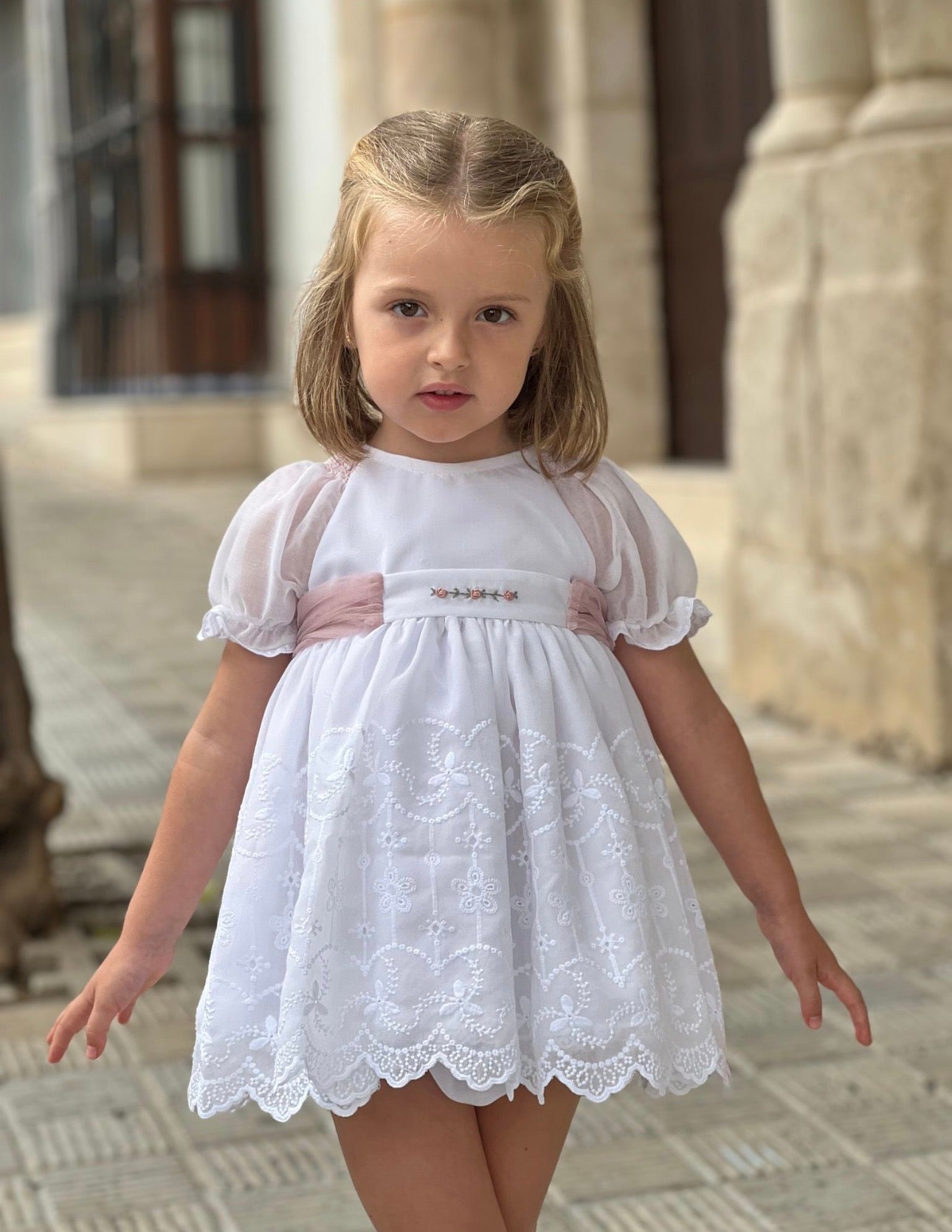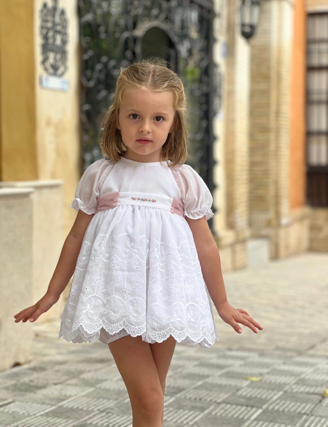 PRE ORDER(Delivery Last week of February)MI LOVES SIGNATURE White dress/bloomers set with Beautiful lace, embroidery and bow details.