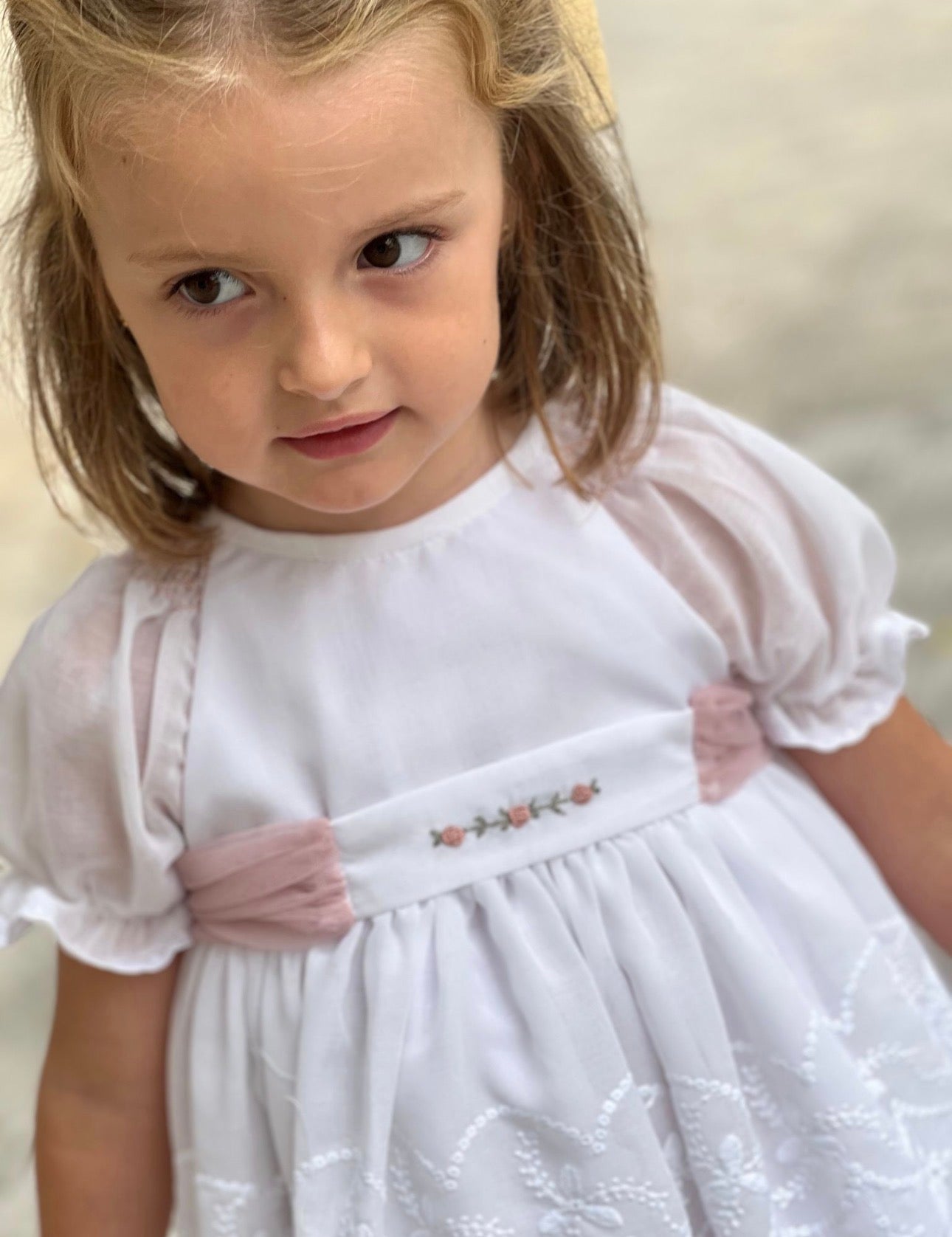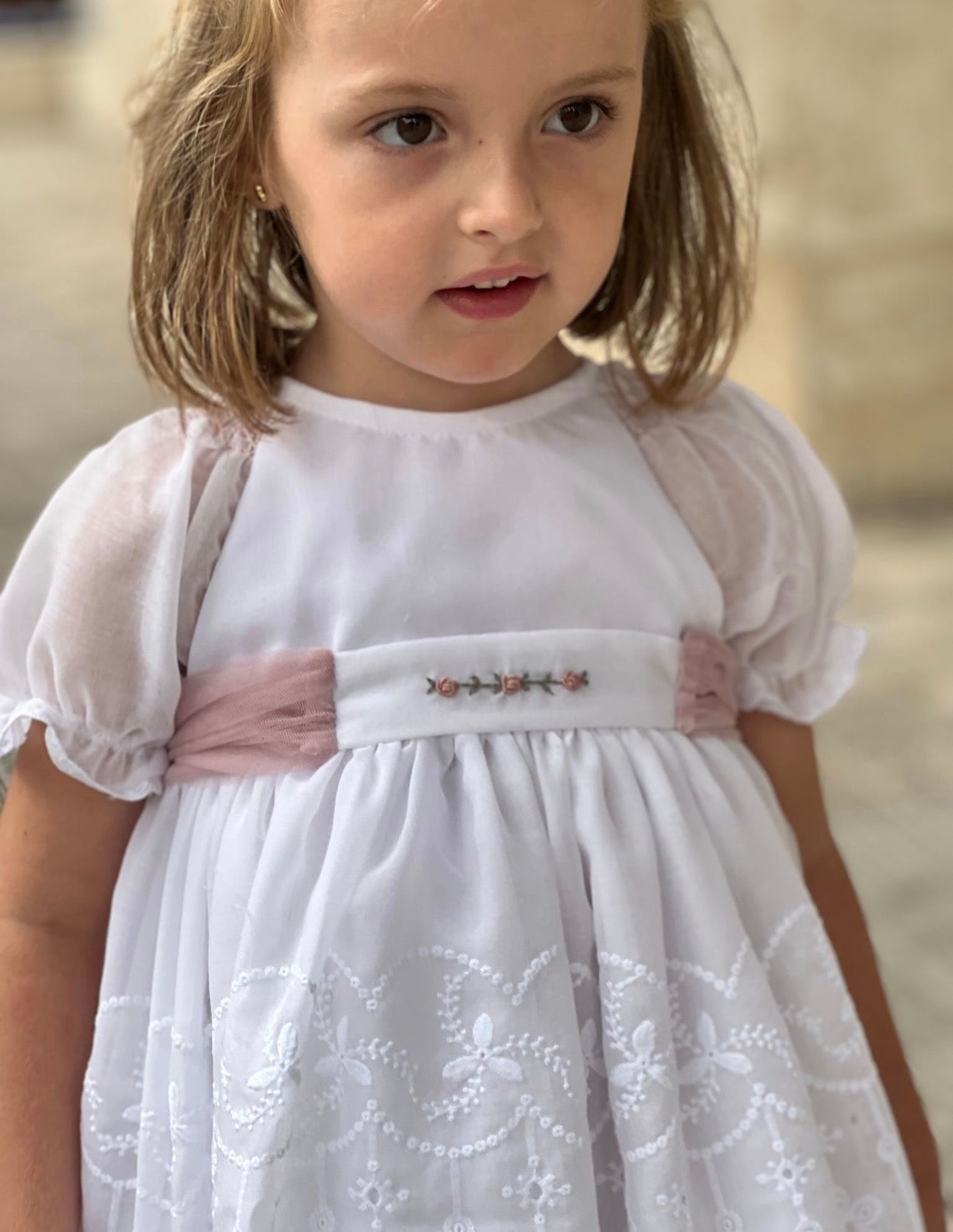 PRE ORDER(Delivery Last week of February)MI LOVES SIGNATURE White dress/bloomers set with Beautiful lace,embroidery and bow details.