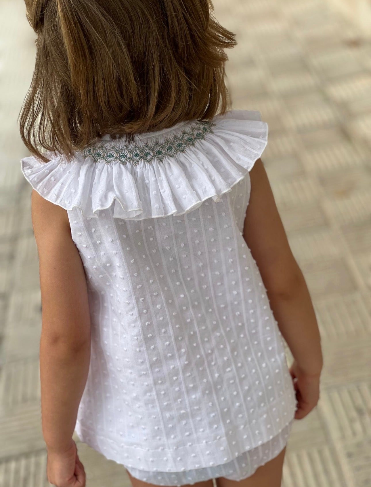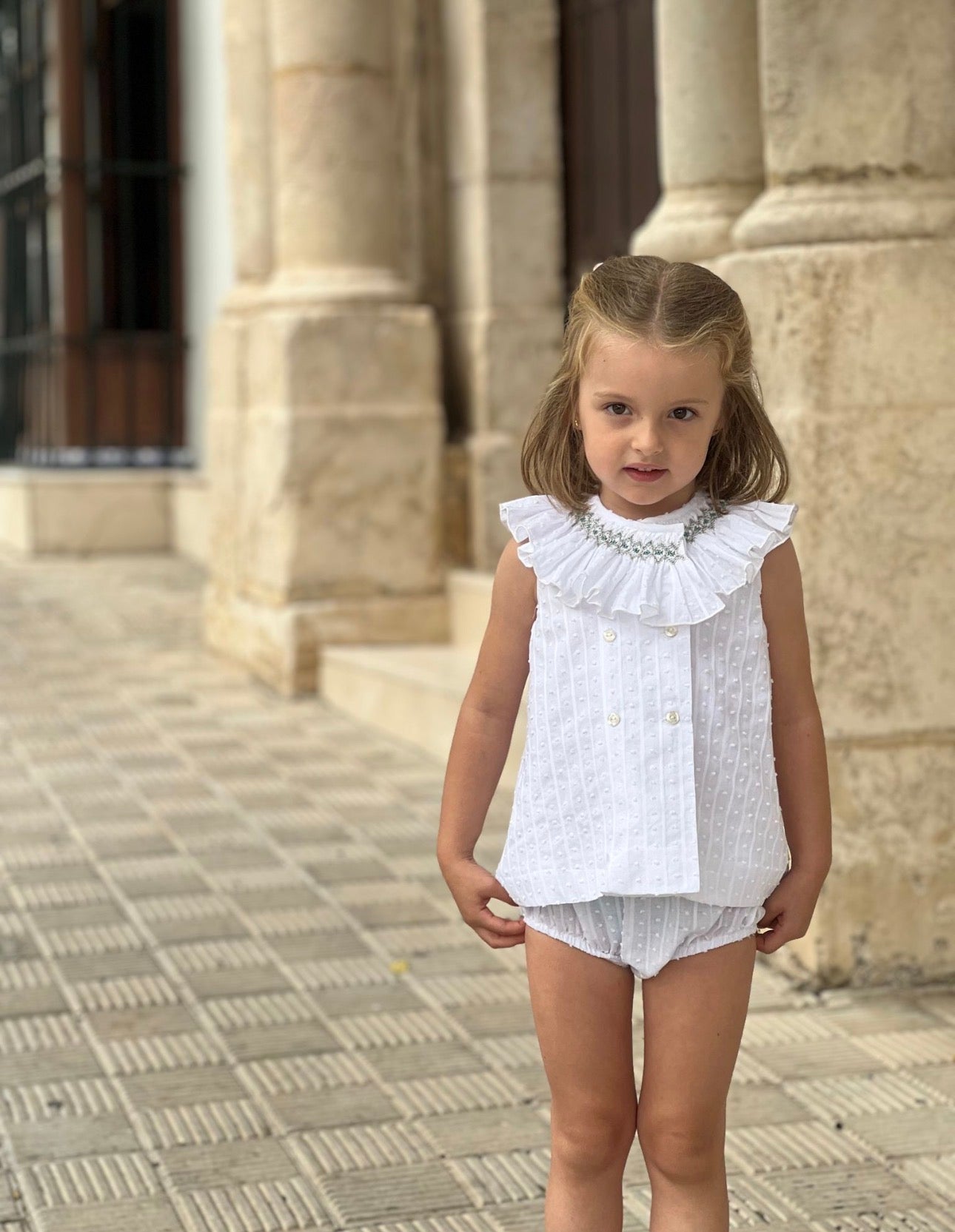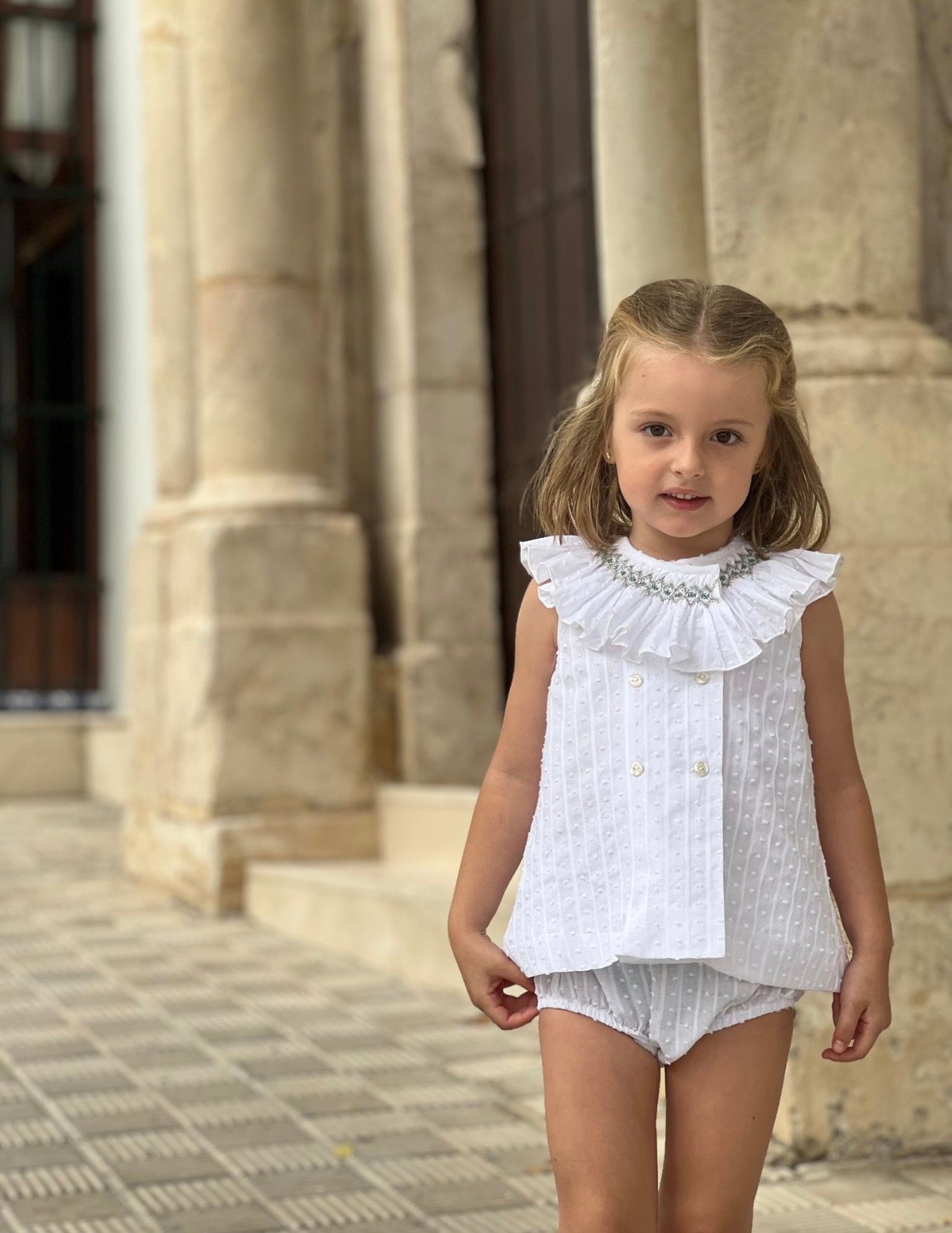 MI LOVES SIGNATURE Short White dress/bloomers set with Beautiful Hand Smoked Collar details.
