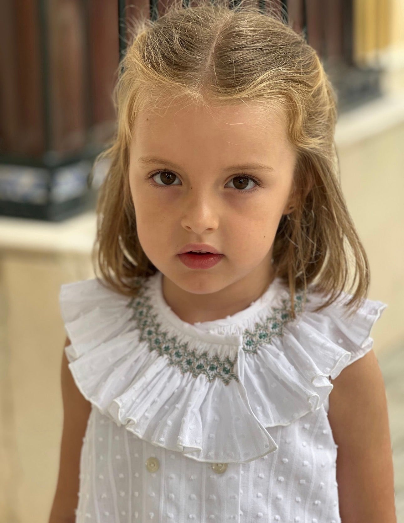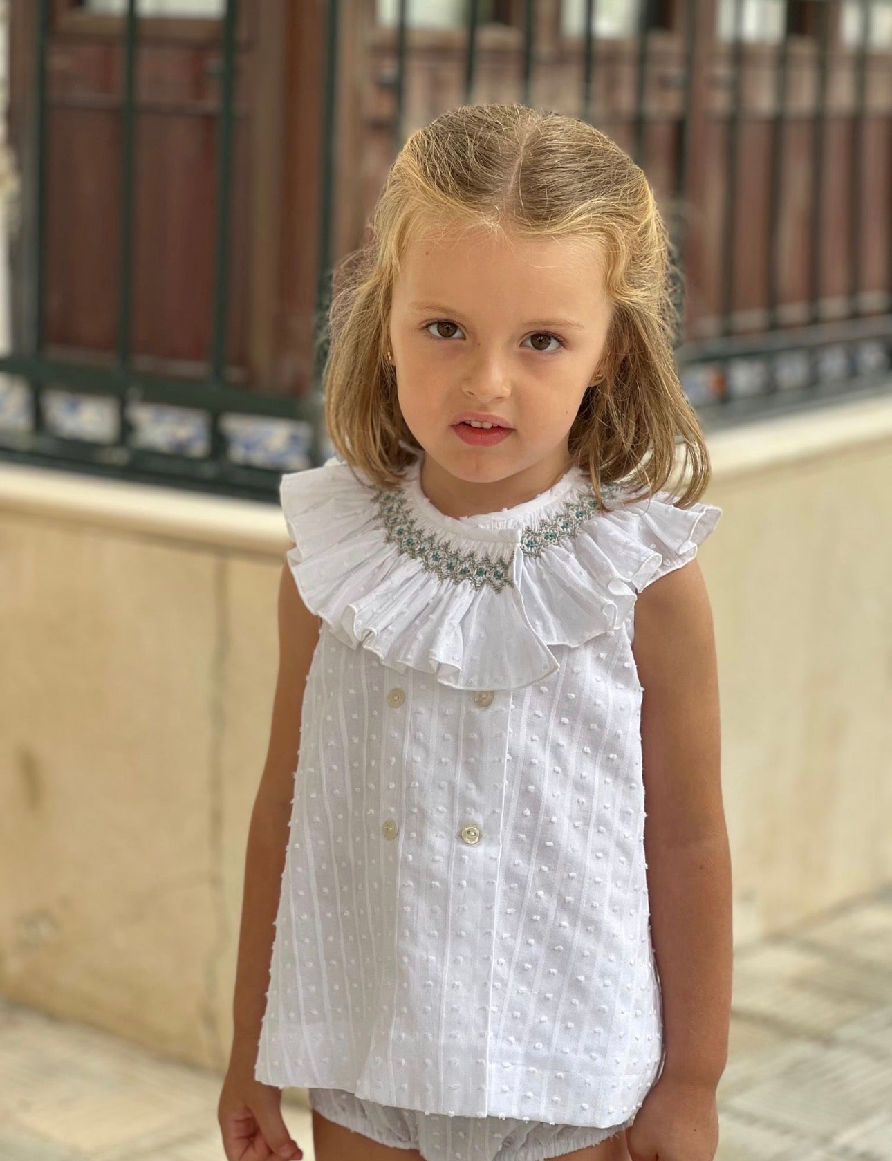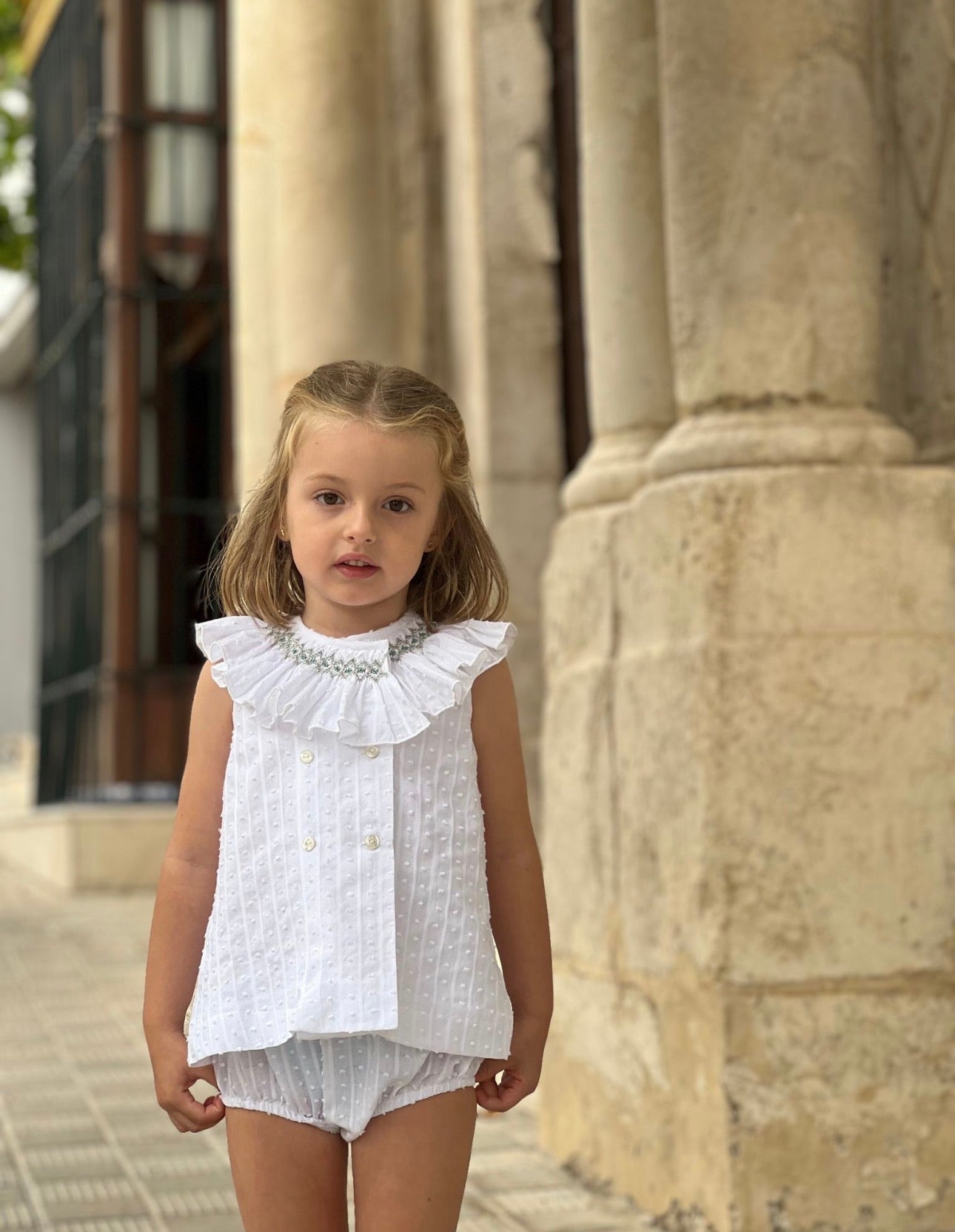 MI LOVES SIGNATURE Short White dress/bloomers set with Beautiful Hand Smoked Collar details.