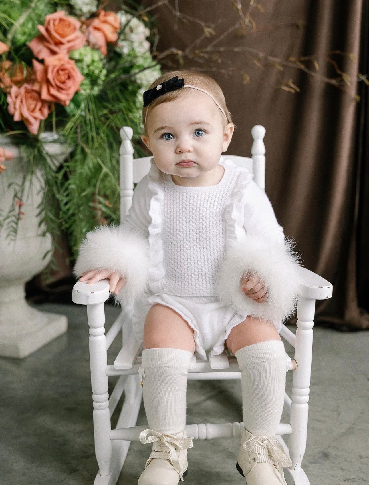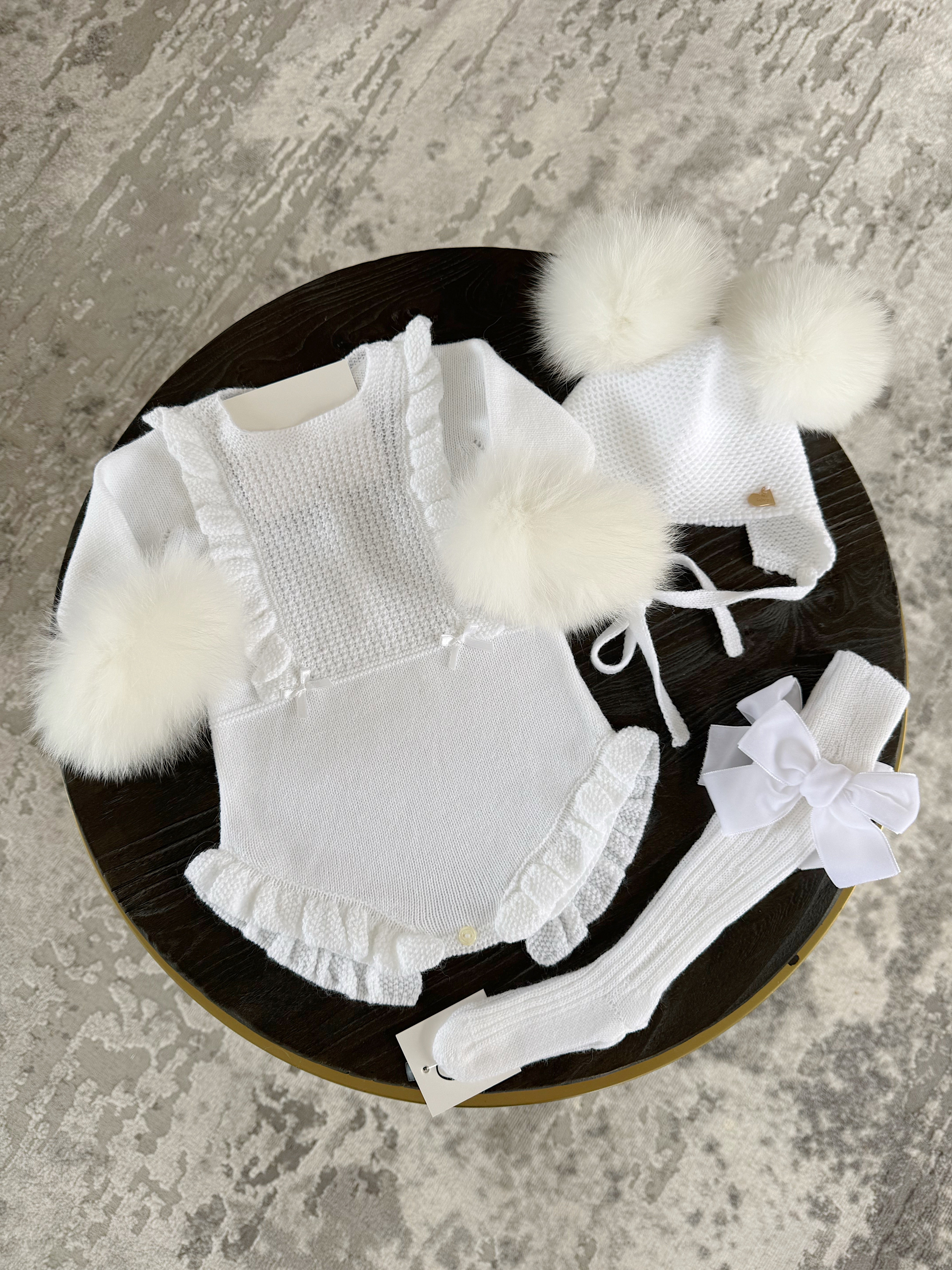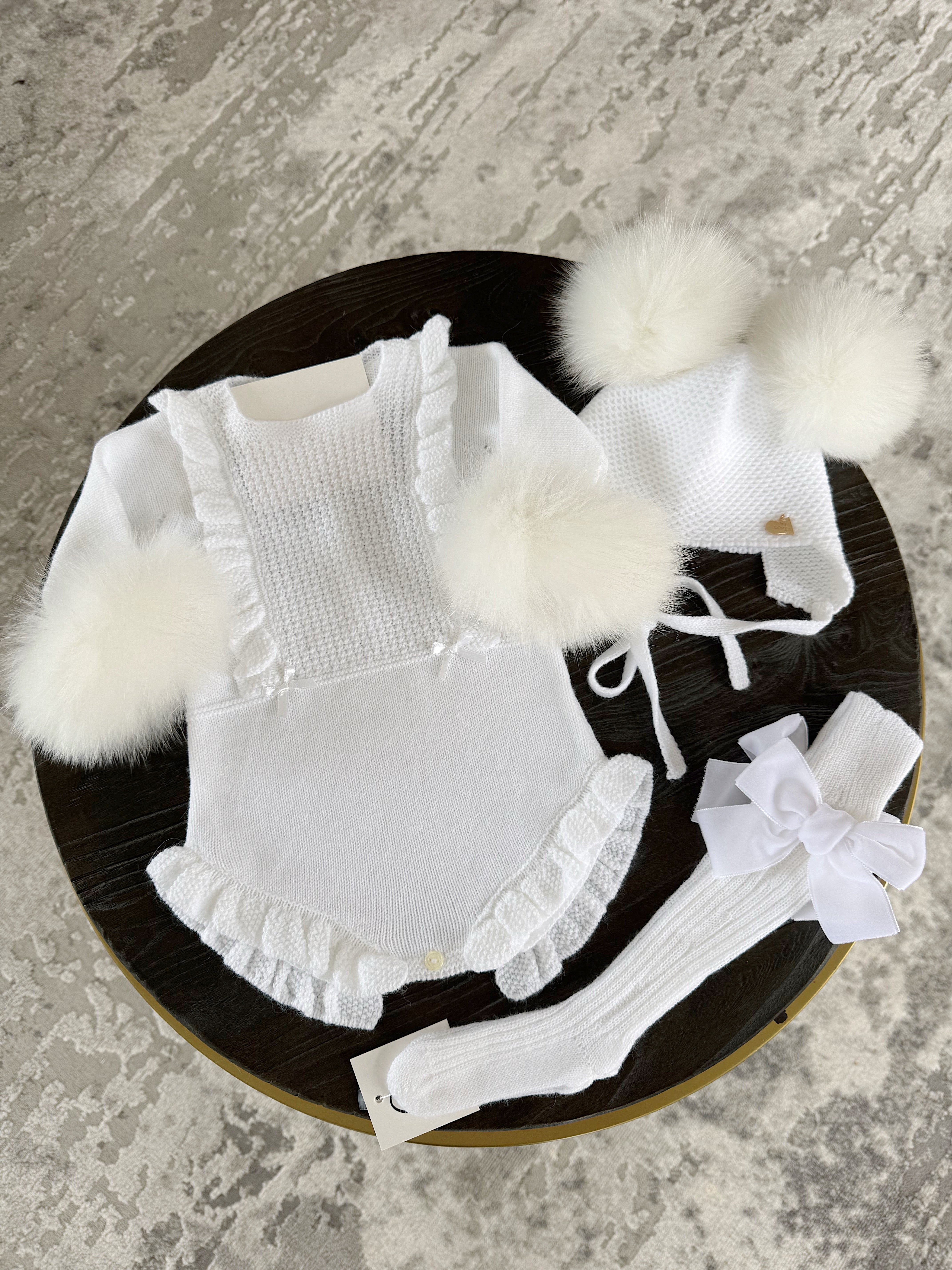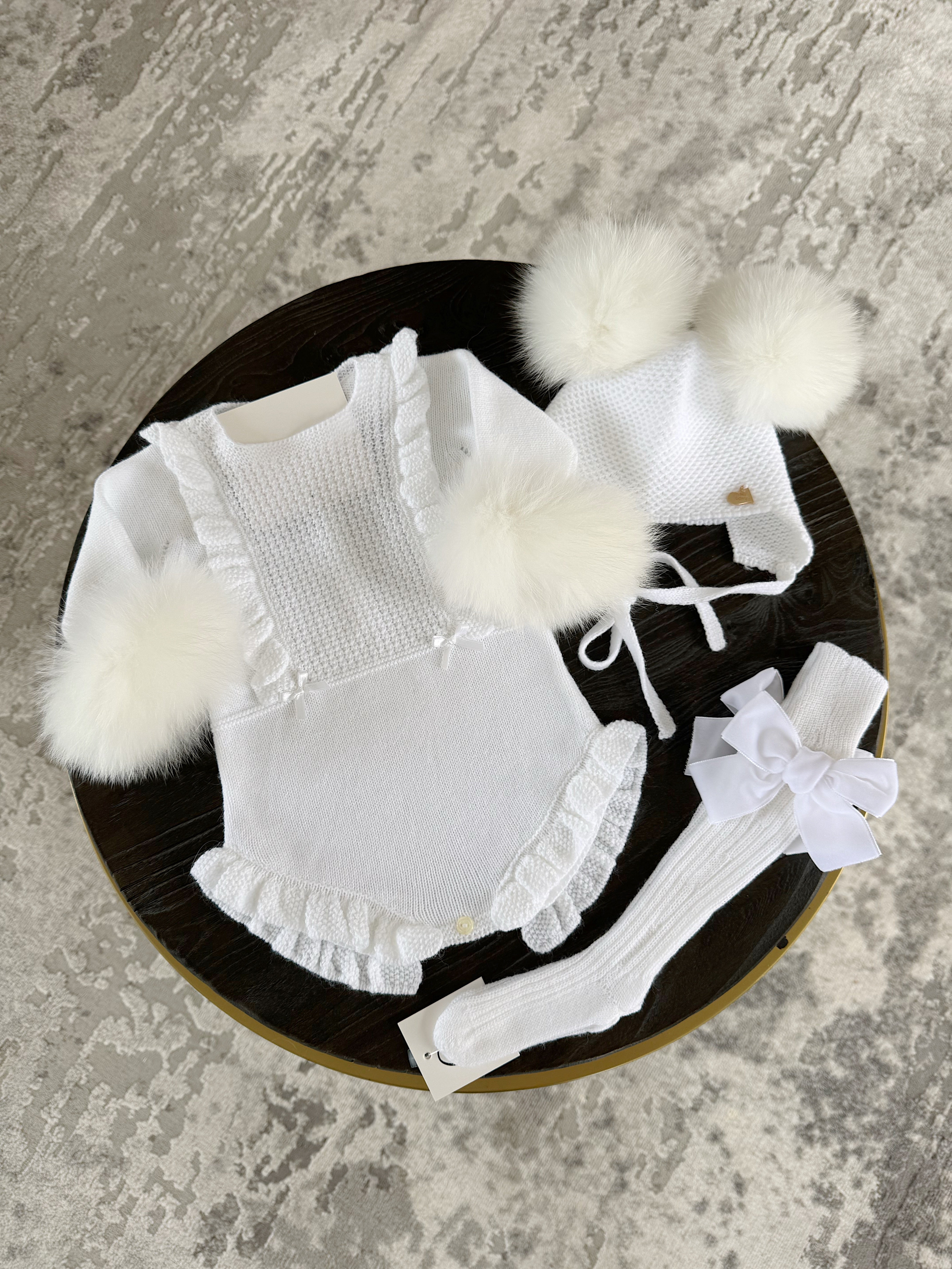 White/Ivory Knitted Romper with fox fur trim on the sleeves