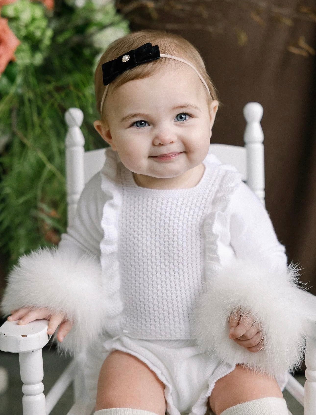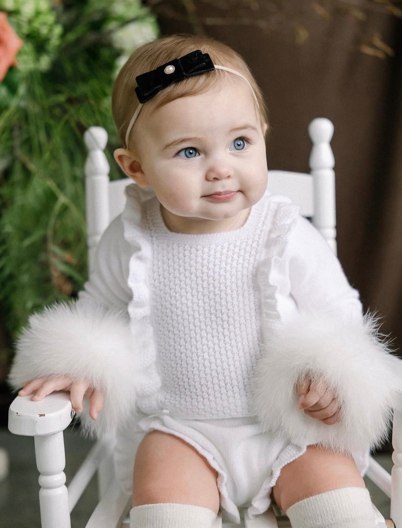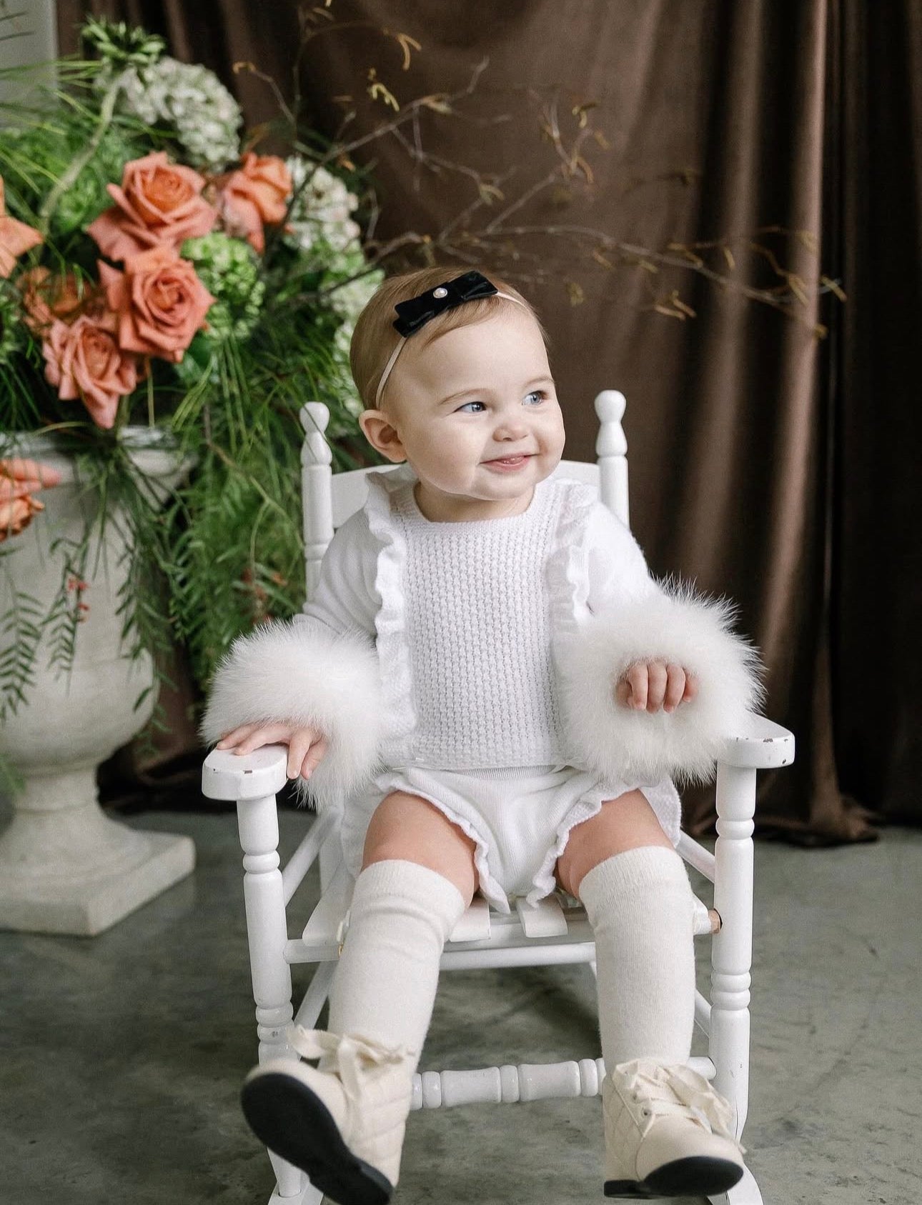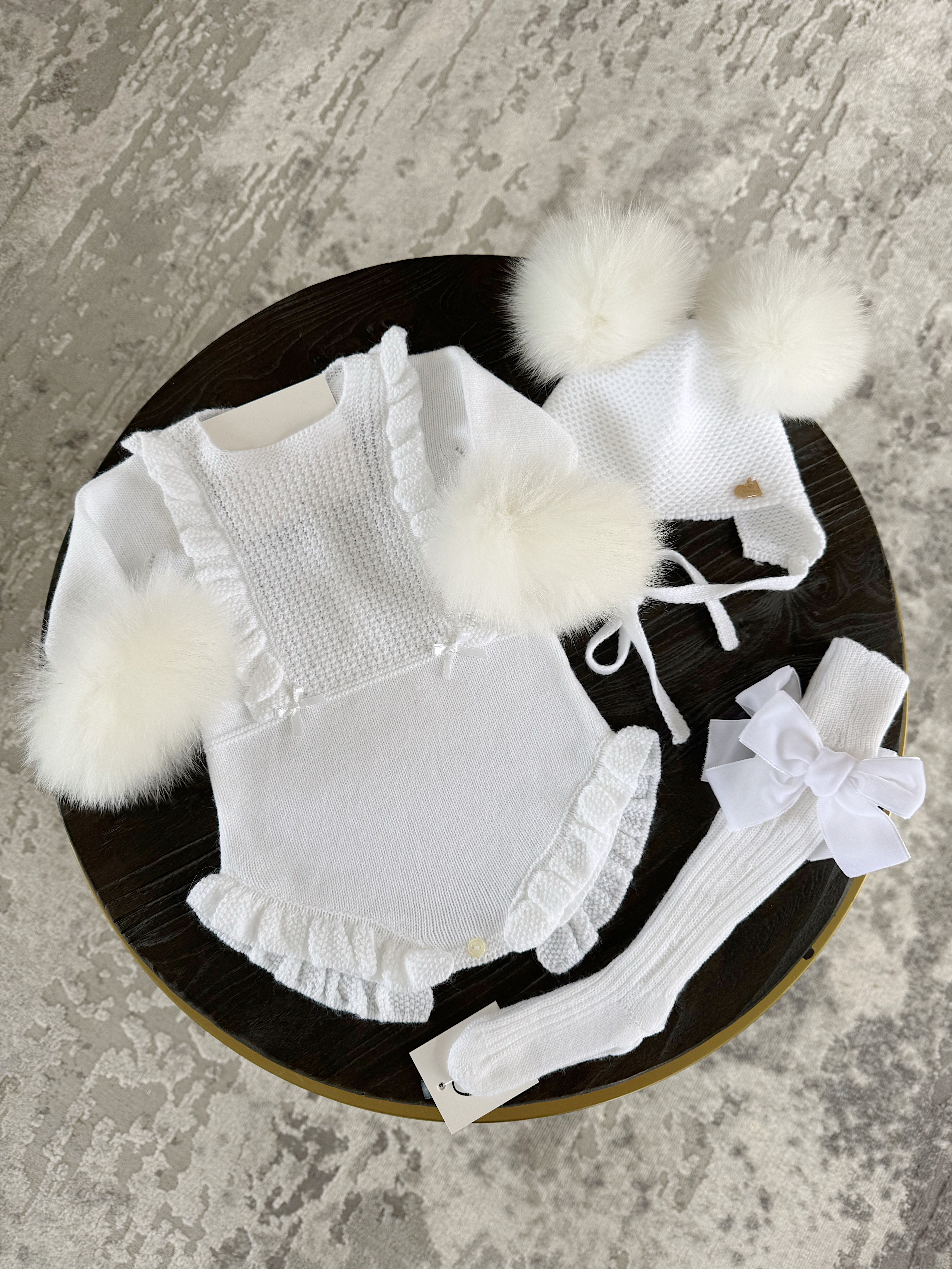 White/Ivory Knitted Romper with fox fur trim on the sleeves