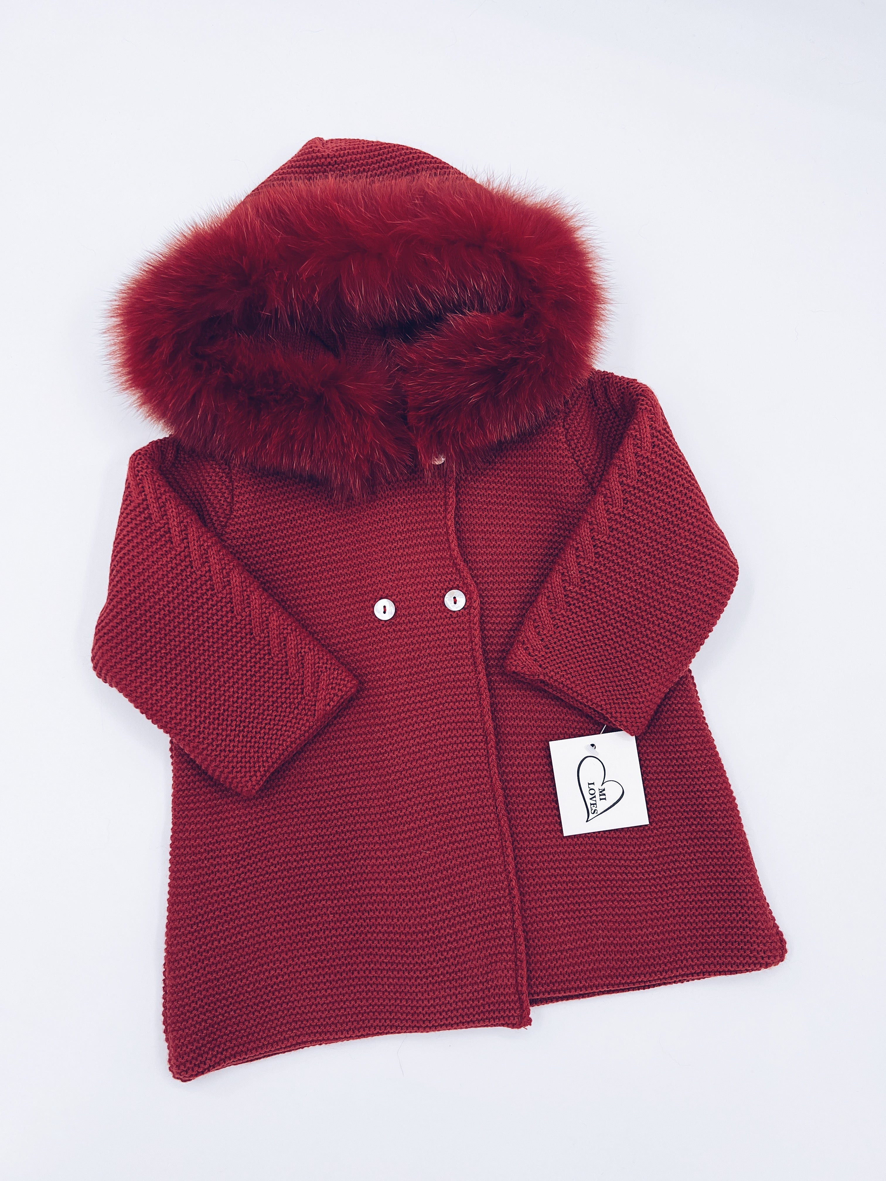 MI LOVES Beautiful Burgundy Long line Girls Knitted Cardigan with Luxurious fur trim.