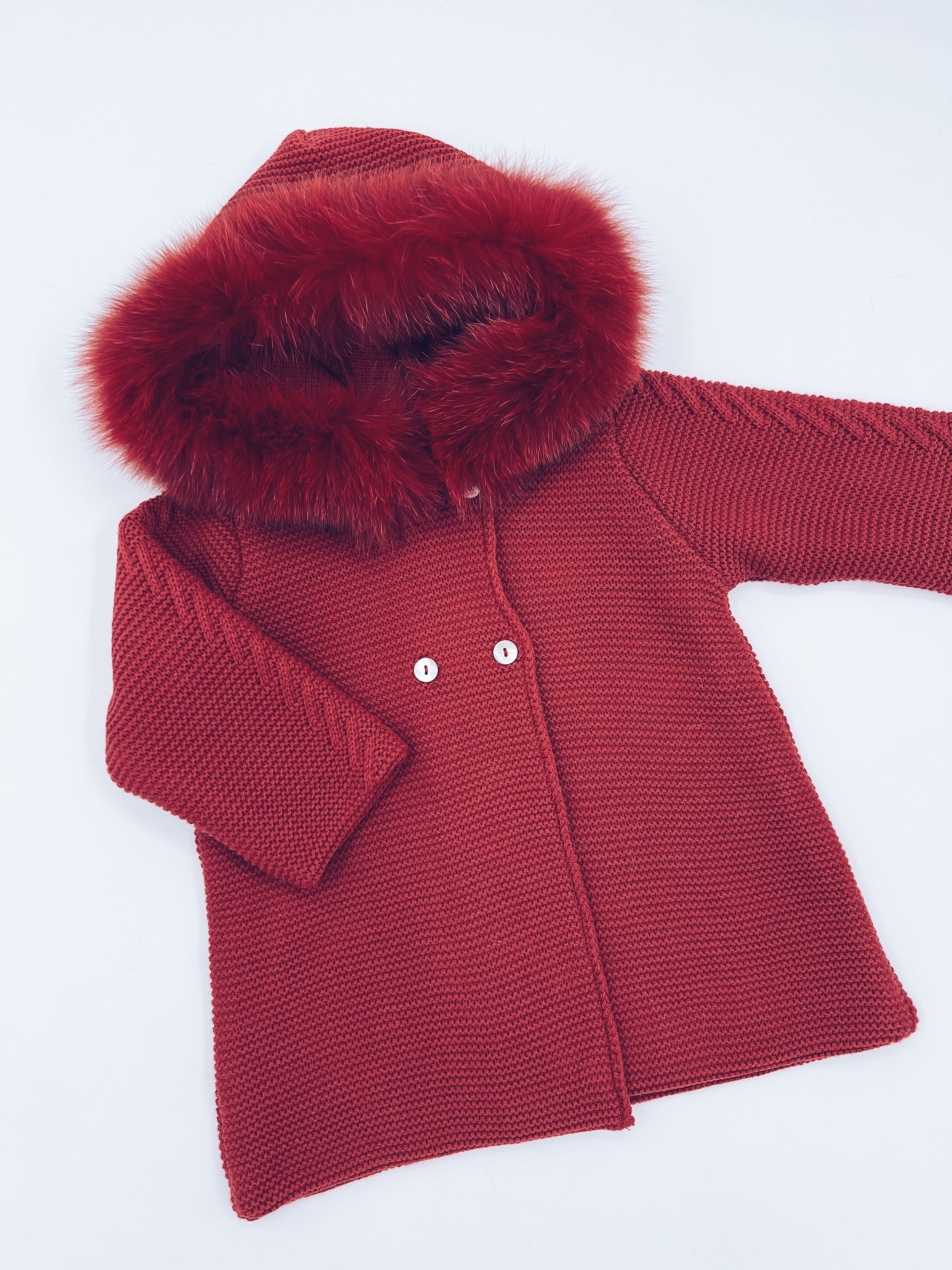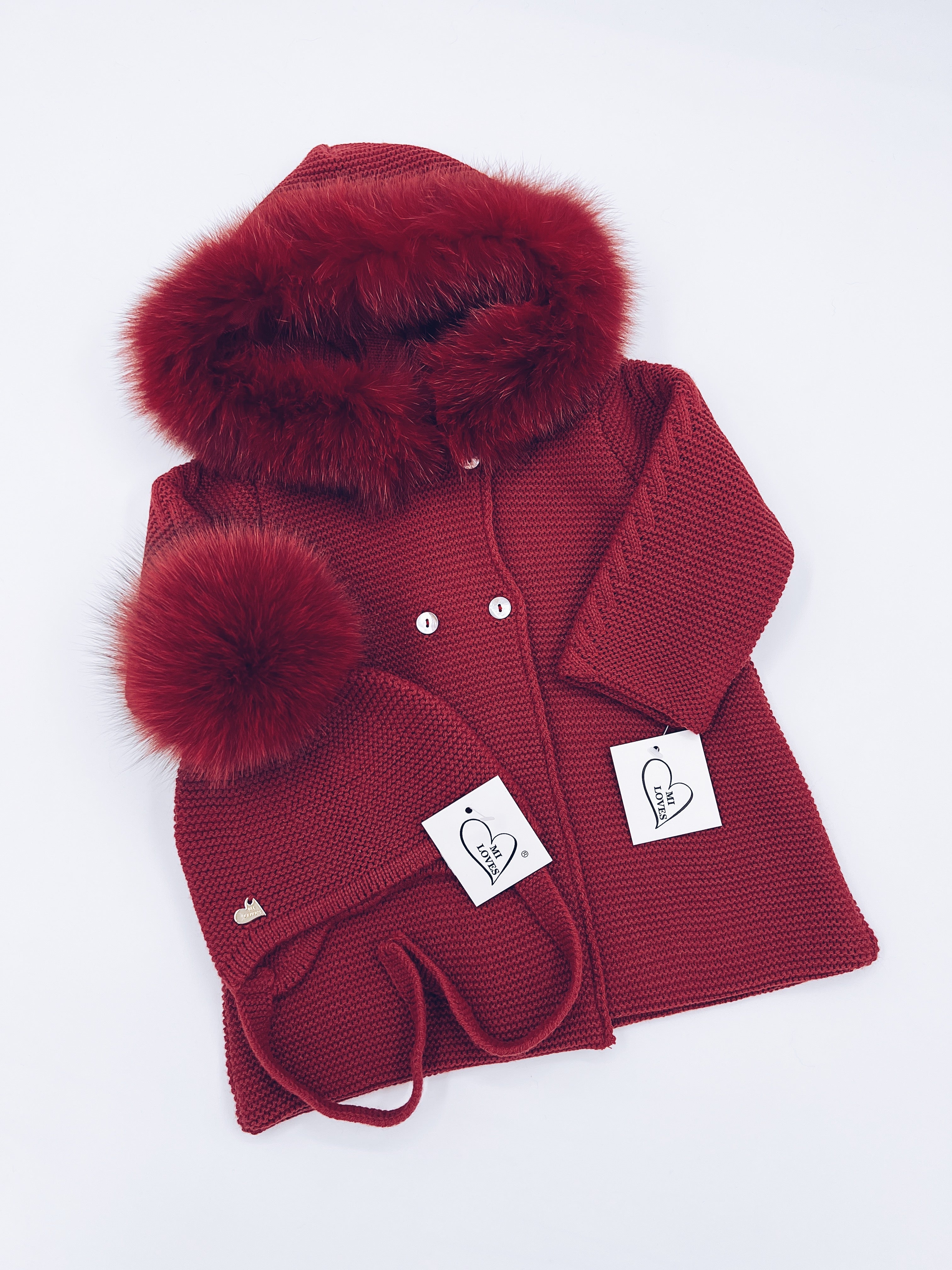 Beautiful Burgundy Long line Girls Knitted Cardigan with Luxurious fur trim.