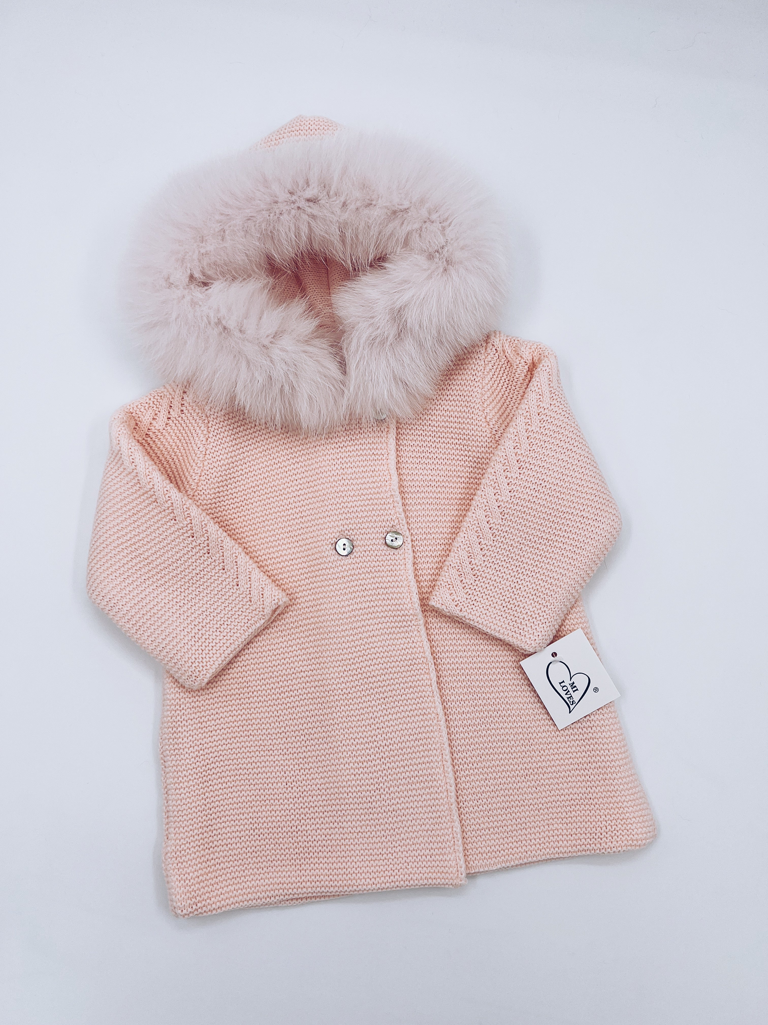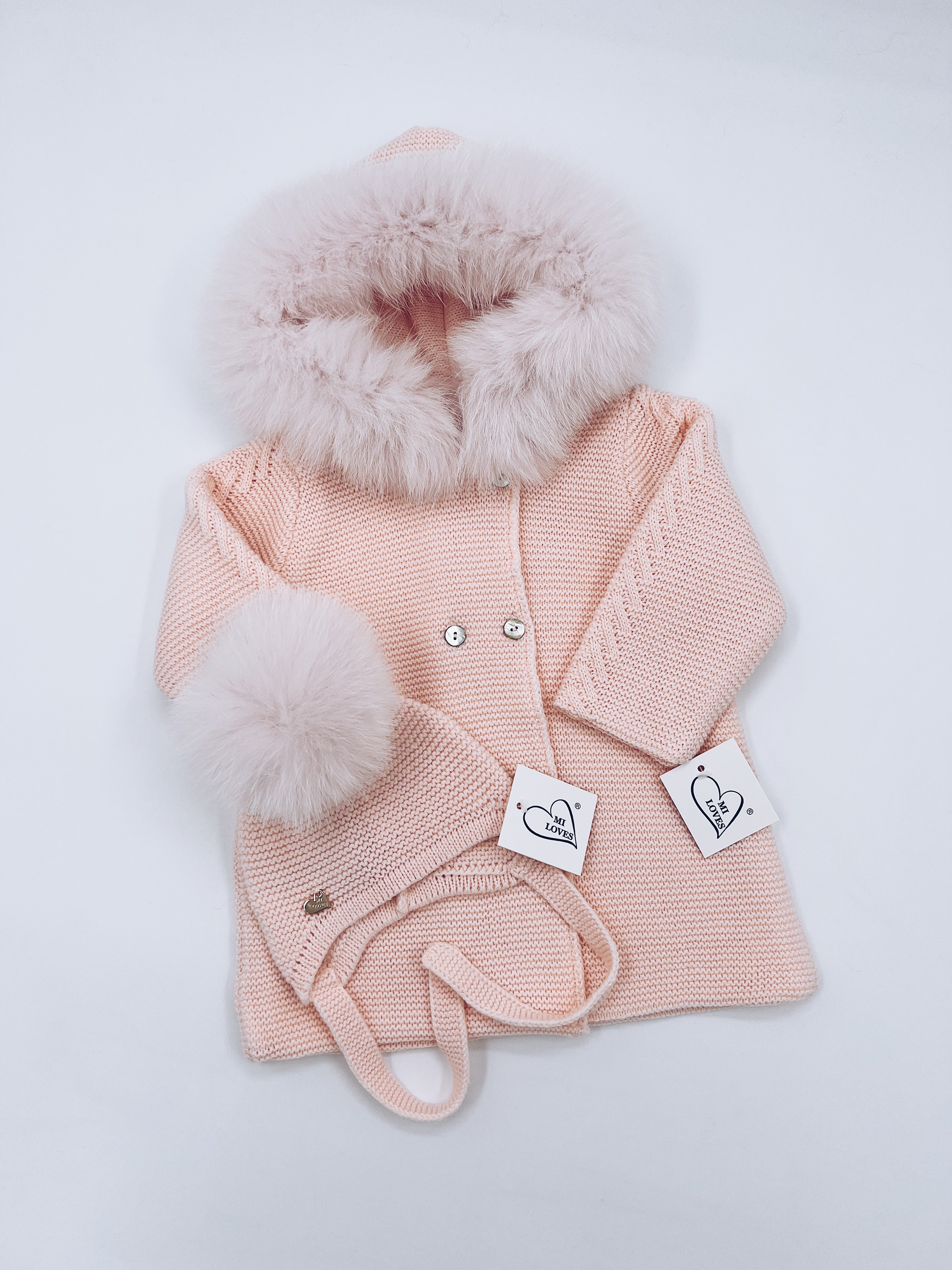 MI LOVES Beautiful Pink Long line Girls Knitted Cardigan with Luxurious fur trim.