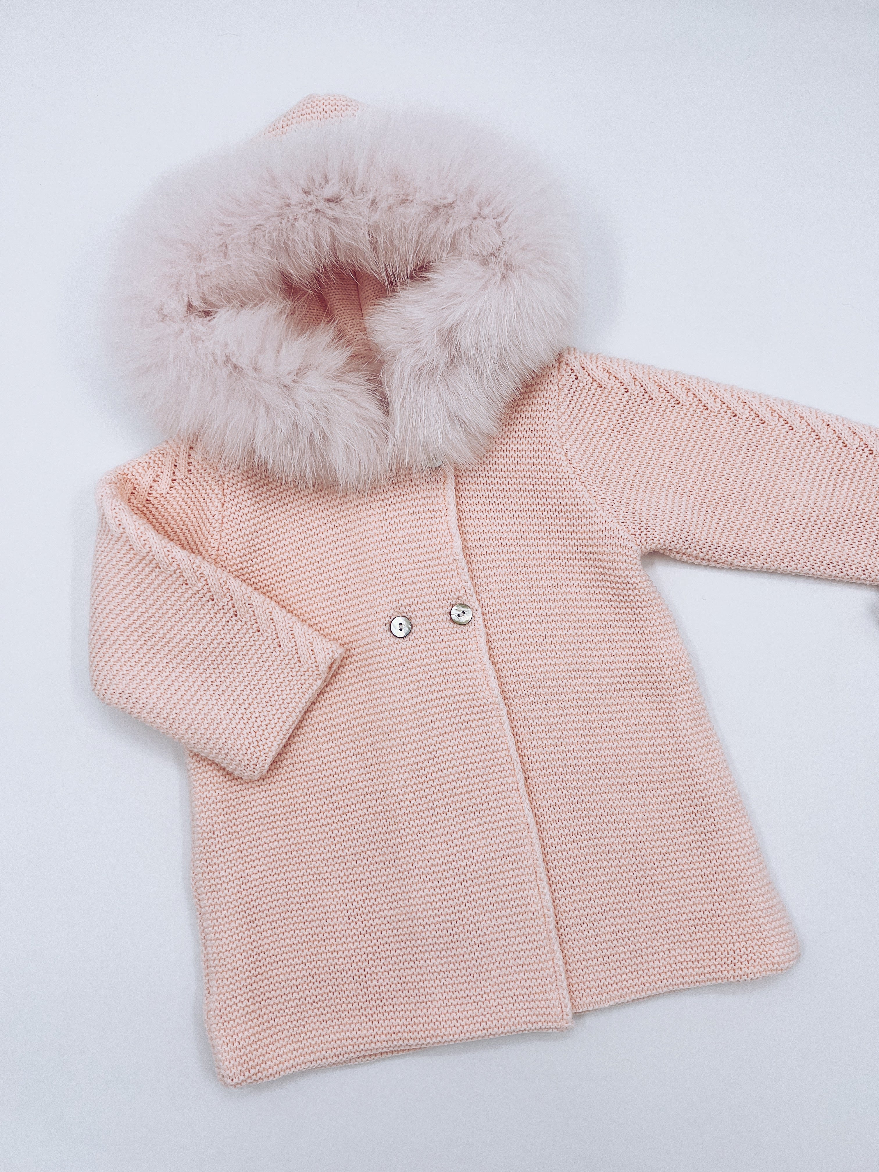 Beautiful Pink Long line Girls Knitted Cardigan with Luxurious fur trim.
