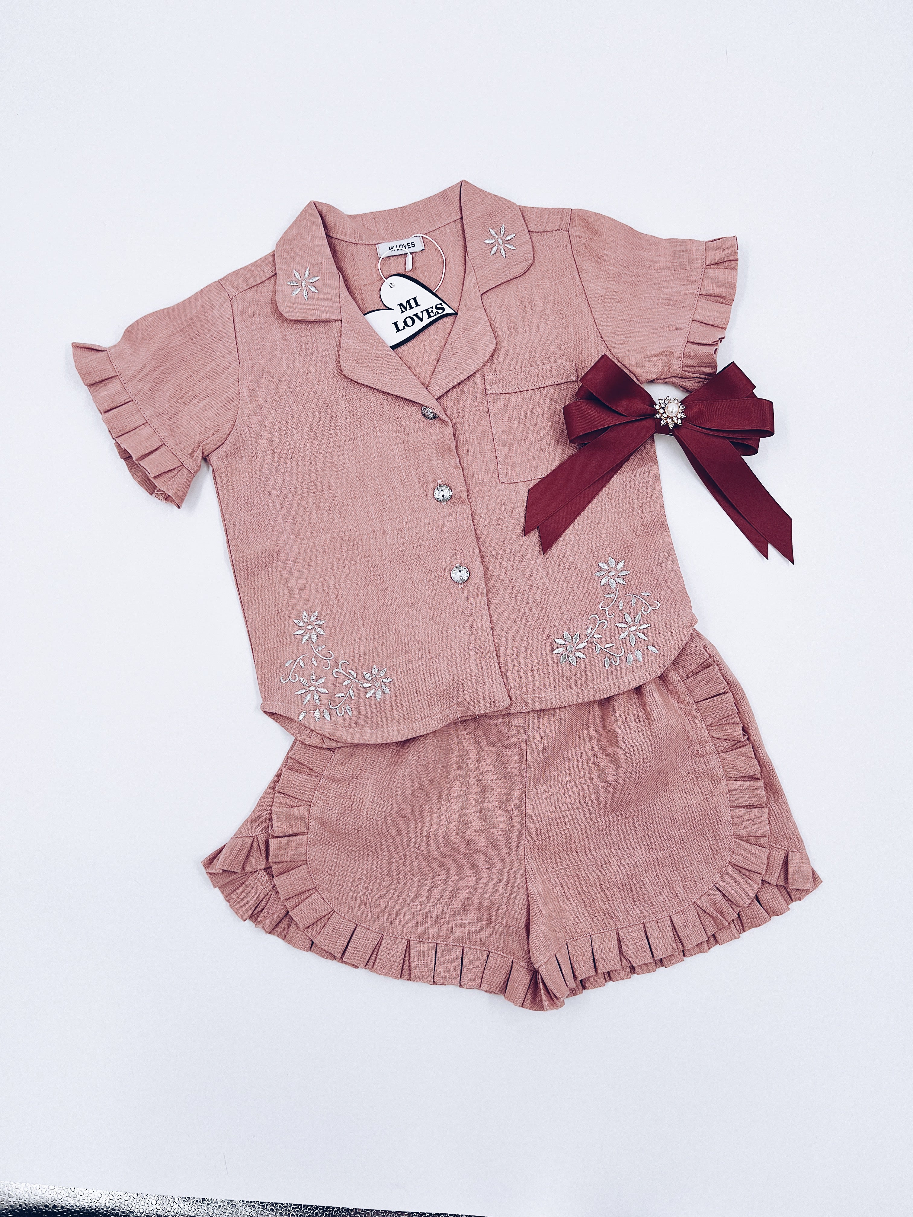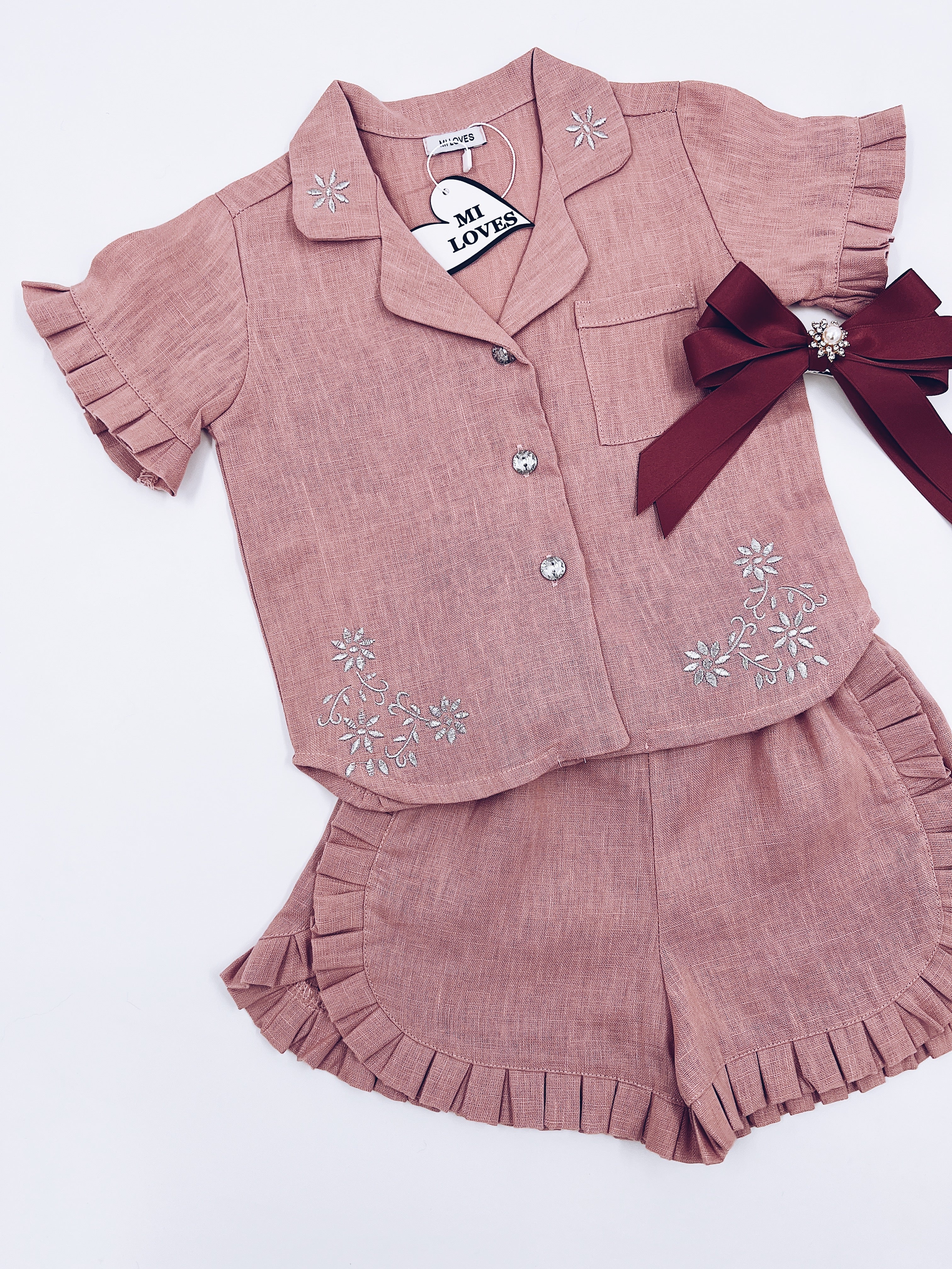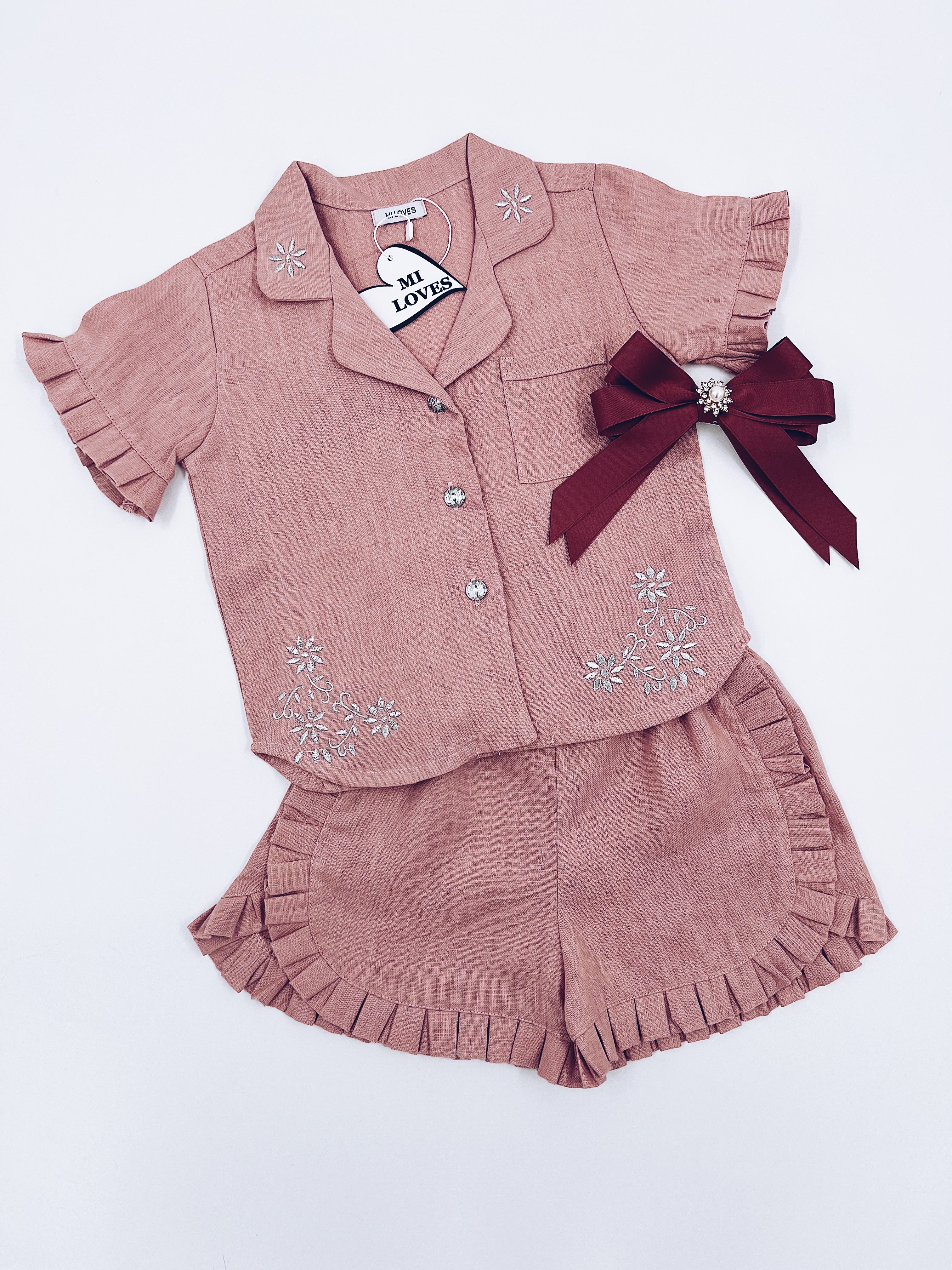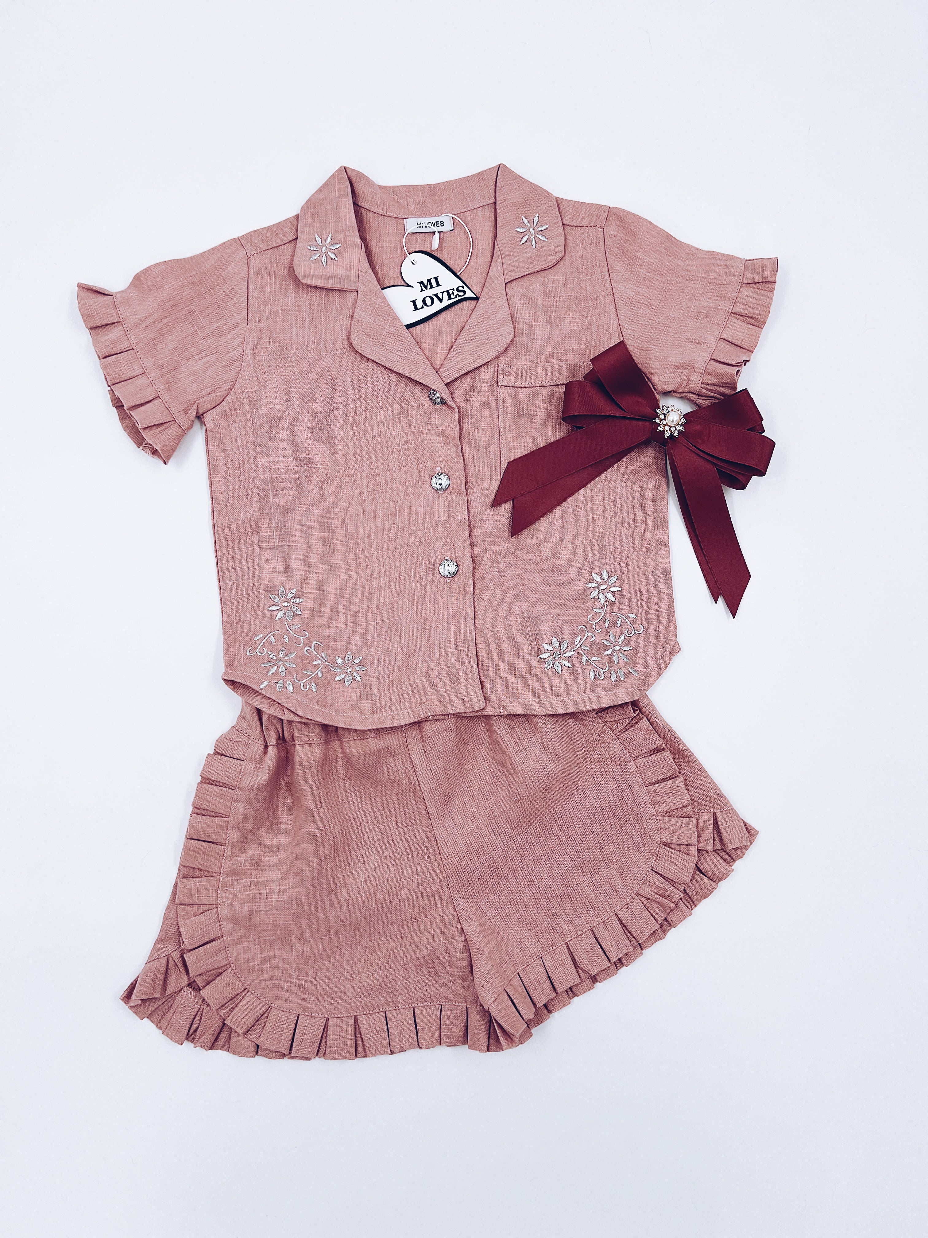 MI LOVES Dusty pink LInen summer kids Co-ord Short set.Essential summer set made from 100% linen with Beautiful embroidery and frill details.perfect for hot summer days.