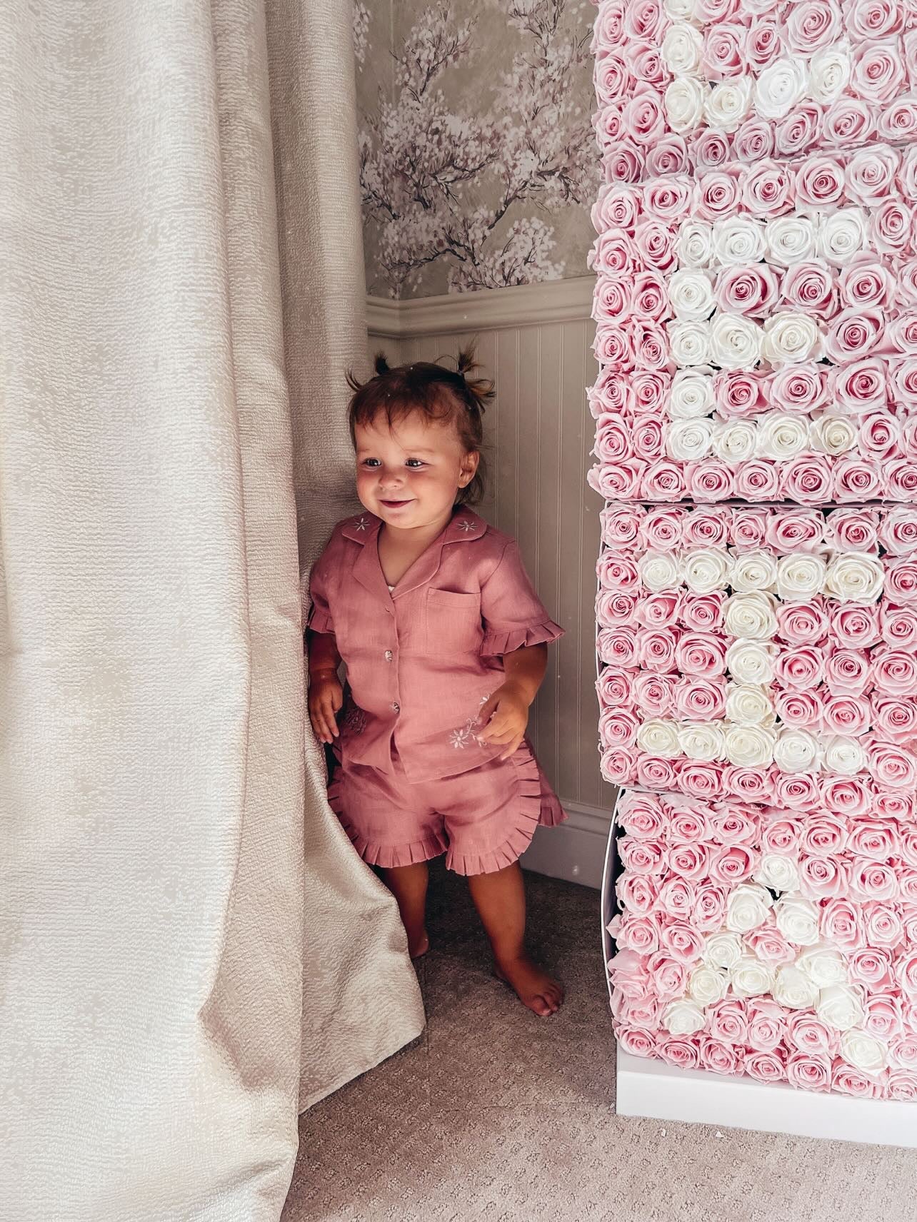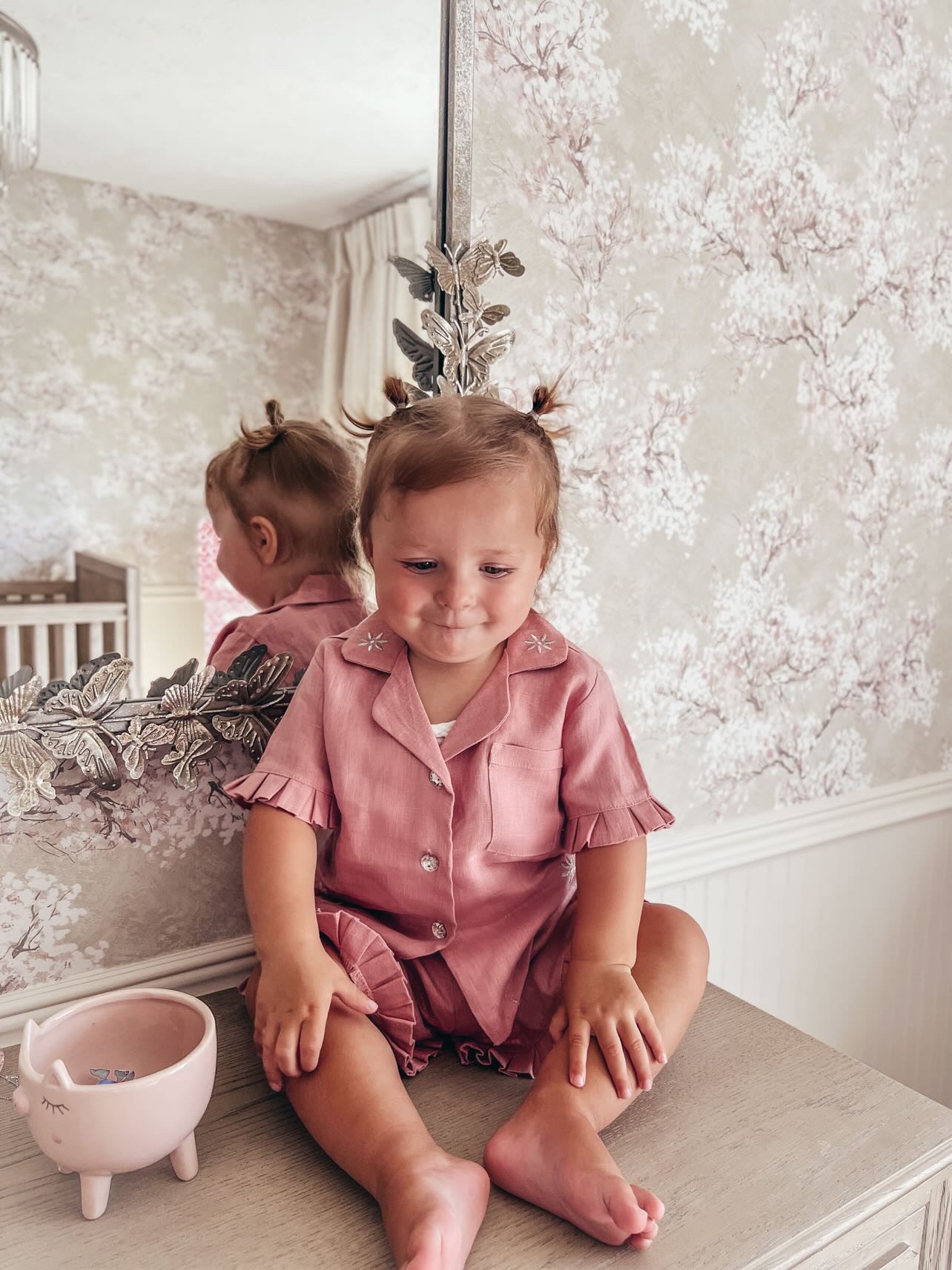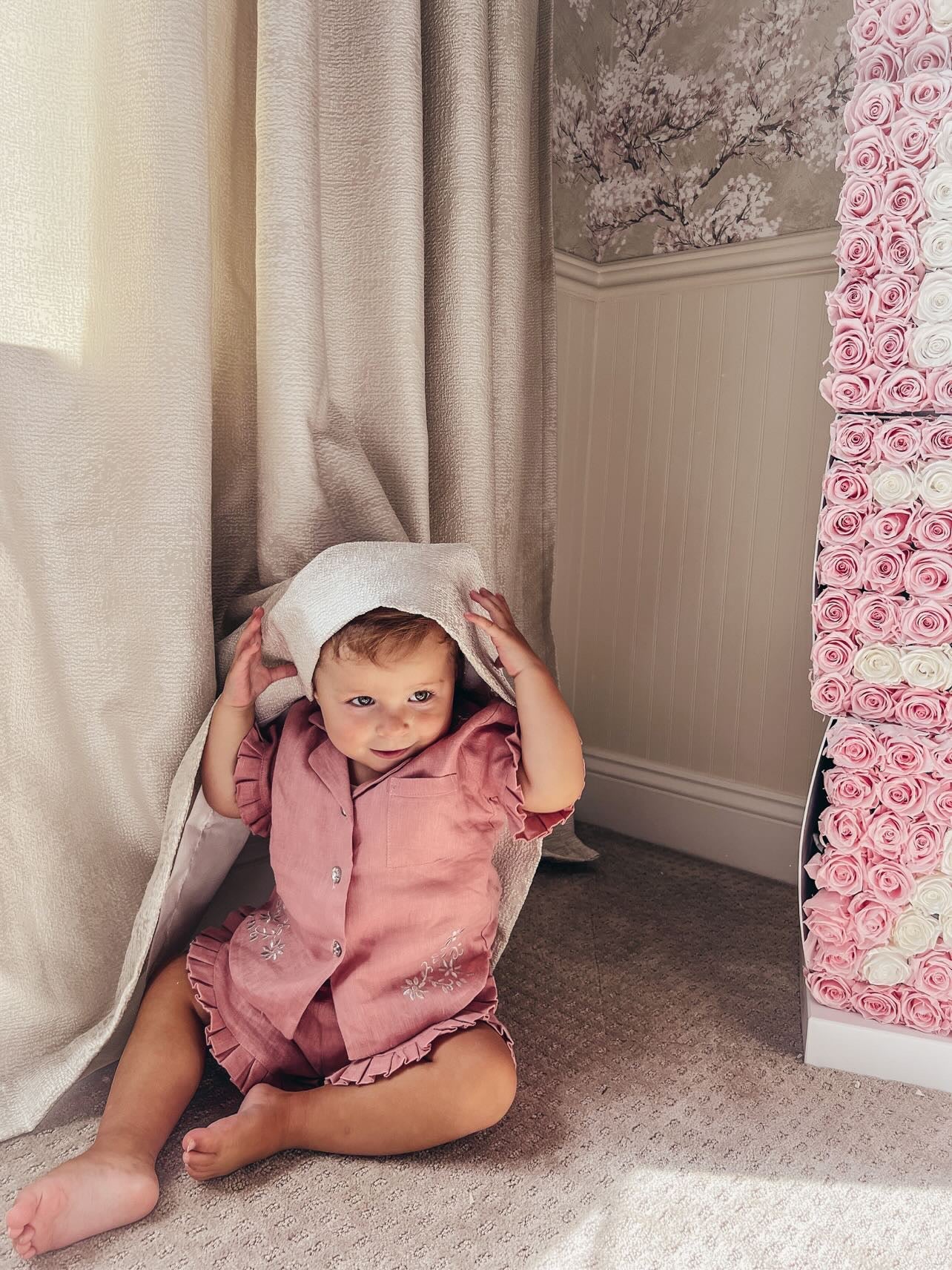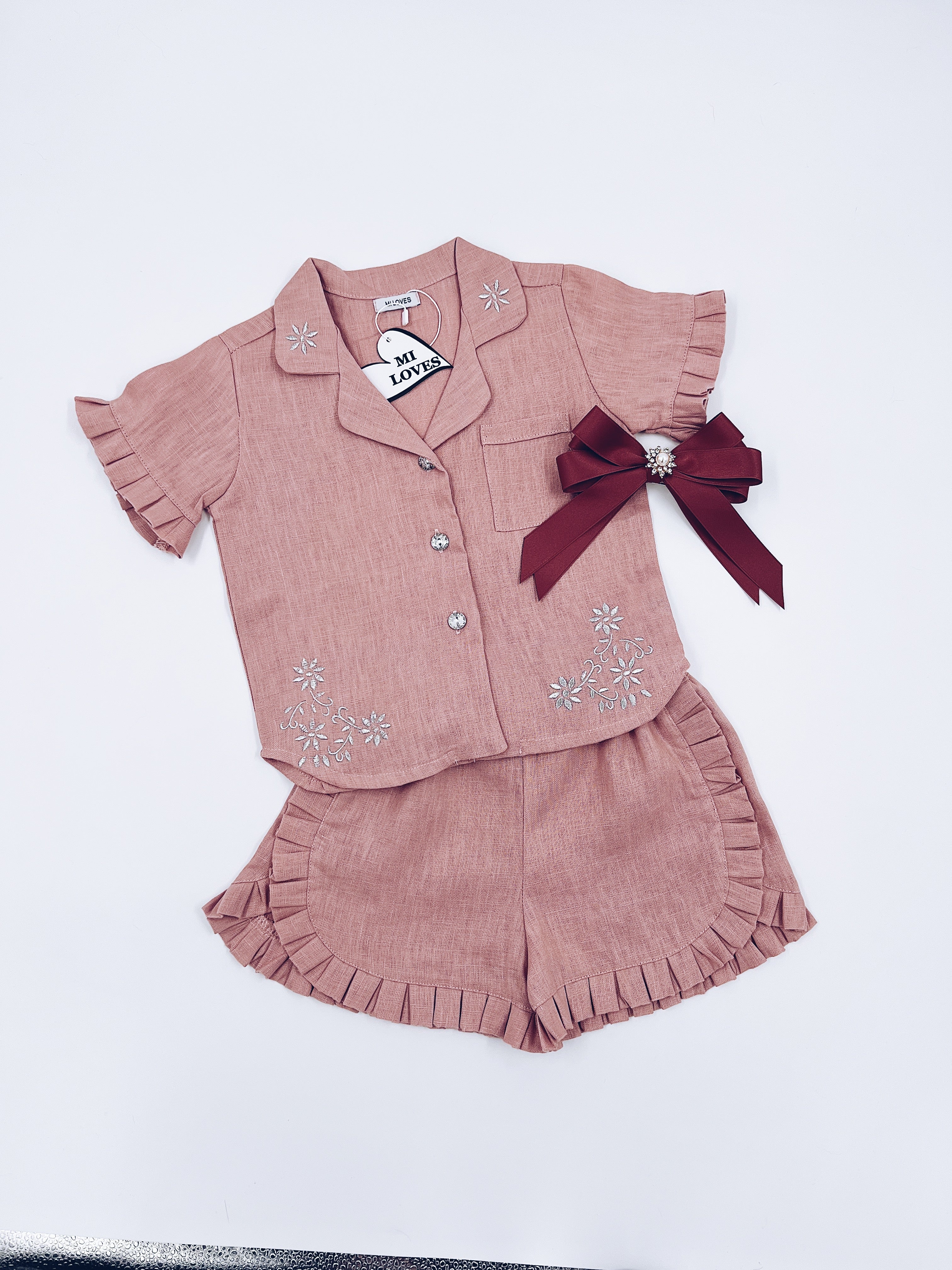 MI LOVES Dusty pink LInen summer kids Co-ord Short set.Essential summer set made from 100% linen with Beautiful embroidery and frill details.perfect for hot summer days.