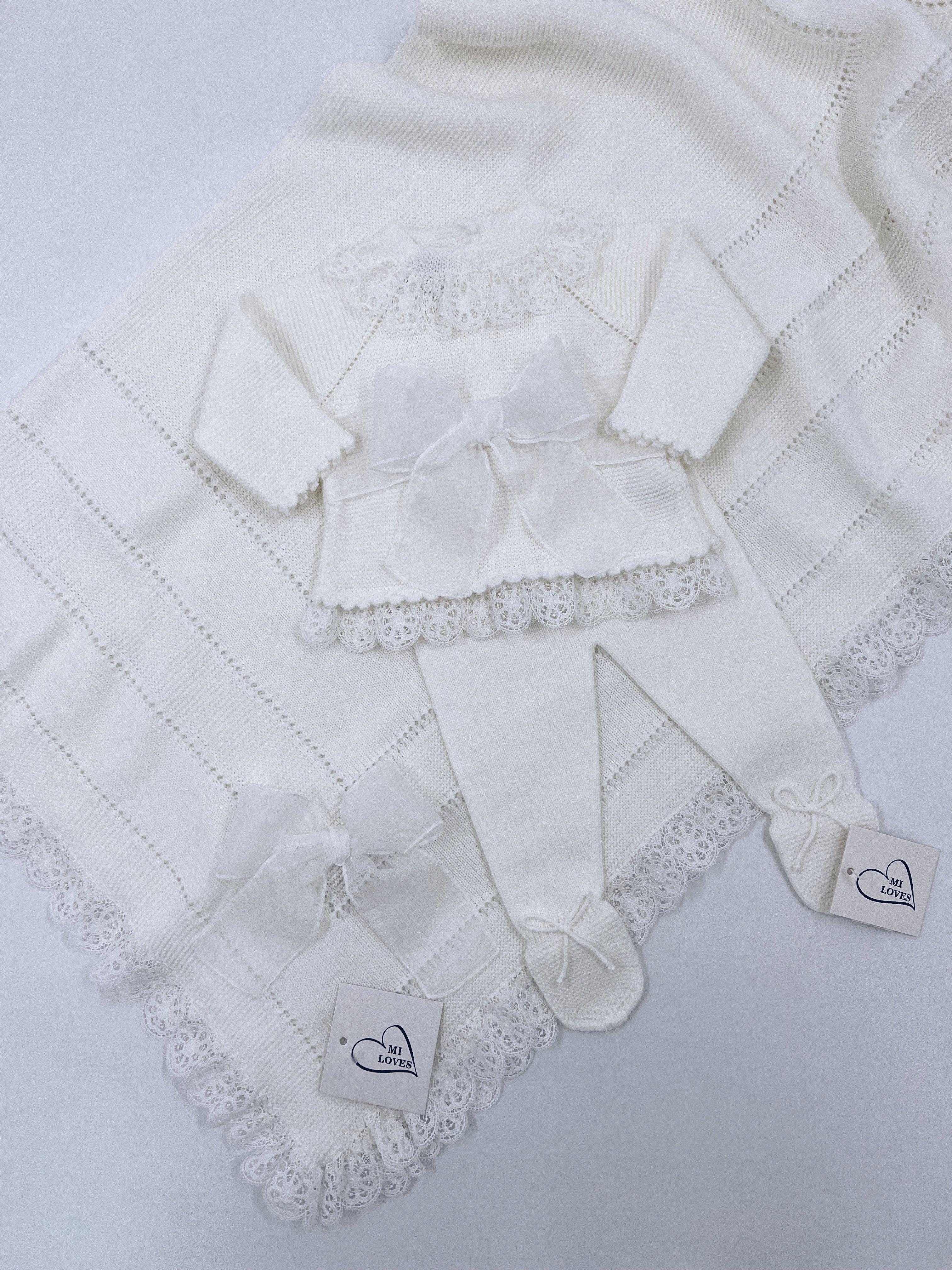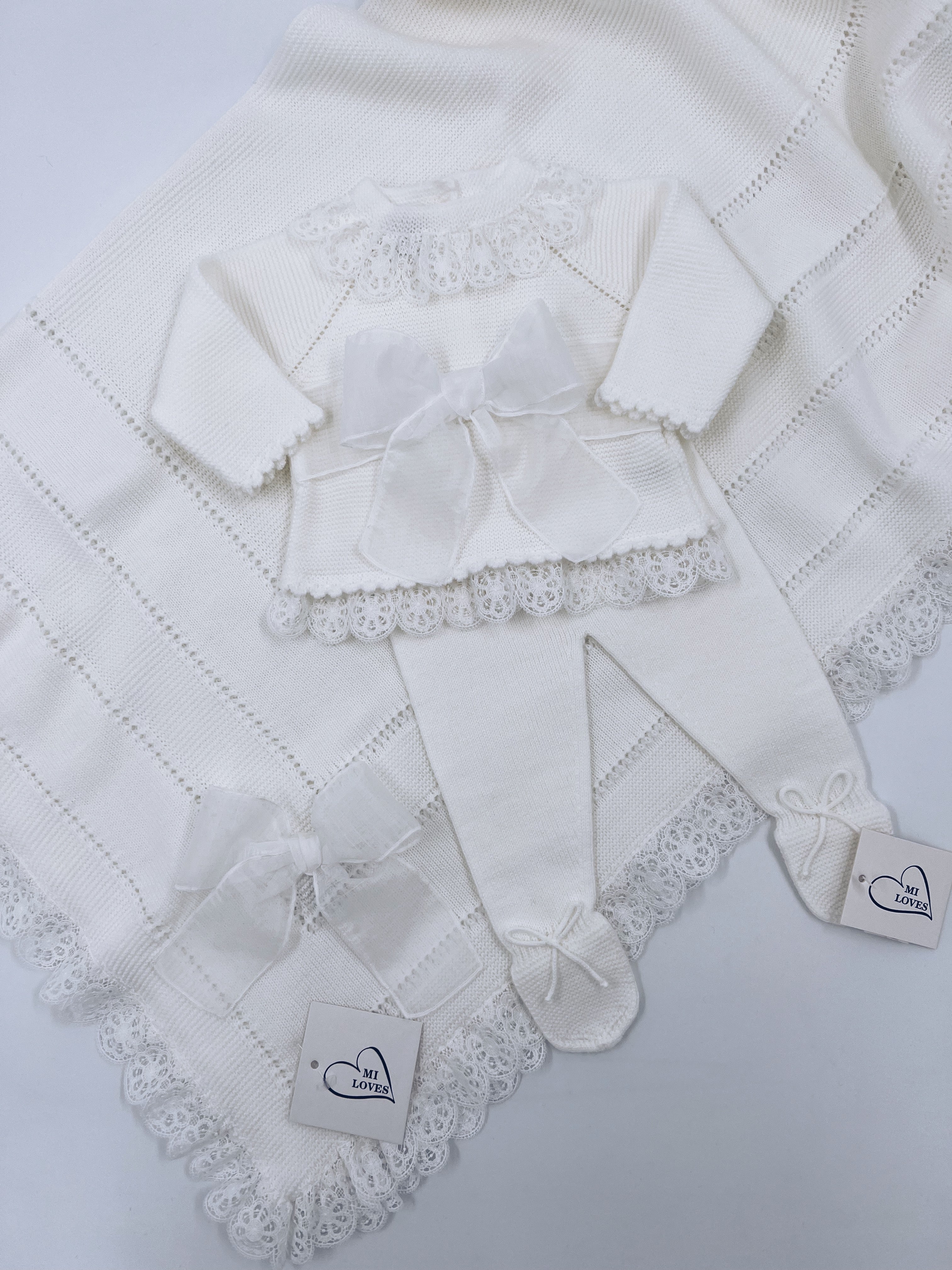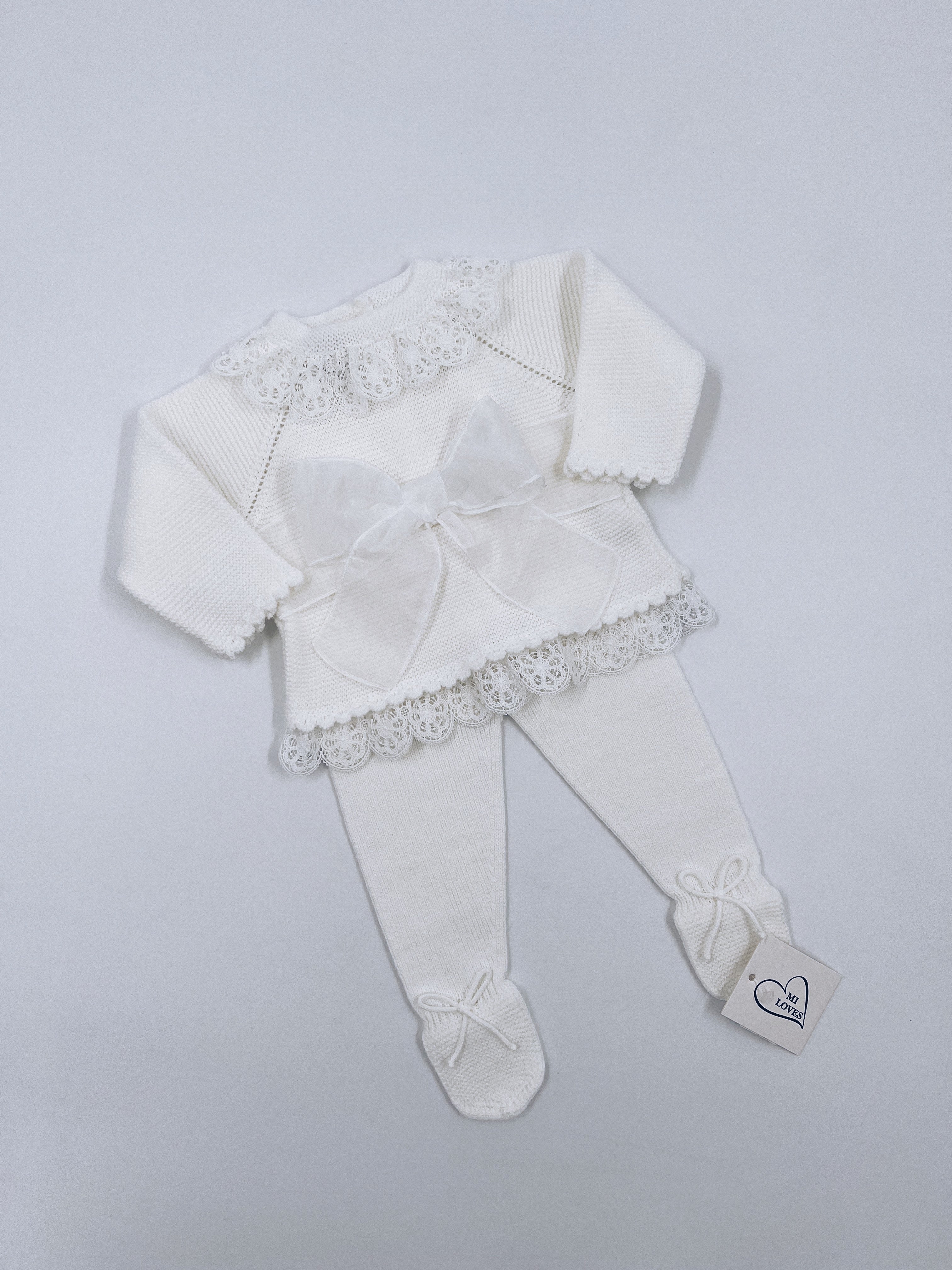 MI LOVES Ivory knitted 2 piece set(top/bottoms)with Beautiful Ivory Bow and Lace details.