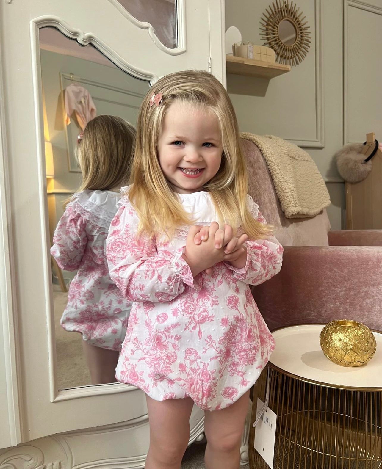 Beautiful Baby pink Dress/Bonnet/Bloomers set with frill and smoke details.