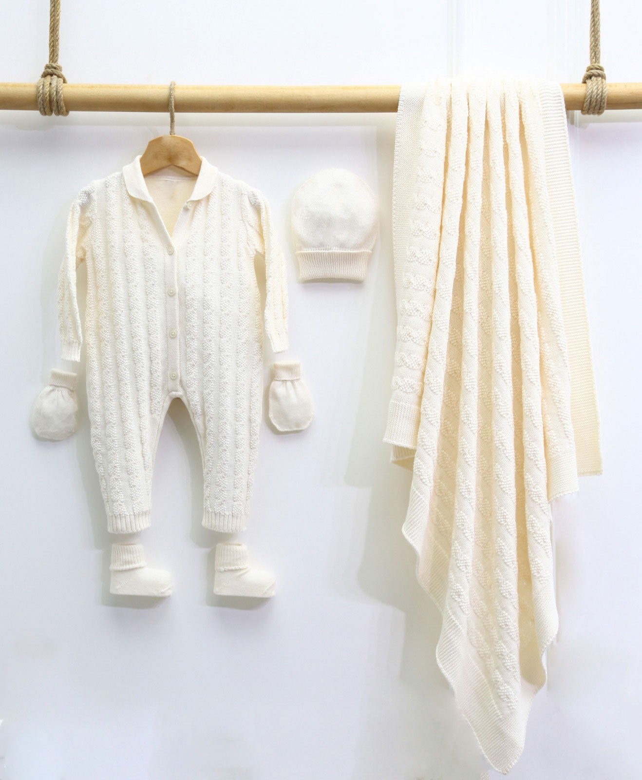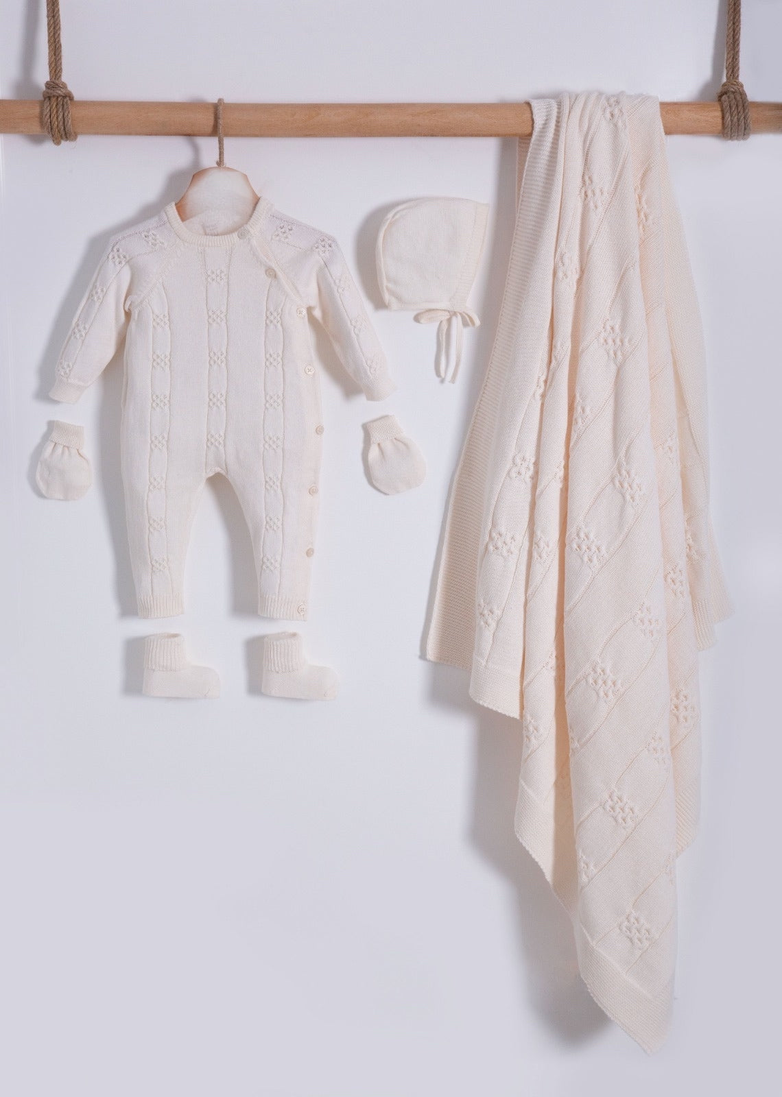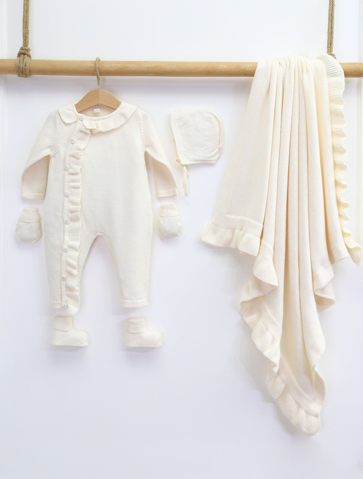 Beautiful Unisex Ivory 5 piece Hospital/Coming home set(including Blanket/Romper/Mittens/Booties/Hat)