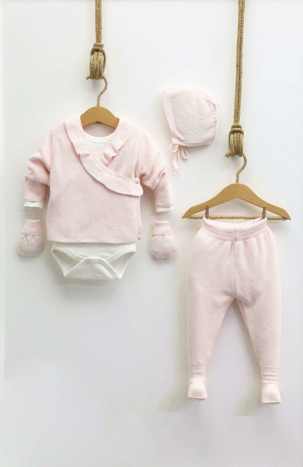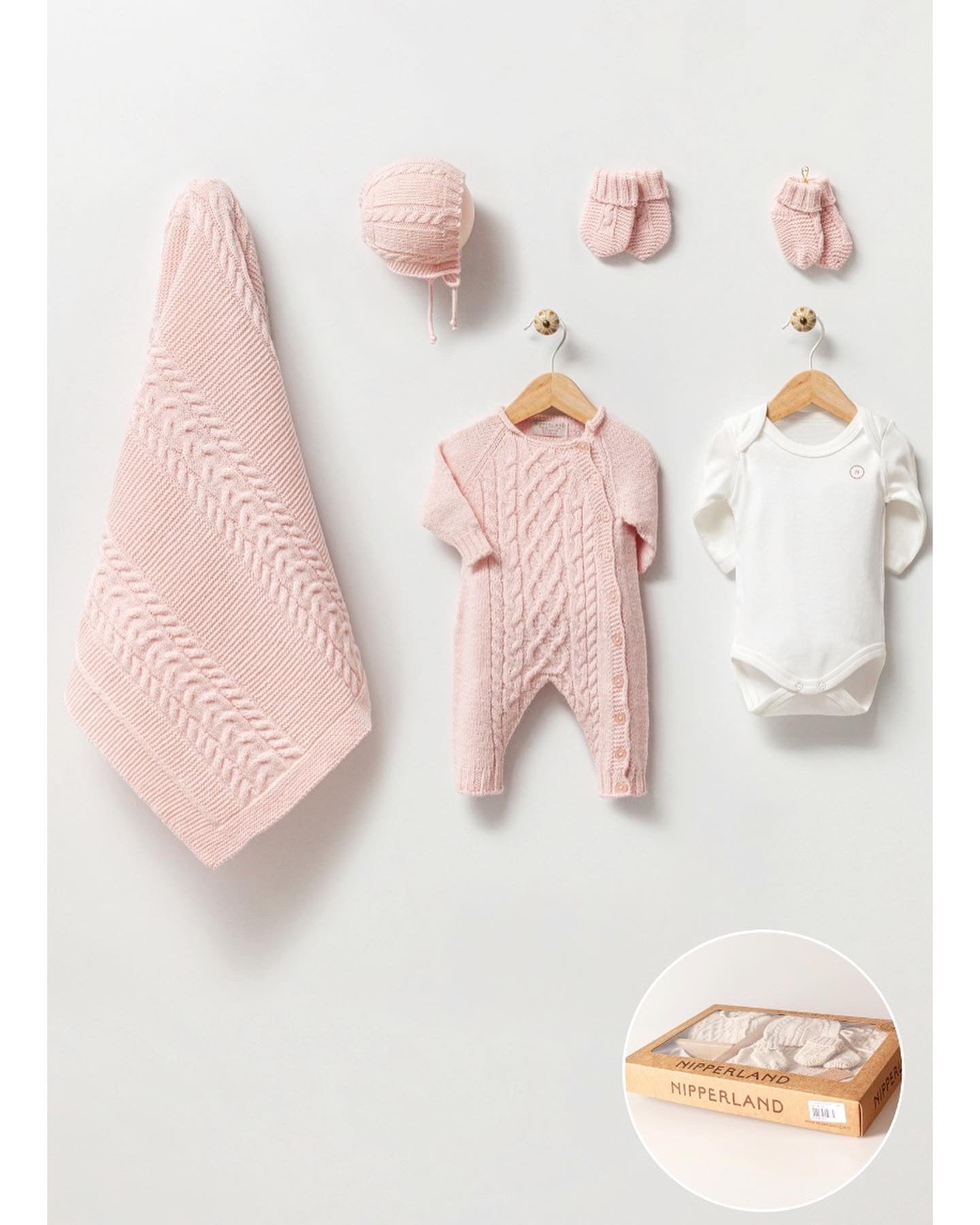 Beautiful Baby Pink Knitted Baby 5 piece set(Jumper/Trousers/Hat/Bodysuit/Mittens)