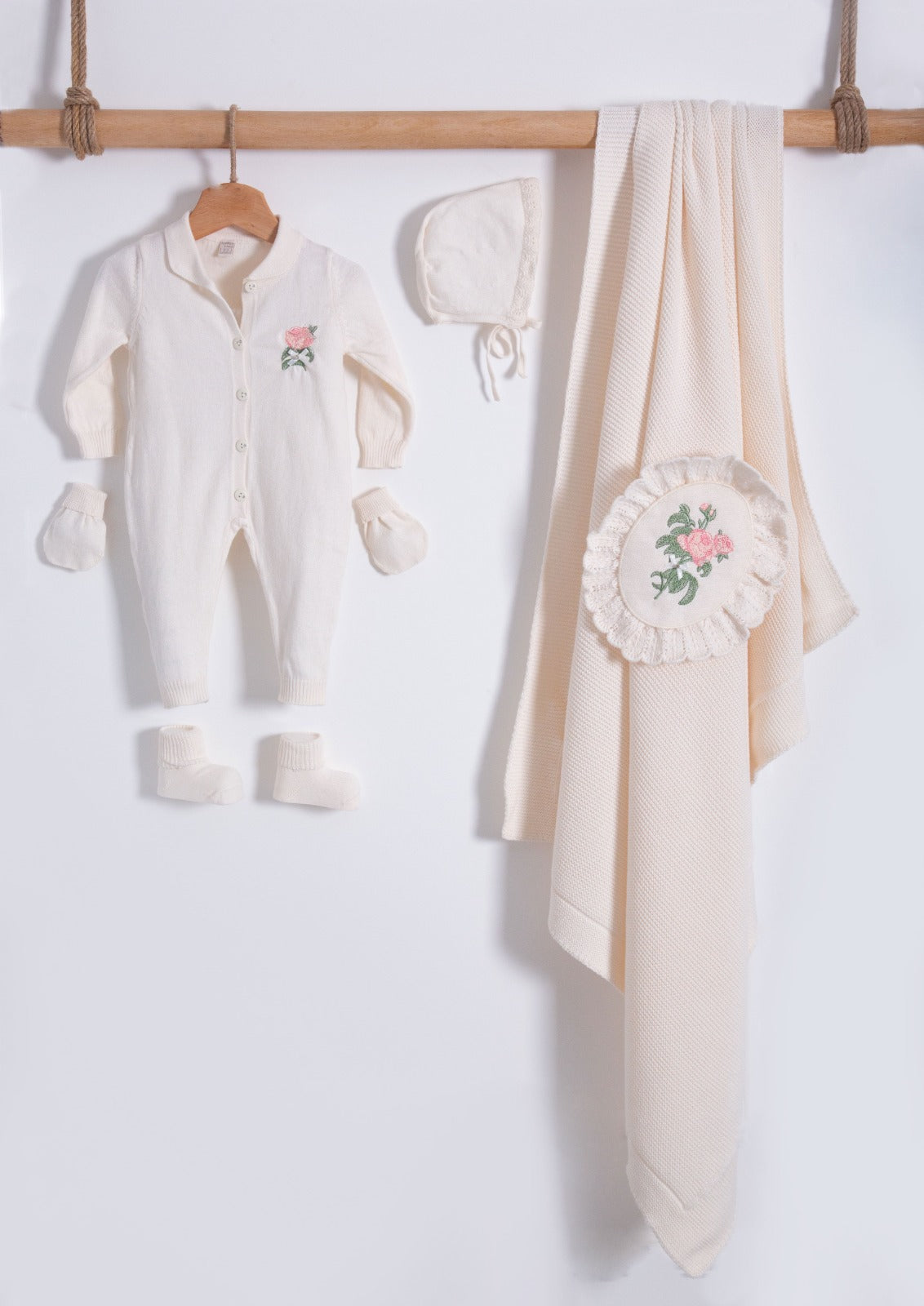 Beautiful Ivory 5 piece Hospital/Coming home set(including Blanket/Romper/Mittens/Booties/Hat)