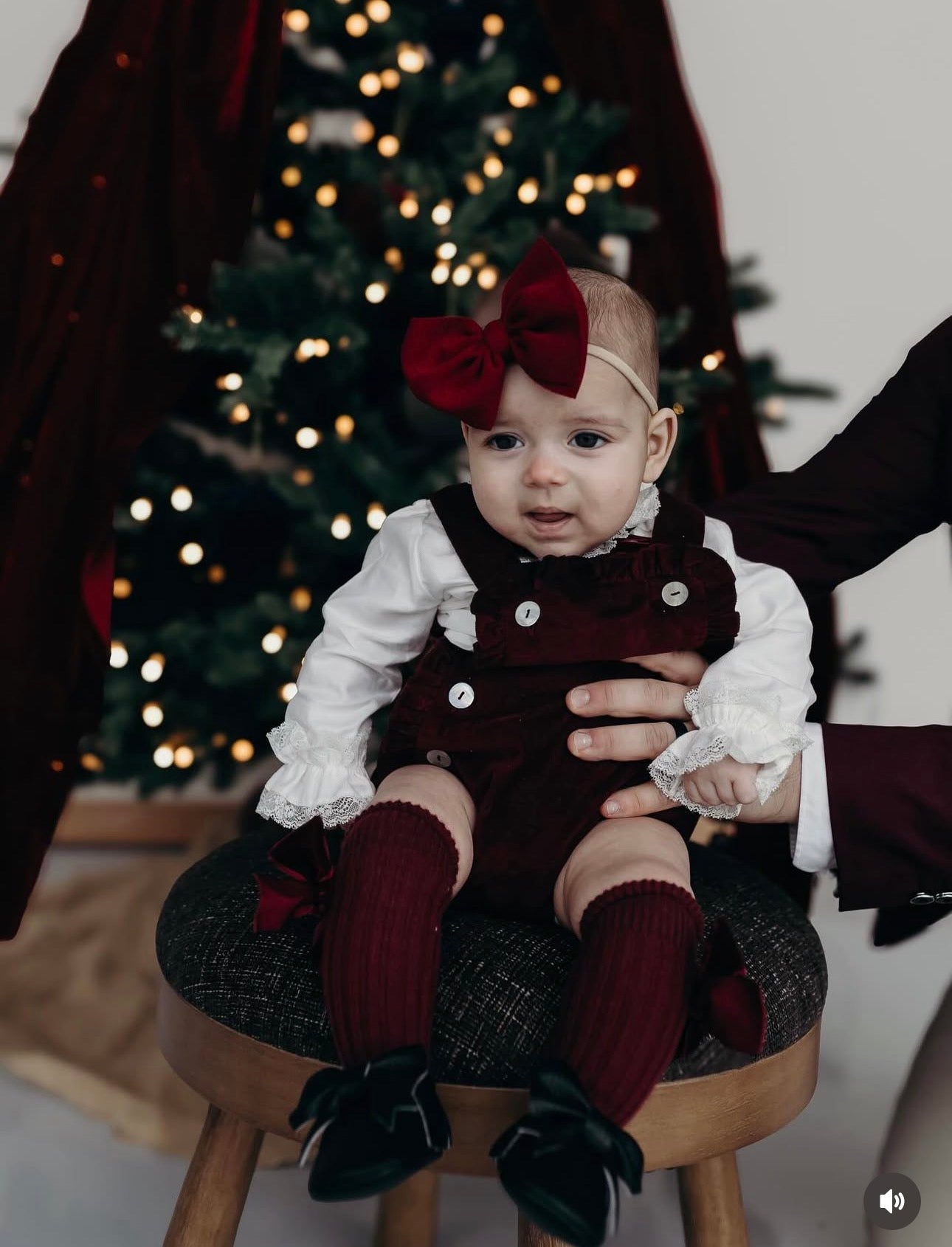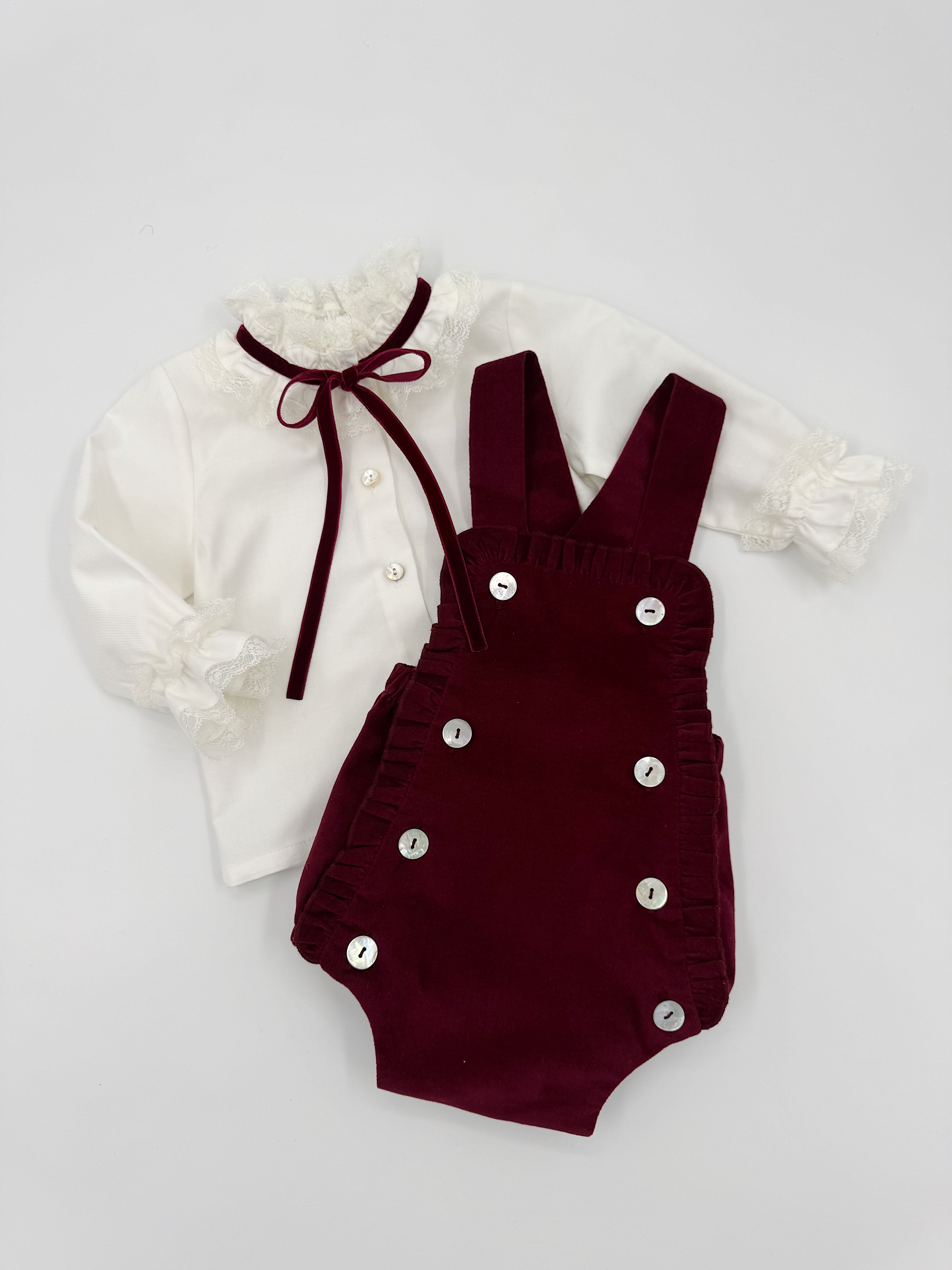 Beautiful Ivory Shirt and Burgundy Velvet Romper 2 piece set.