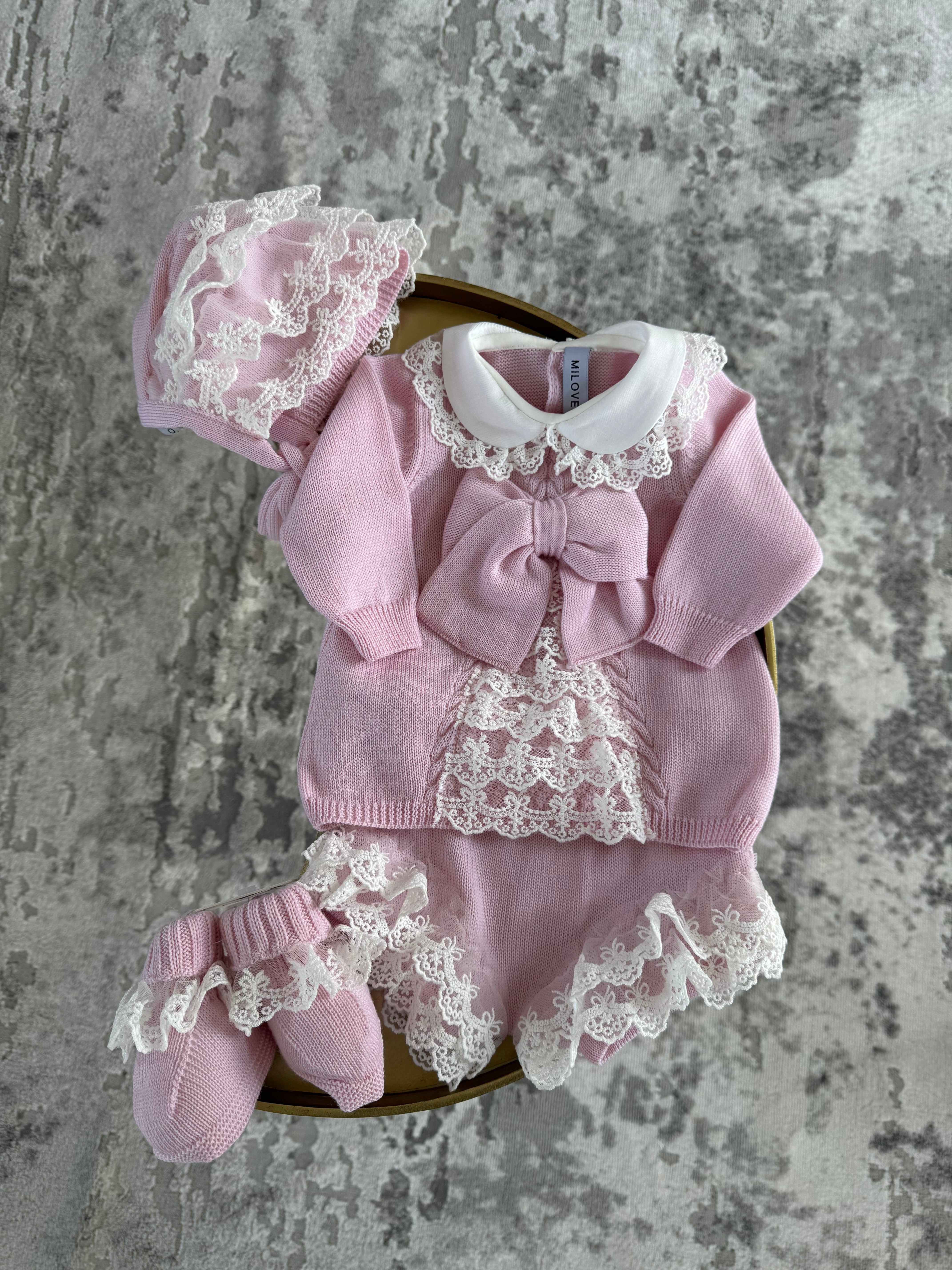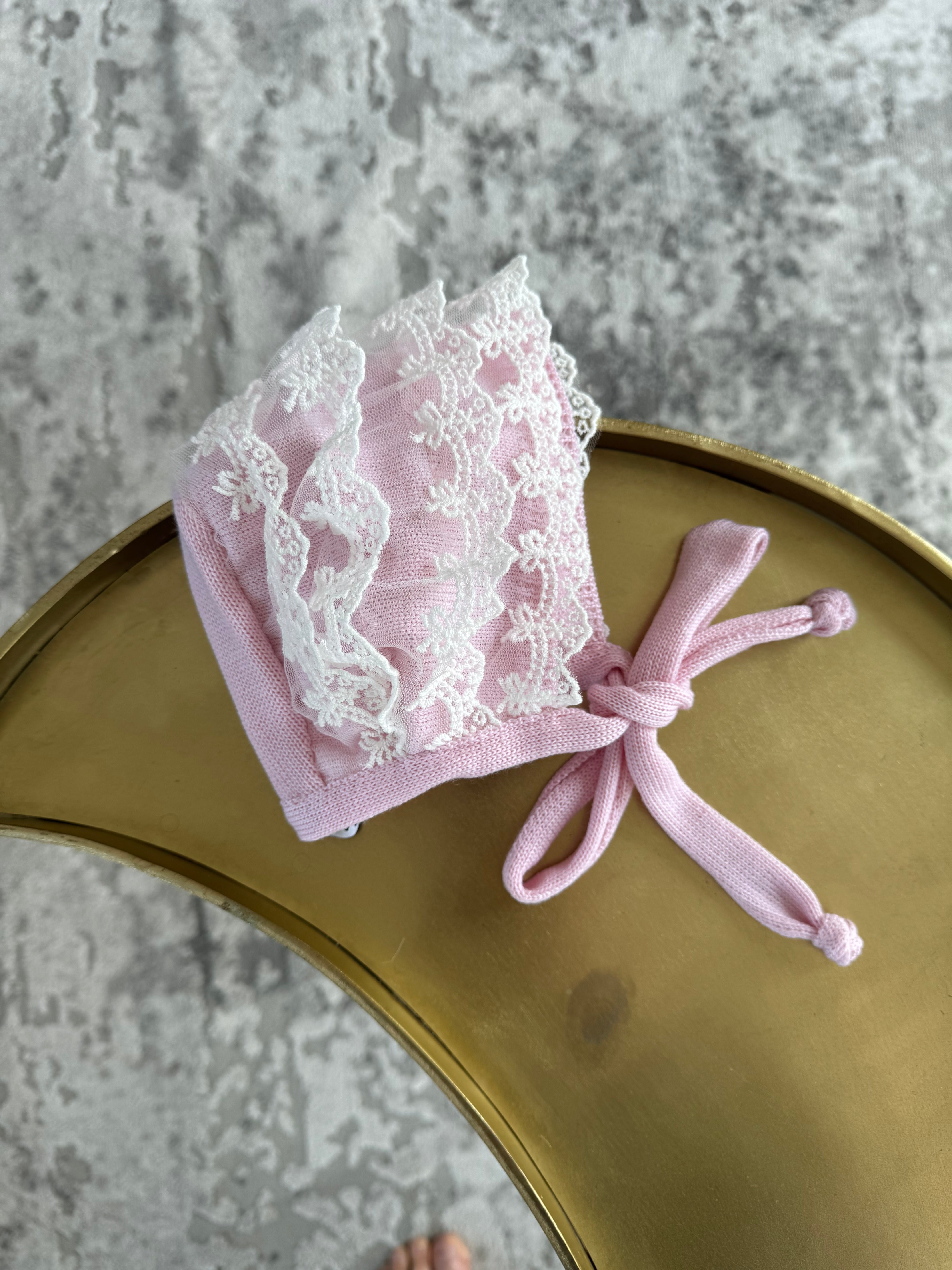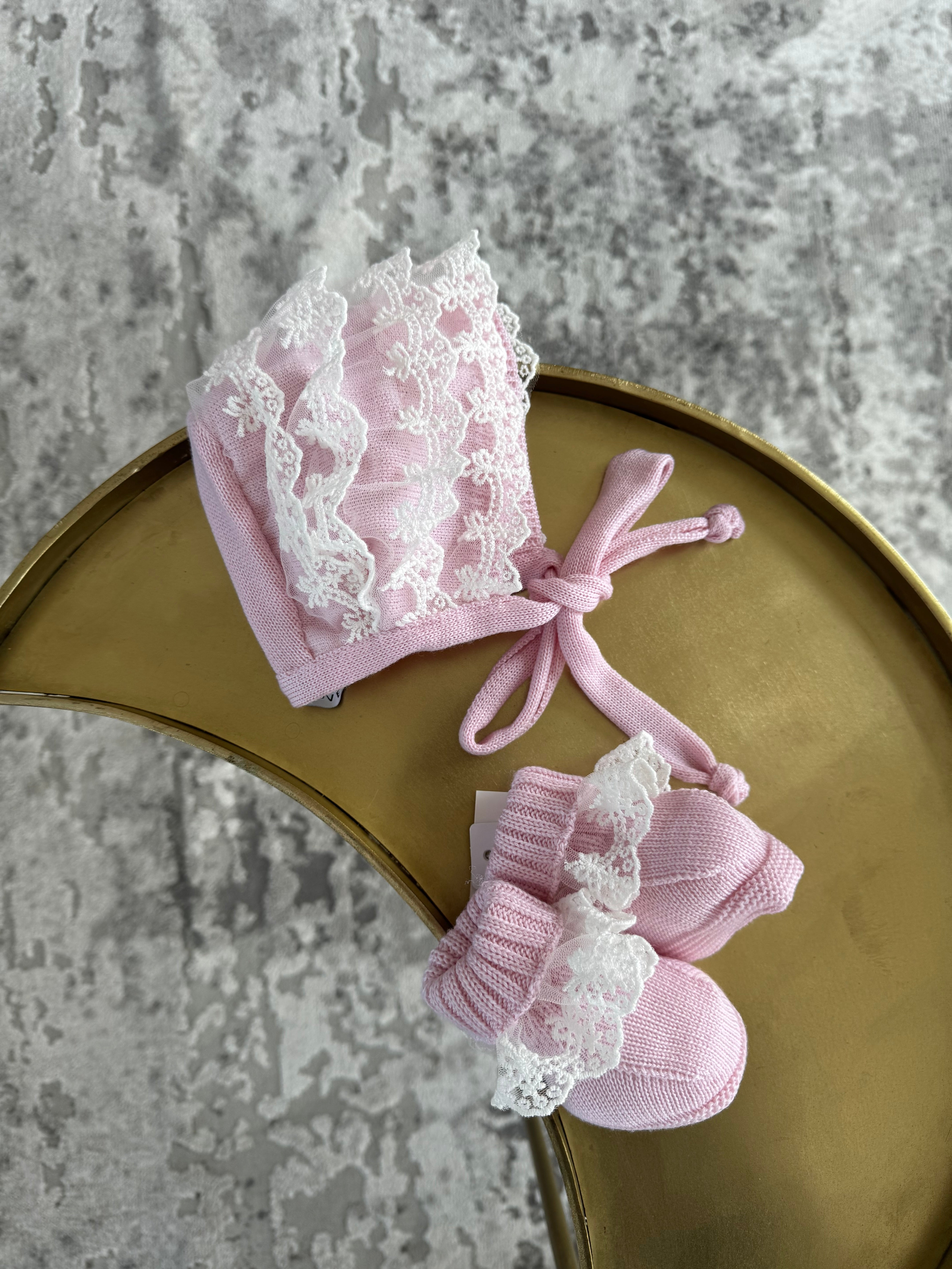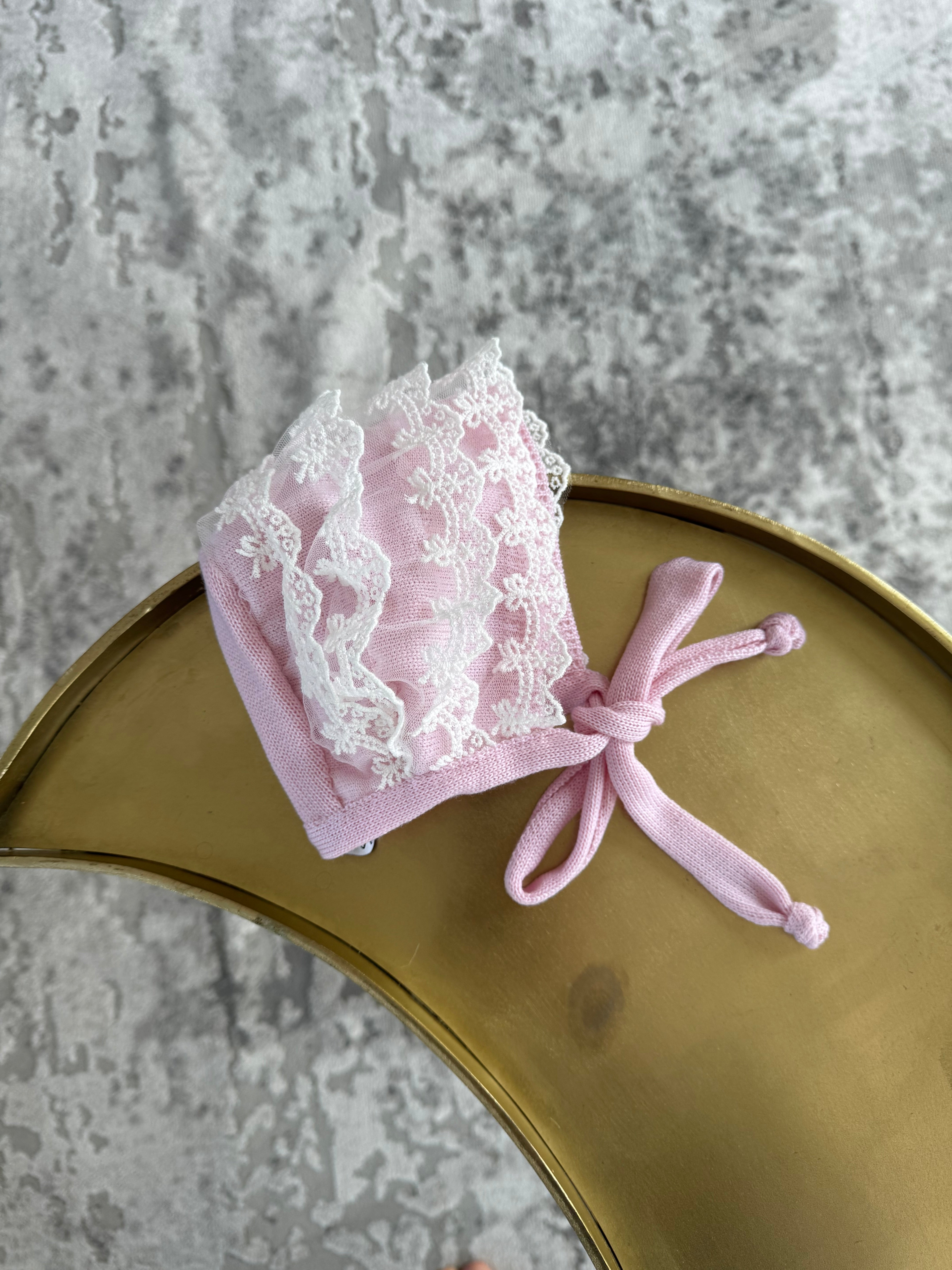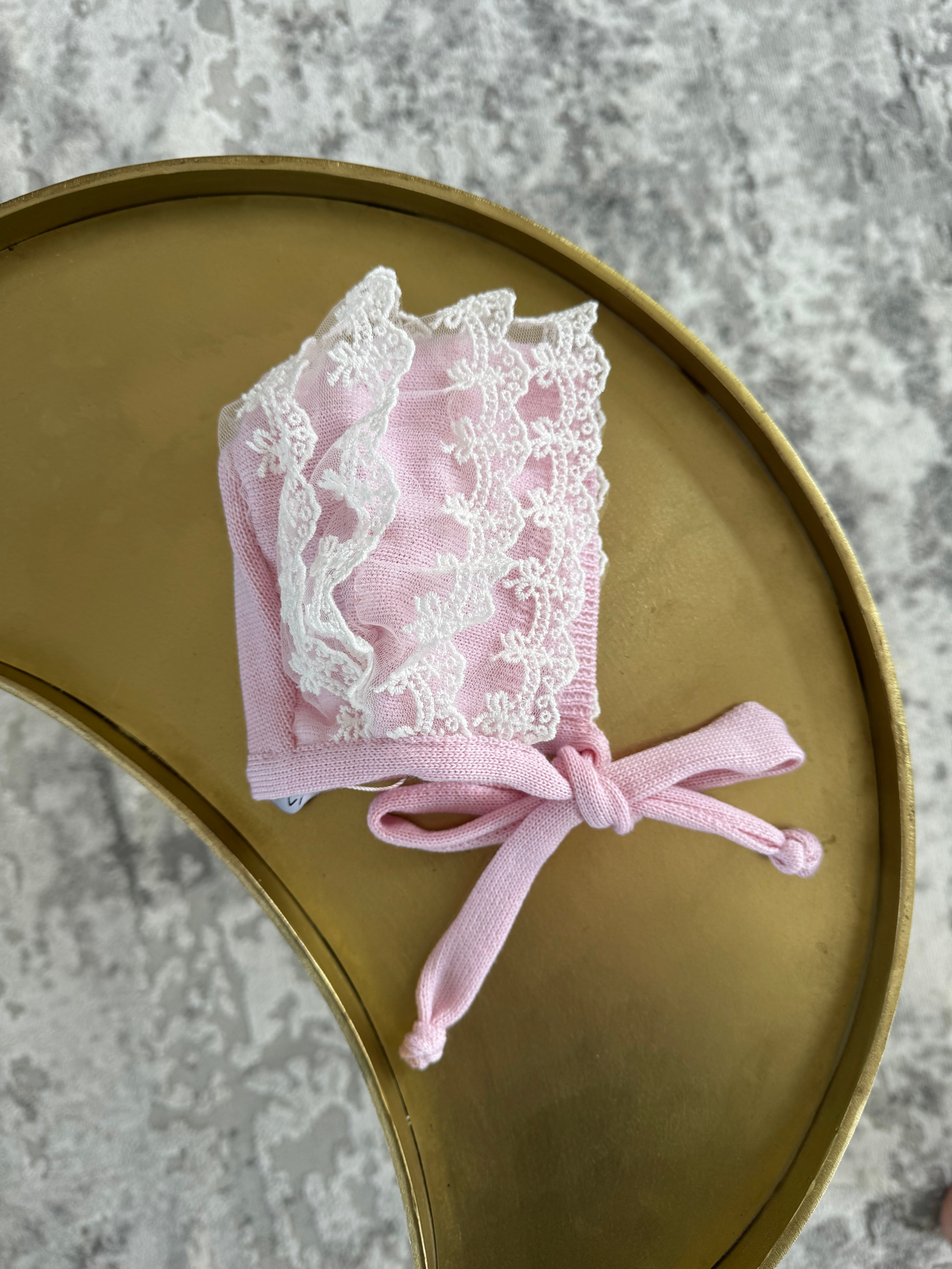 Beautiful knitted Merino wool Baby girl Bonnet with Lace details.
