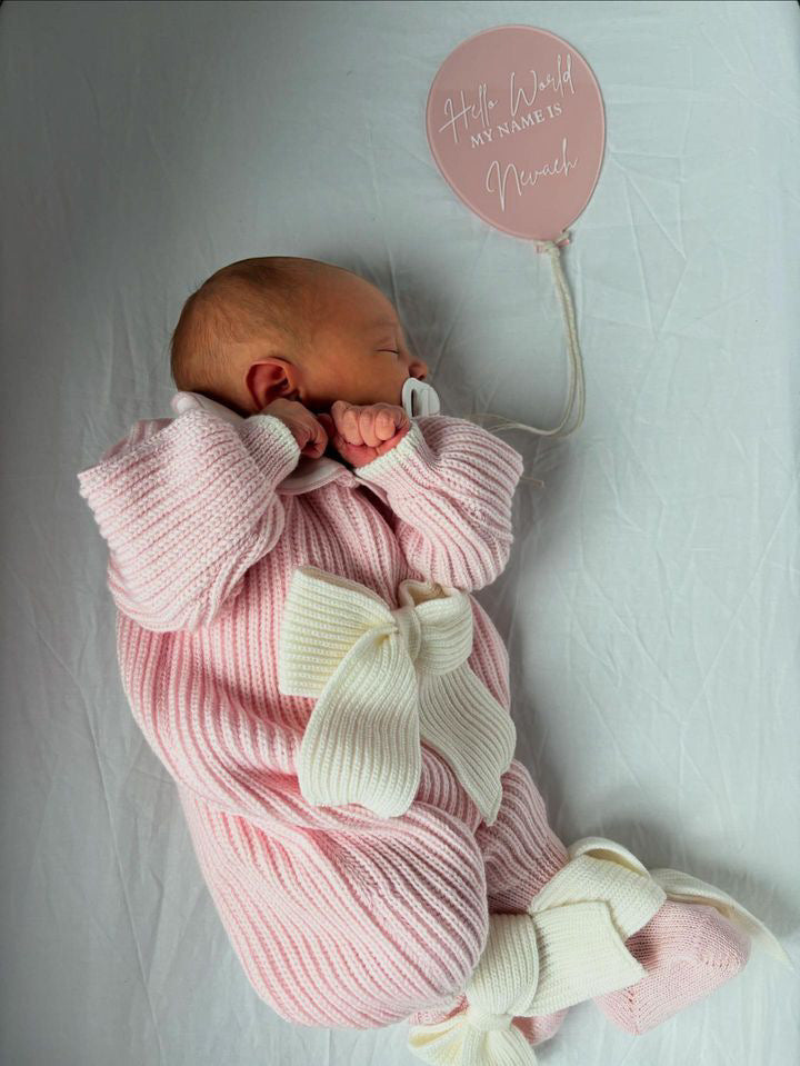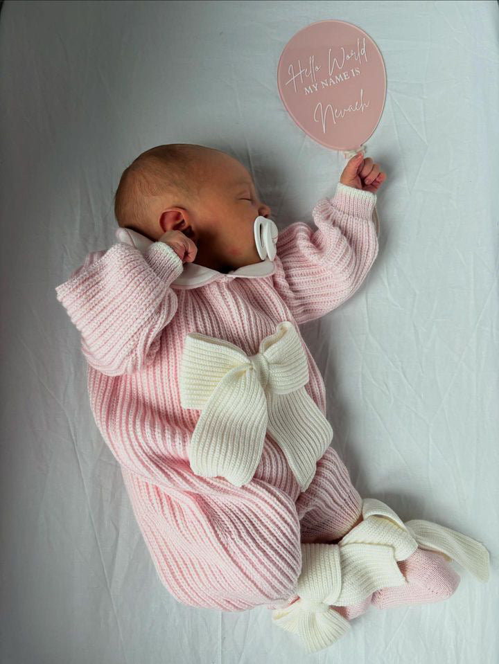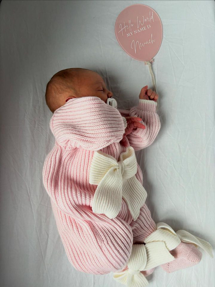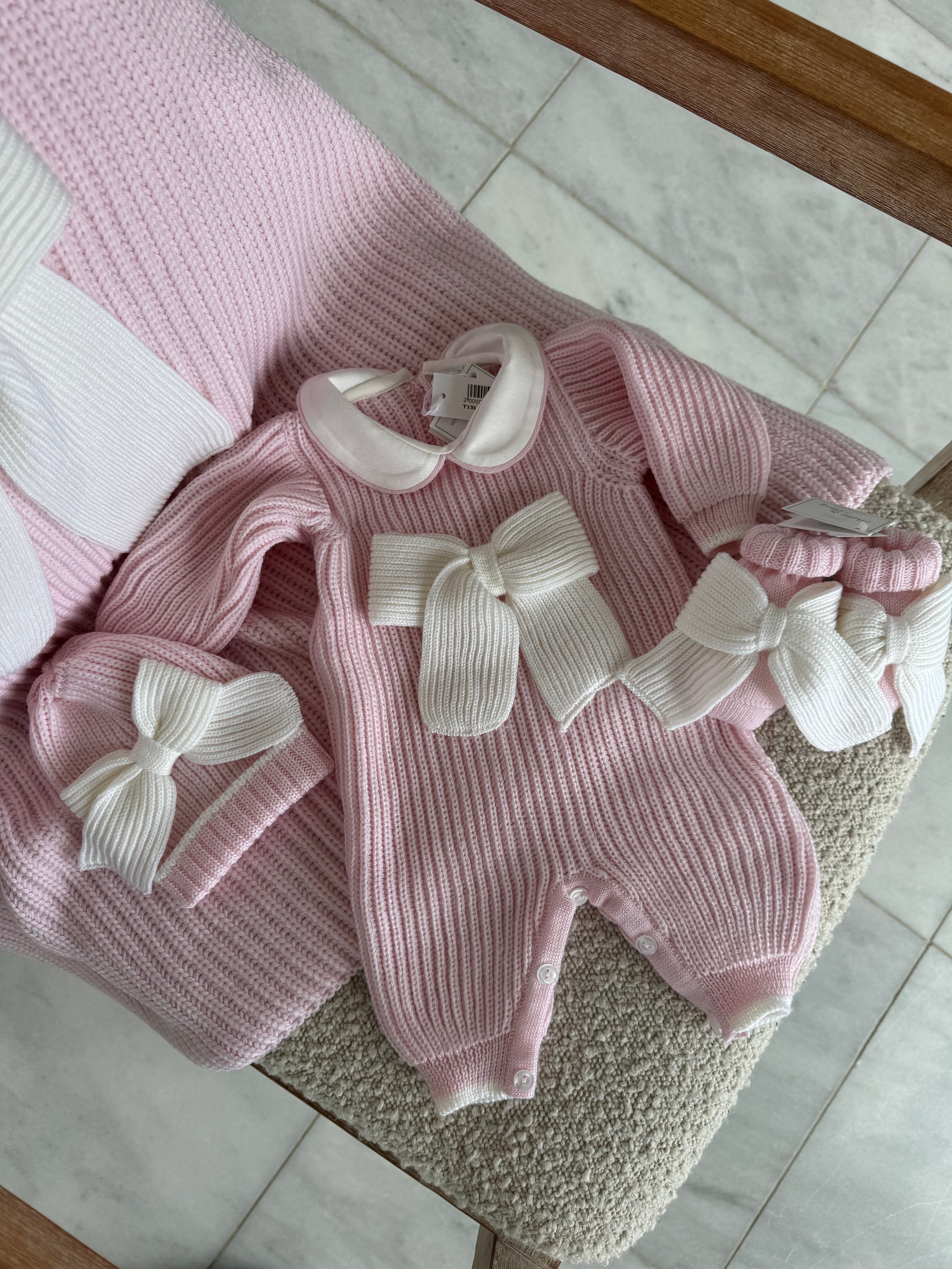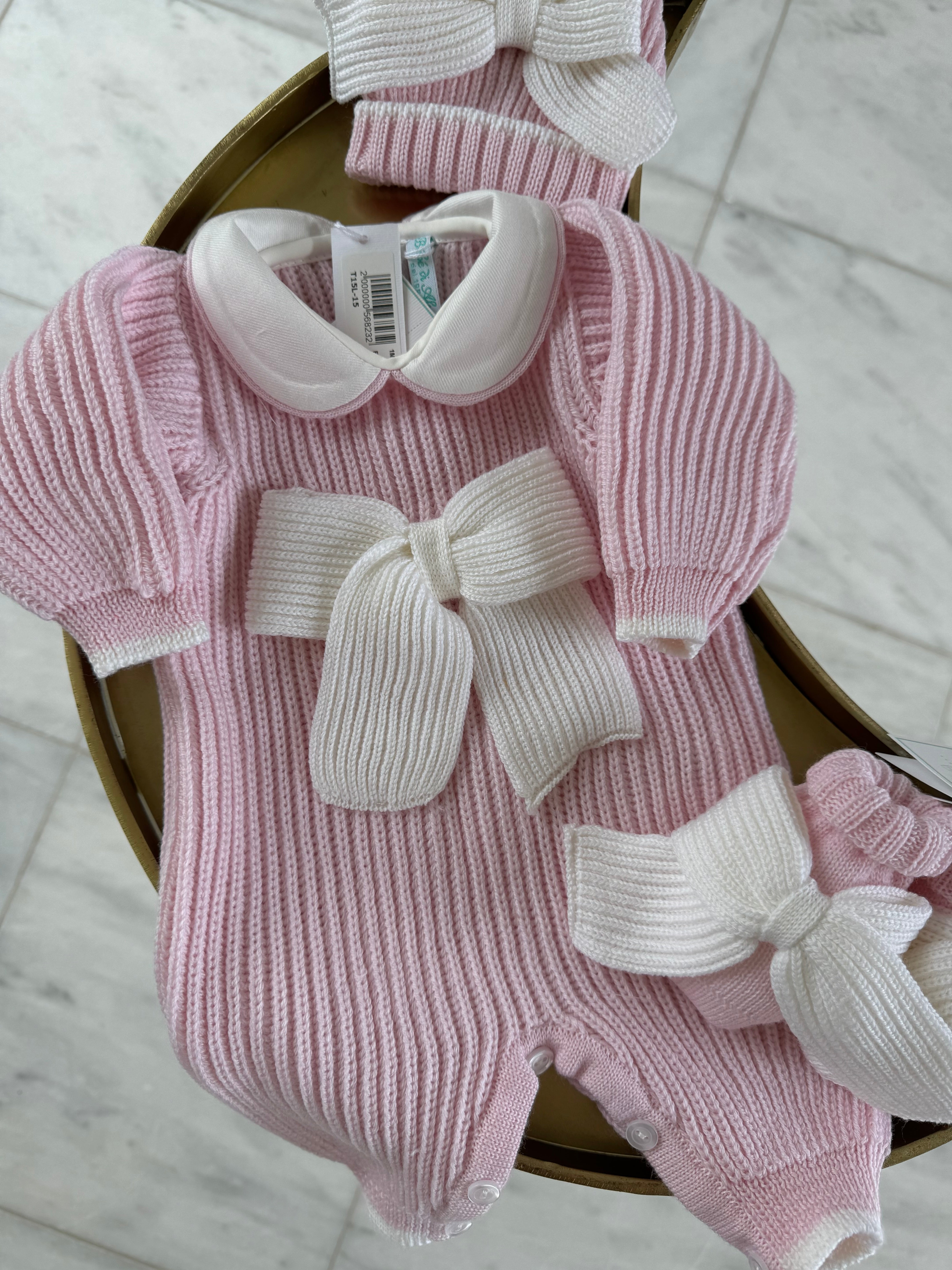 Beautiful knitted Merino Wool Pink Baby Girl Romper with Bow details.