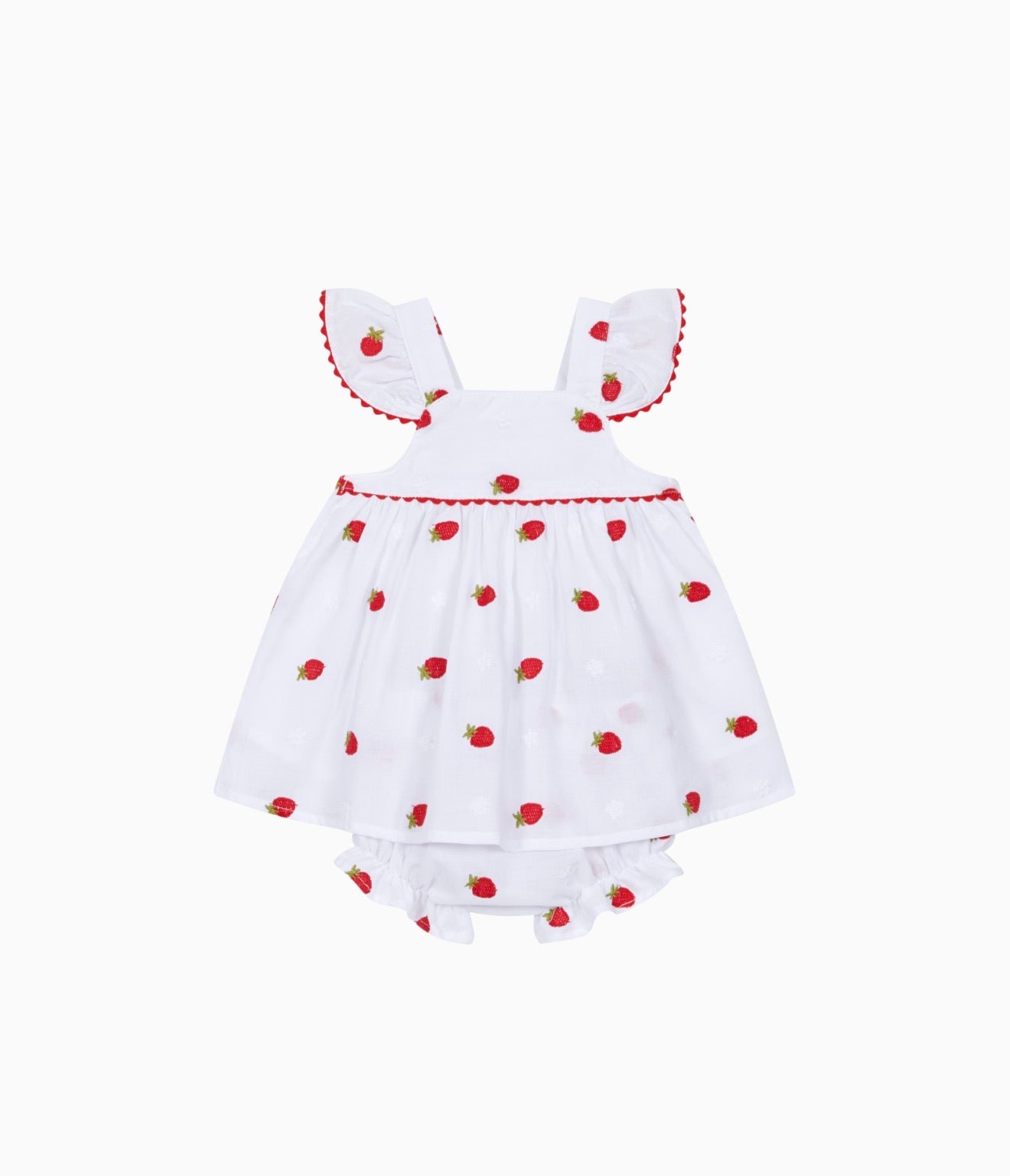 Beautiful White Dress/Bloomers set with strawberry print and frill details