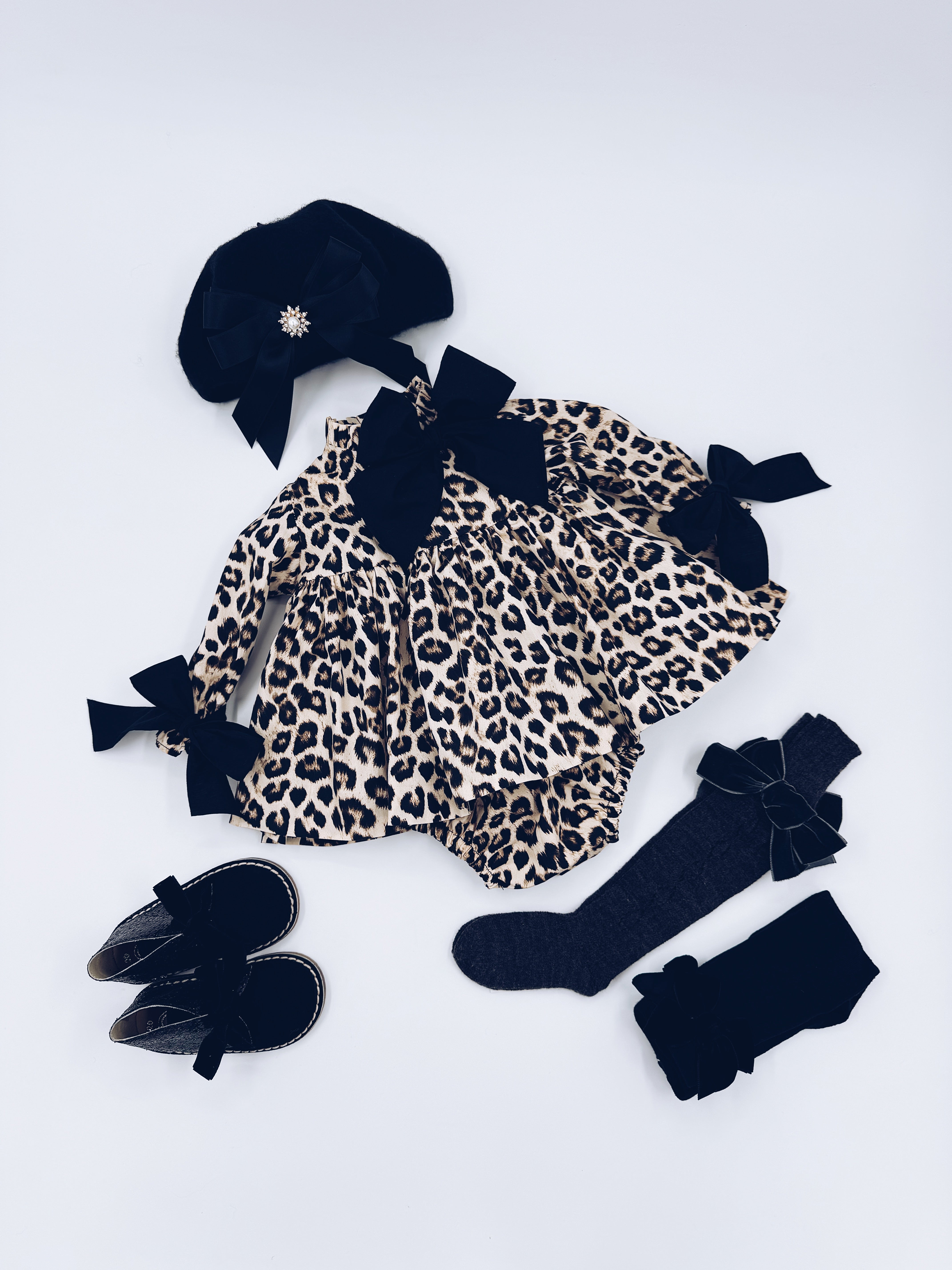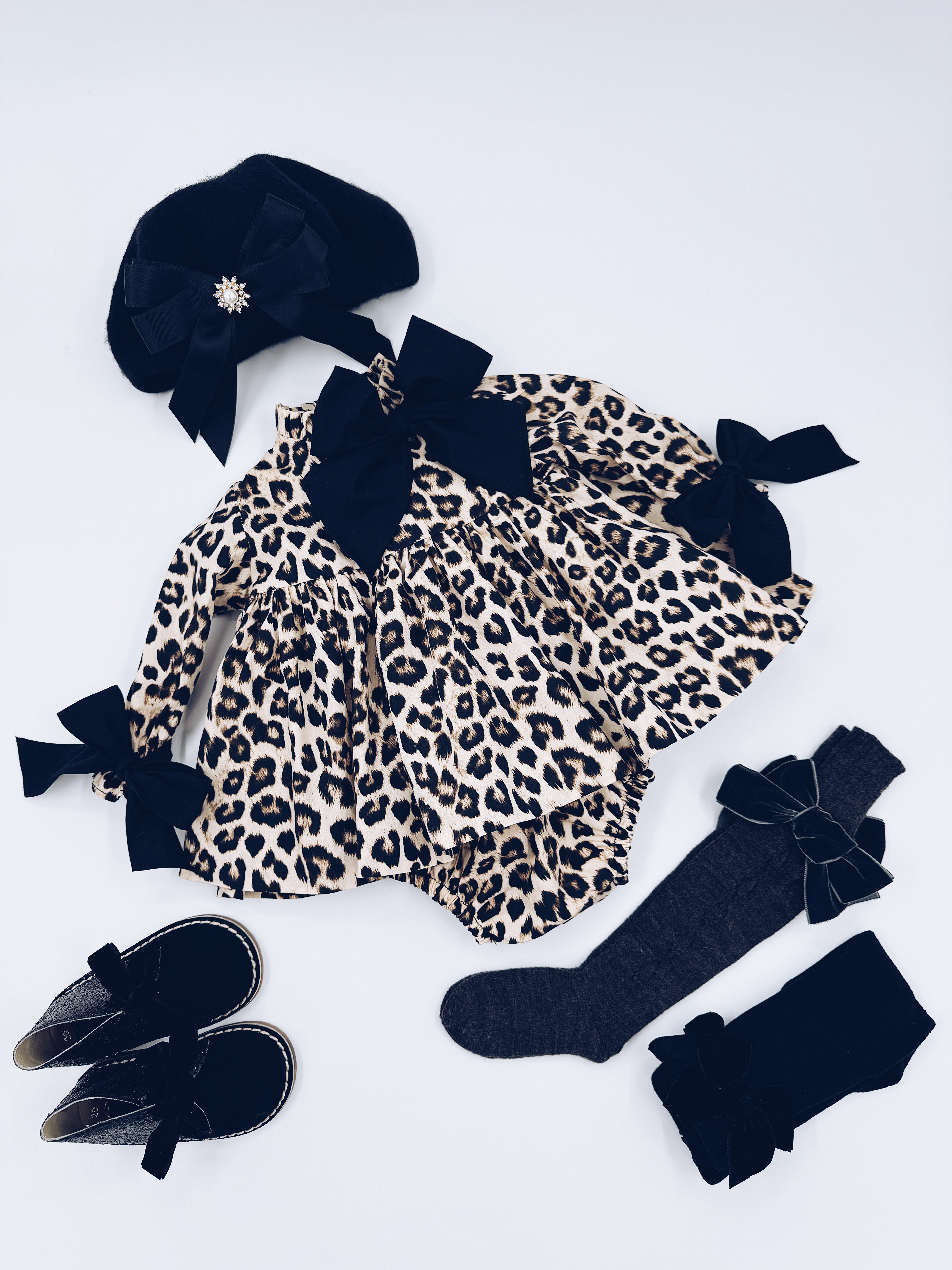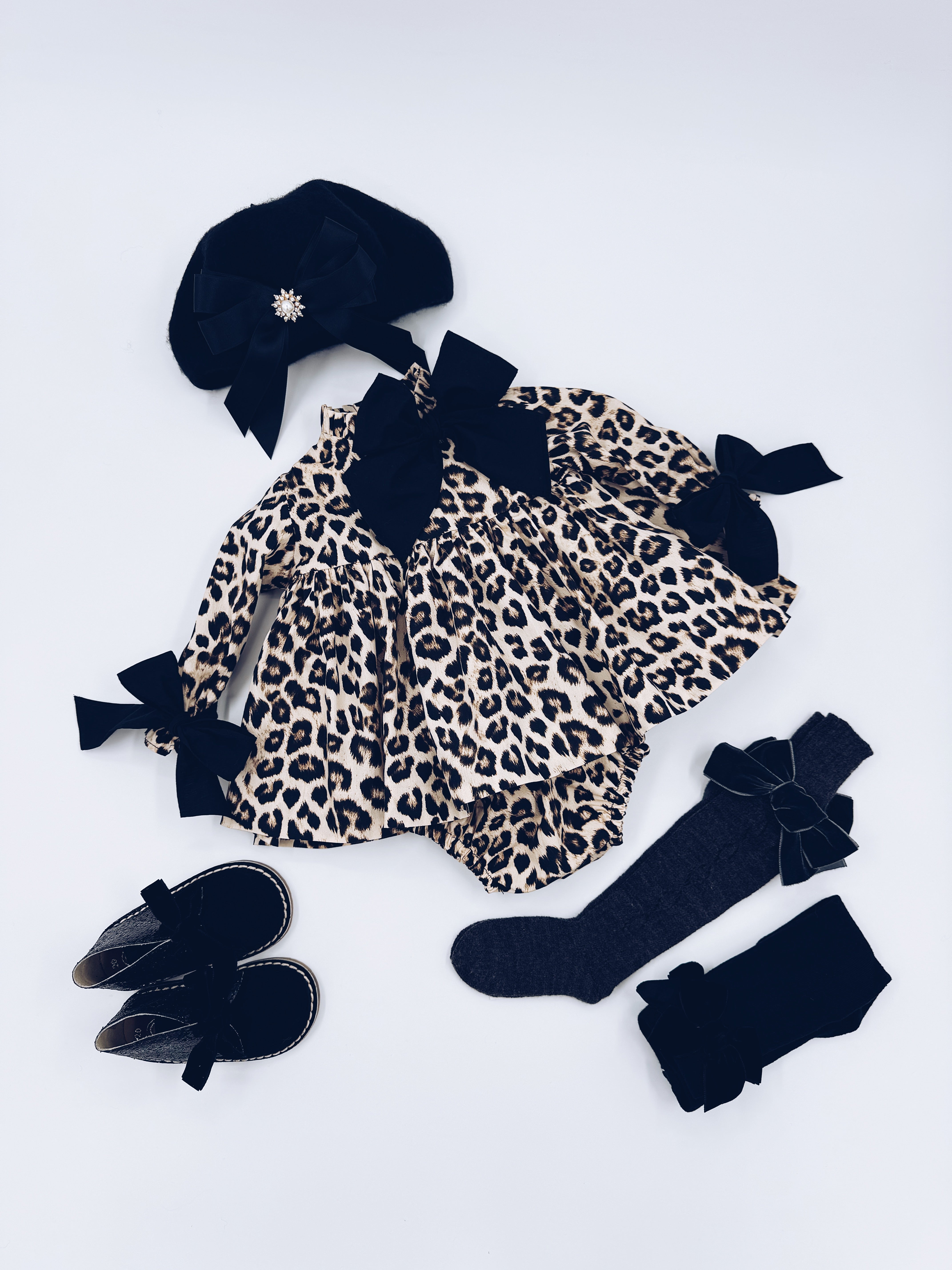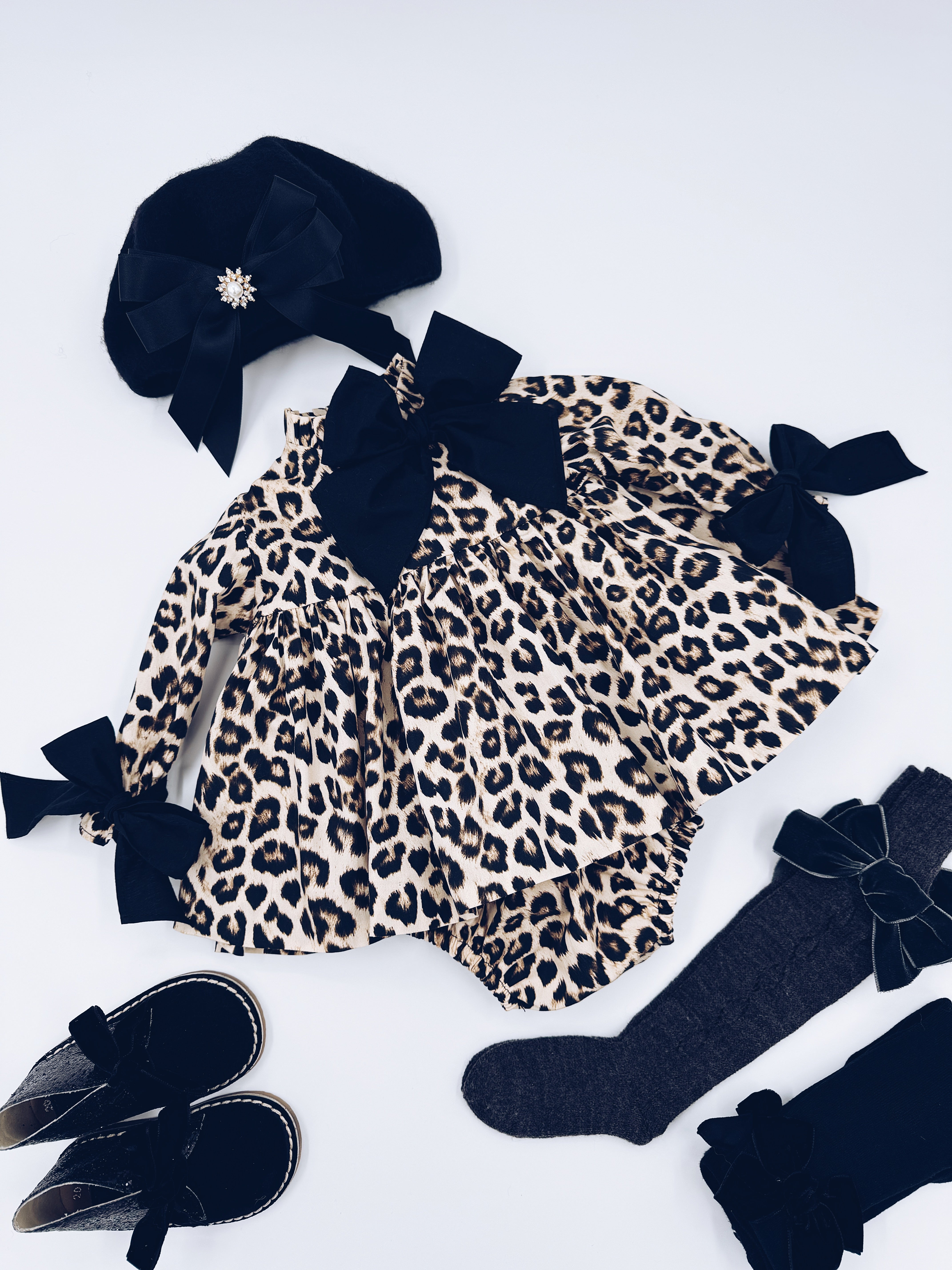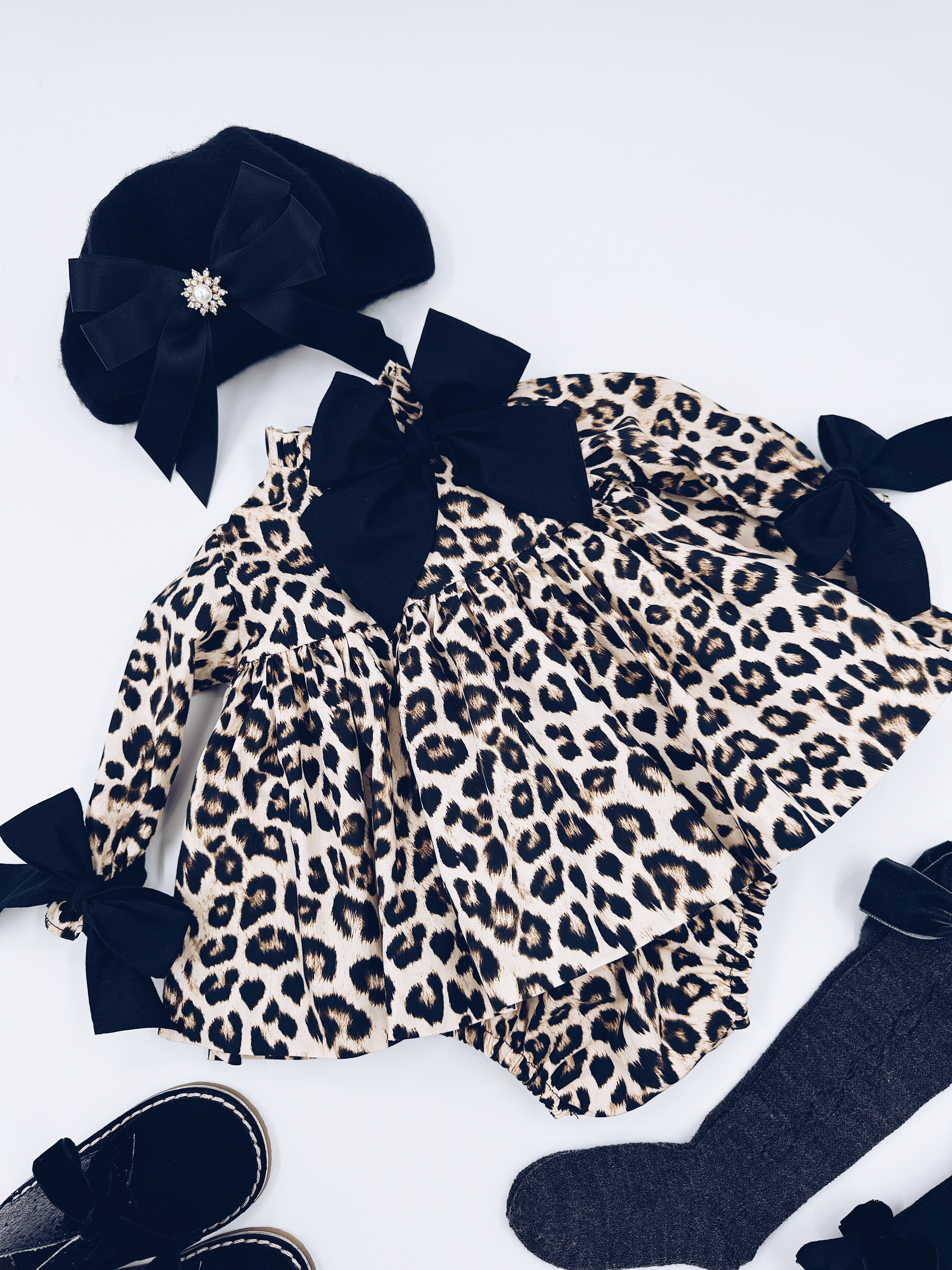 Leopard Dress and bloomers 2 piece set with beautiful black bow details.