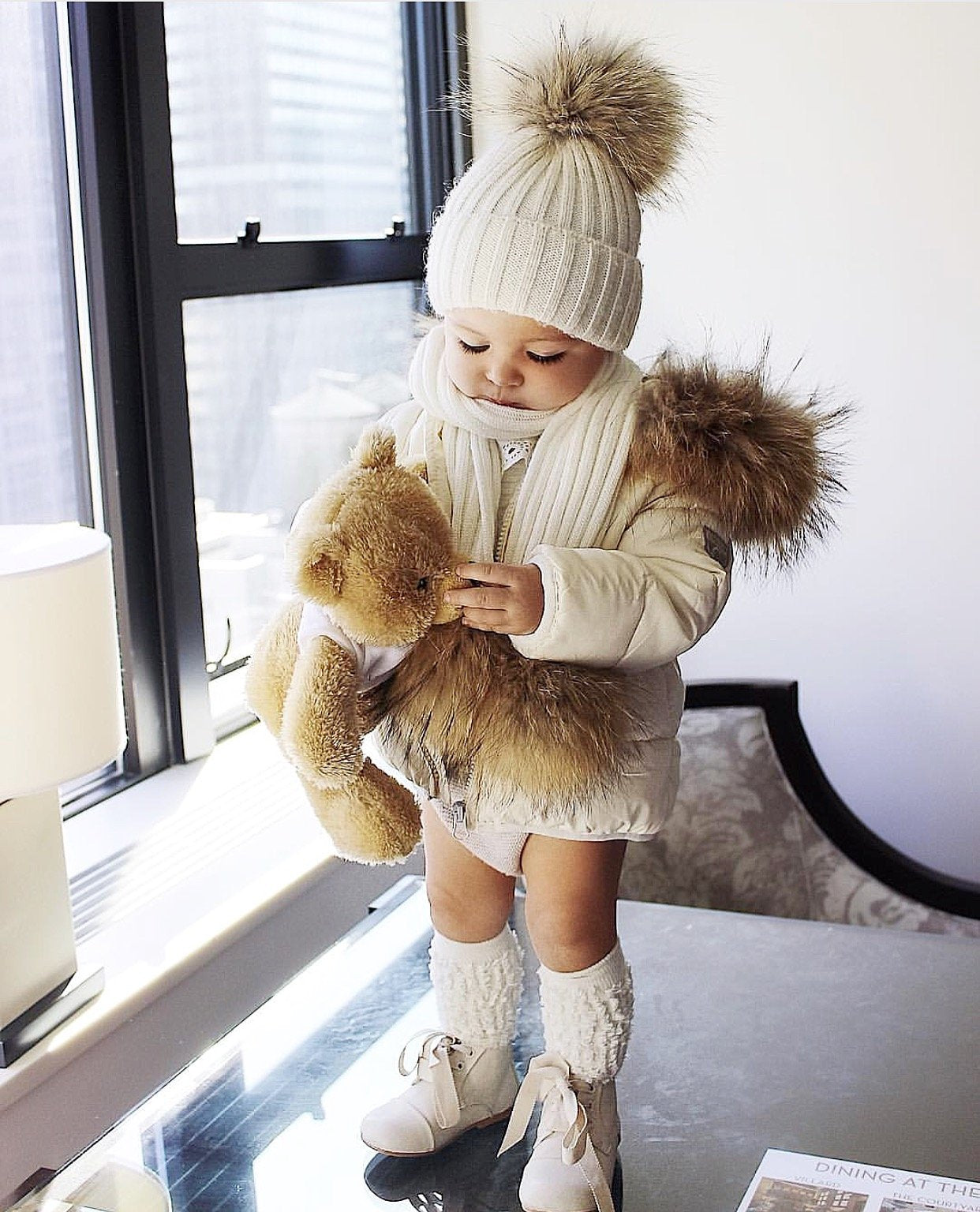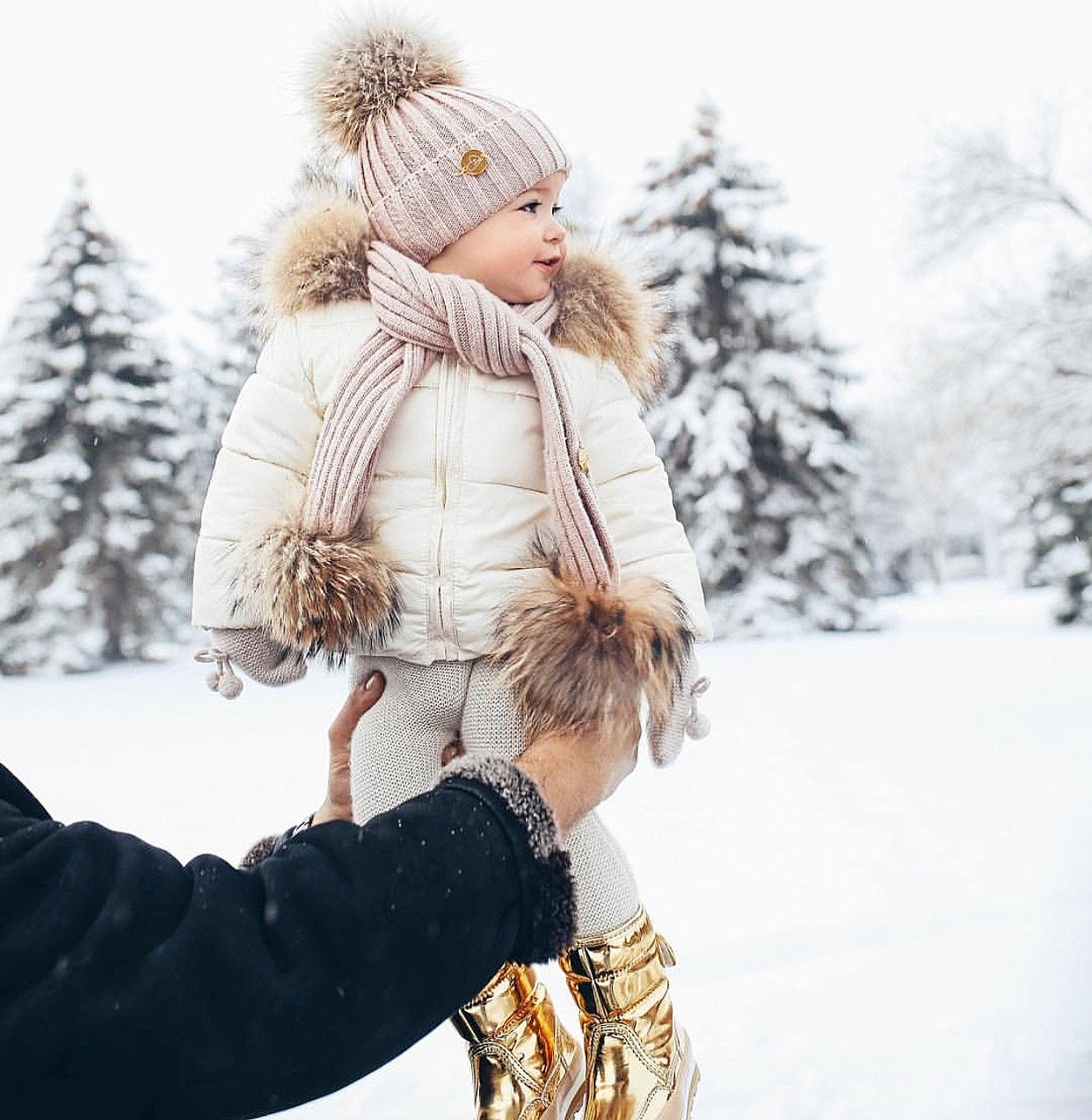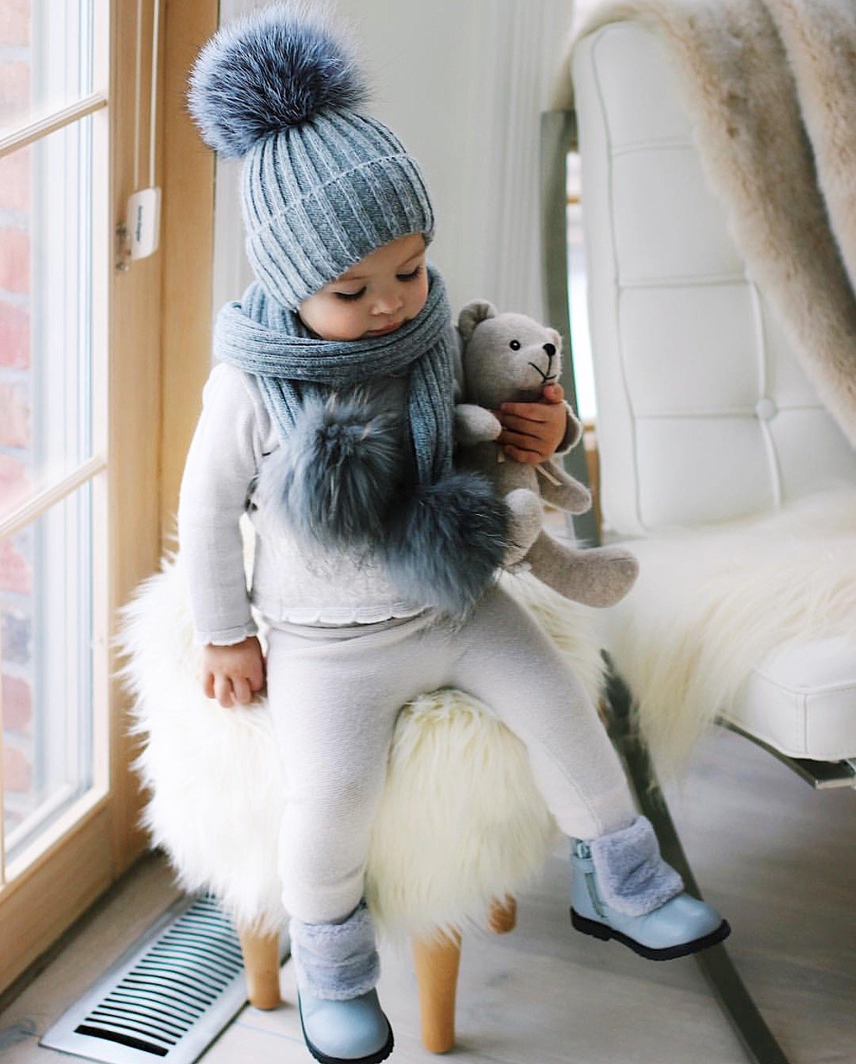MILOVES SIGNATURE CASHMERE COLLECTION Scarf with 2 Racoon fur pom-poms!!Fits from 0-5 years old kids!!